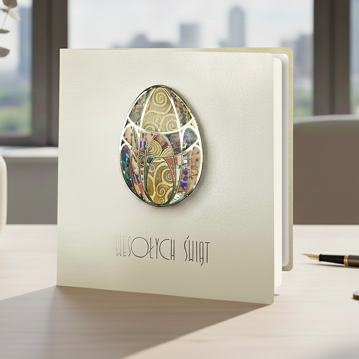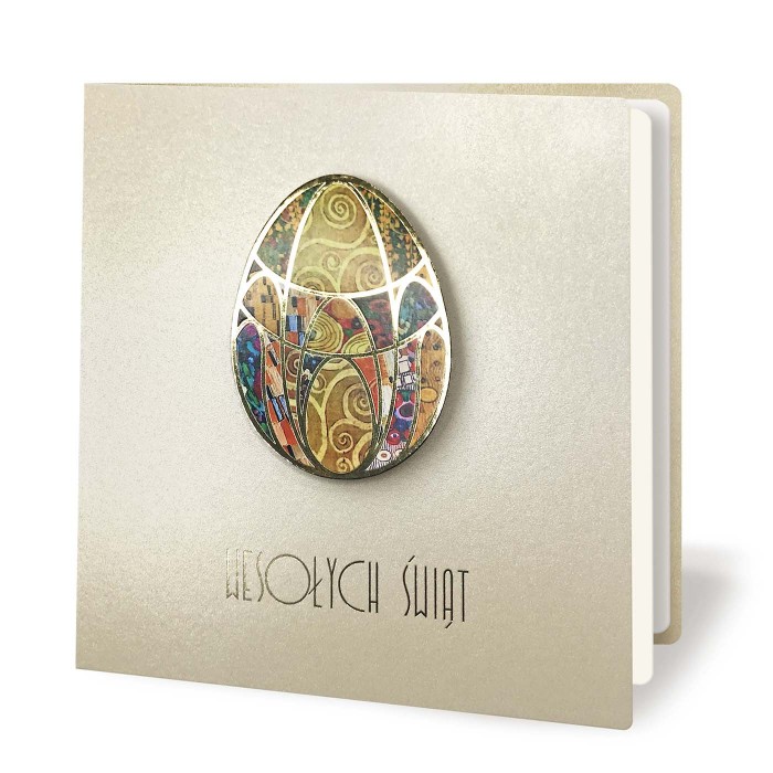 Centralnym elementem projektu jest kolorowa aplikacja w kształcie jajka, nadrukowana i podklejona na dystans, dzięki czemu uzyskano delikatny efekt trójwymiarowości. Złote ramki oraz precyzyjne detale podkreślają dekoracyjny charakter motywu. Całość dopełnia elegancki, złocony napis "Wesołych Świąt", który subtelnie wpisuje się w kompozycję okładki.