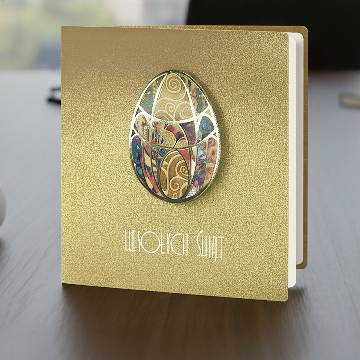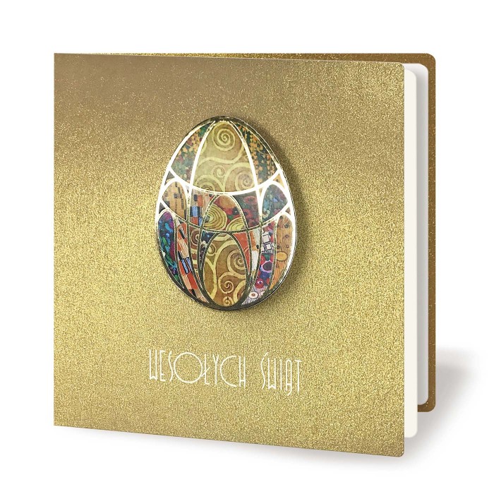 Centralnym elementem okładki jest kolorowa aplikacja w kształcie jajka, nadrukowana i podklejona na dystans, co nadaje jej wyraźnej głębi i trójwymiarowości. Złocony brzeg aplikacji harmonijnie współgra z metalizowanym tłem oraz eleganckim, złoconym napisem "Wesołych Świąt", tworząc spójną i dopracowaną kompozycję. Wnętrze kartki uzupełnia matowa wkładka w kolorze ecru, przeznaczona do nadruku życzeń.