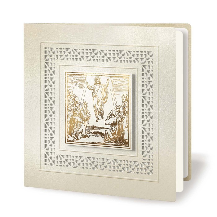 Okładkę wykonano z wysokiej jakości metalizowanego papieru w kolorze ecru, który subtelnie odbija światło i nadaje całości szlachetnego wyglądu. W centralnej części znajduje się złocona aplikacja z motywem religijnym Zmartwychwstania, utrzymana w klasycznej, ilustracyjnej stylistyce. Kompozycję otacza precyzyjnie wycięty laserowo ażurowy wzór oraz delikatnie tłoczona ramka, które budują efekt głębi i eleganckiej przestrzenności.