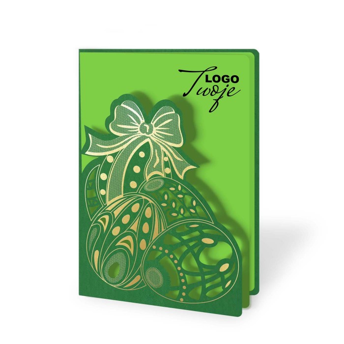 Okładka została wykonana z wysokiej jakości ozdobnego papieru barwionego w masie w zielonym odcieniu. Centralnym elementem kompozycji są pisanki wykonane techniką precyzyjnego cięcia laserowego, dodatkowo uszlachetnione złoceniem, które delikatnie podkreśla wzór i nadaje kartce elegancki charakter. Staranność wykonania i dbałość o detale sprawiają, że kartka prezentuje się wyjątkowo estetycznie.