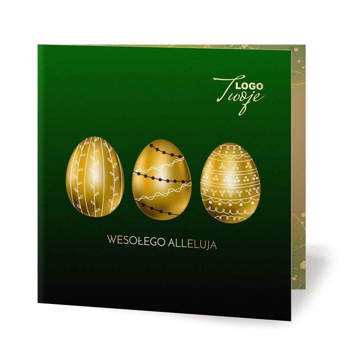 Na okładce znajduje się motyw złotych pisanek, który nadaje kartce świąteczny charakter. Wykorzystany wysokiej jakości druk cyfrowy oferuje efekt błysku jako nadrukowany detal, co stanowi nowoczesną alternatywę dla tradycyjnych złoconych elementów. Kartka jest wykonana z dwustronnie zadrukowanego, sztywnego papieru, co podkreśla jej elegancję i profesjonalizm.