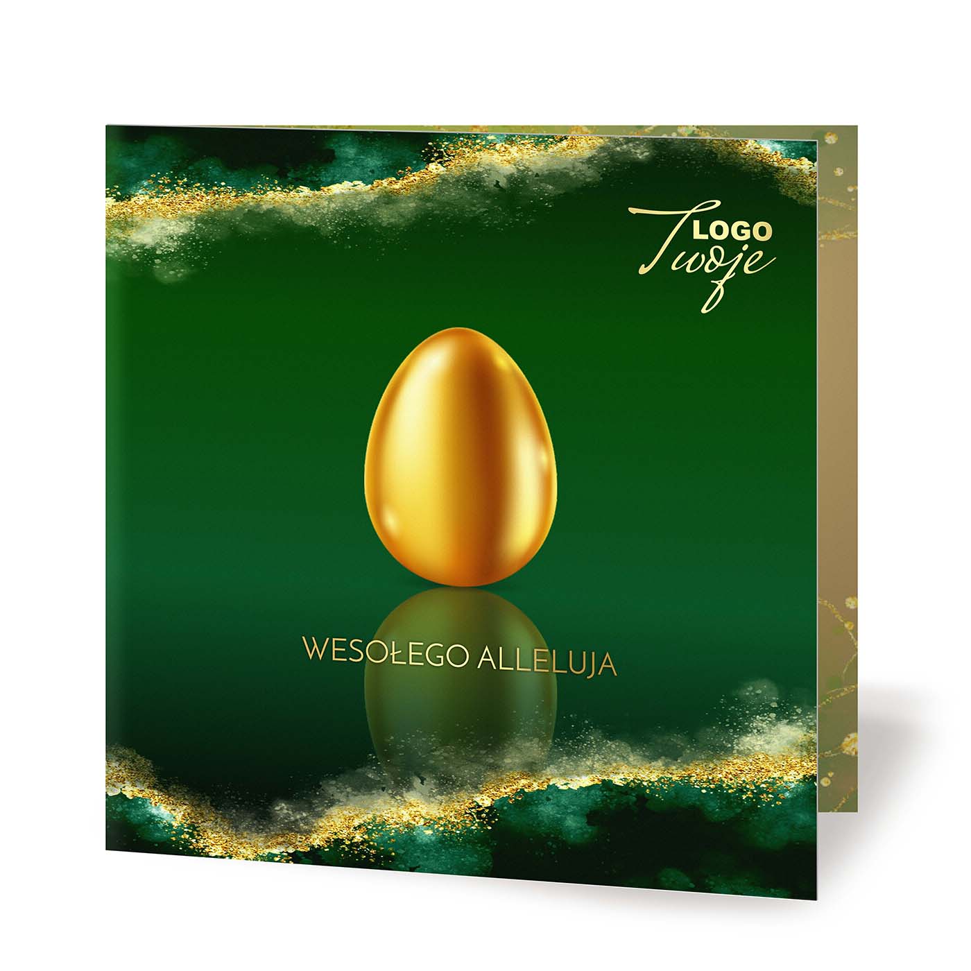 Na okładce znajduje się motyw złotych pisanek, który nadaje kartce świąteczny charakter. Wykorzystany wysokiej jakości druk cyfrowy oferuje efekt błysku jako nadrukowany detal, co stanowi nowoczesną alternatywę dla tradycyjnych złoconych elementów. Kartka jest wykonana z dwustronnie zadrukowanego, sztywnego papieru, co podkreśla jej elegancję i profesjonalizm.