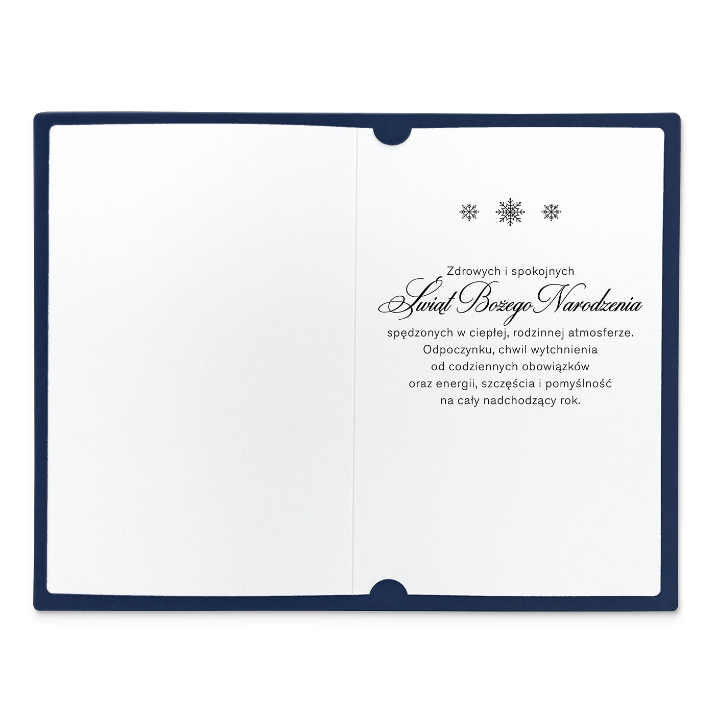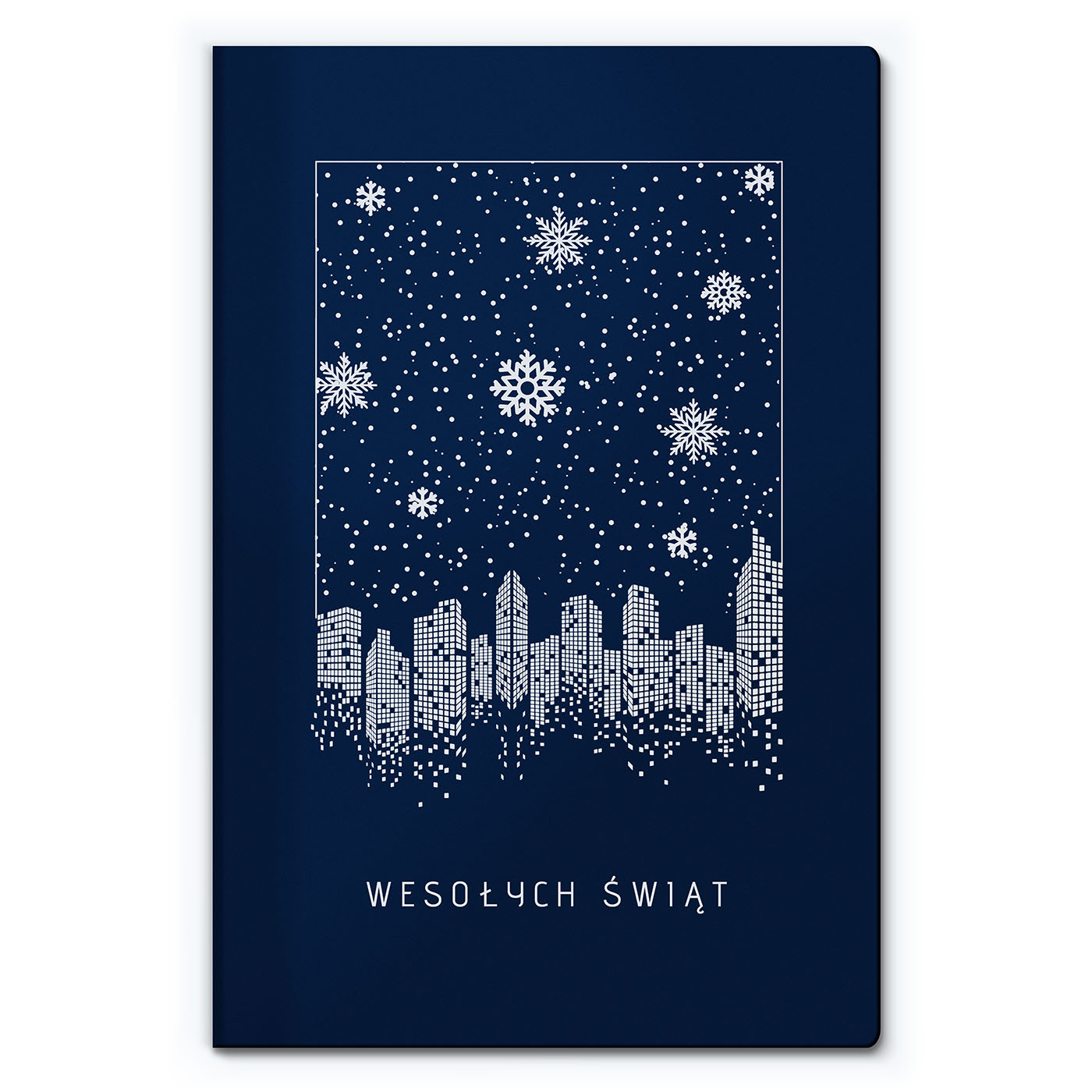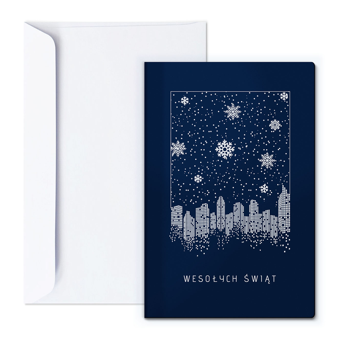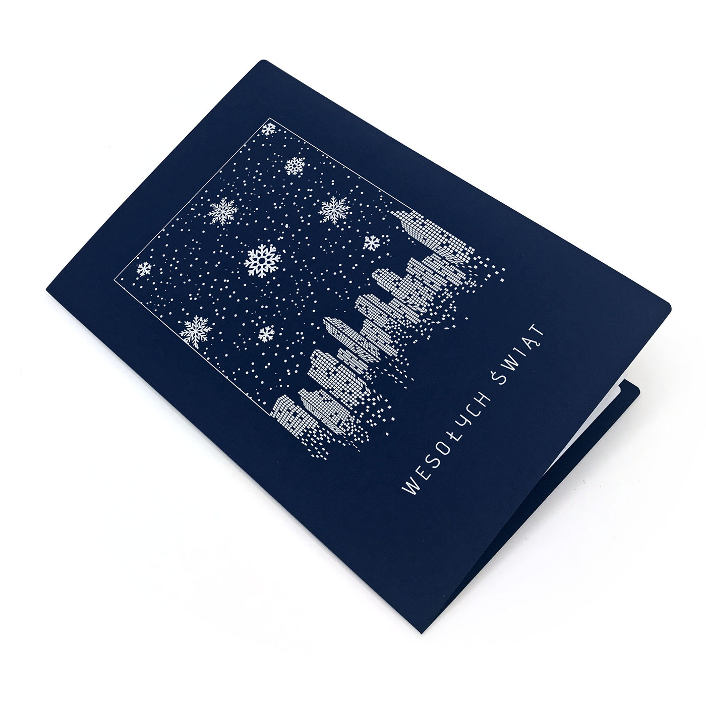 Elegancka kartka świąteczna wykonana z wysokiej jakości matowego papieru barwionego w masie w kolorze granatowym. Ta elegancka kartka to idealny sposób na przekazanie świątecznych życzeń klientom i partnerom biznesowym, jednocześnie podkreślając profesjonalizm i dbałość o detale. Ozdobny motyw okładki, przedstawiający zasypane śniegiem miasto, wykonany innowacyjną techniką białego nadruku. Wkładka kartki wykonana z białego, matowego papieru. Możecie Państwo personalizować wkładkę swoim logo oraz umieścić życzenia świąteczne, dzięki czemu stworzycie unikalną i spersonalizowaną kartkę dla swojej firmy.