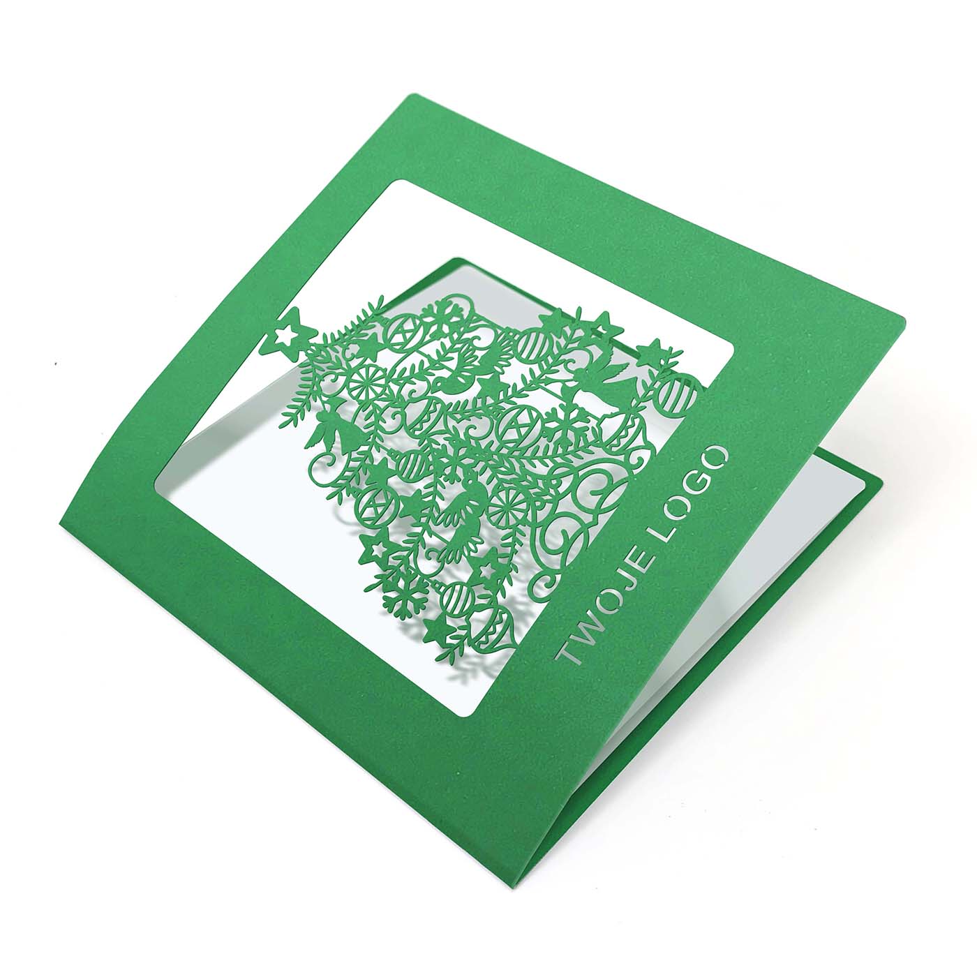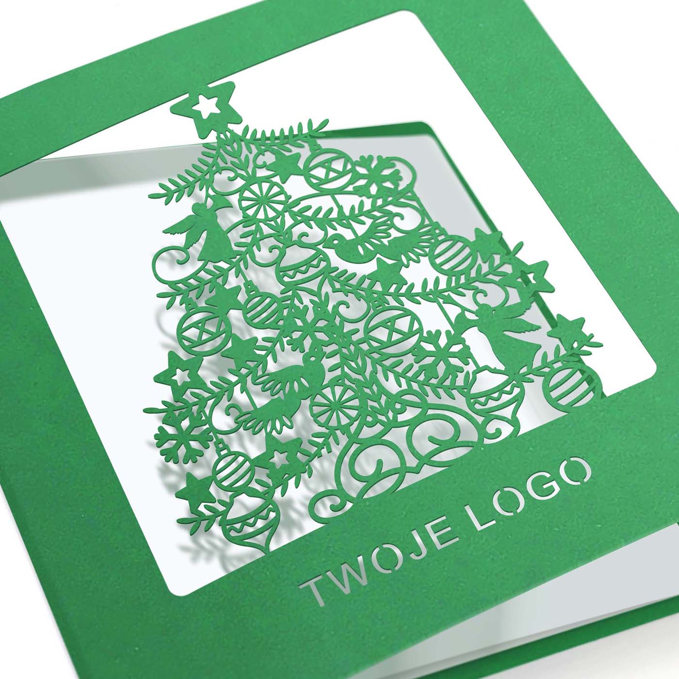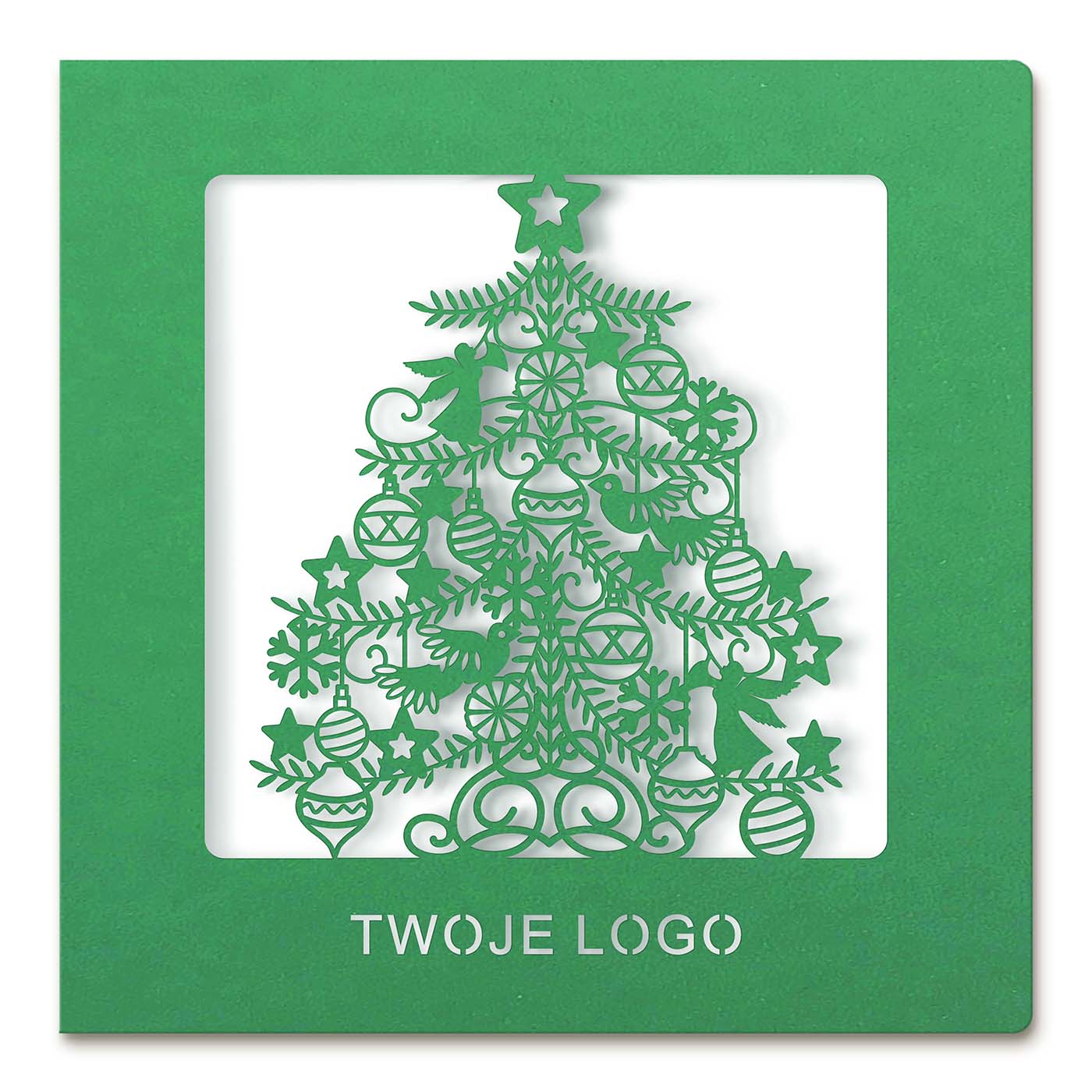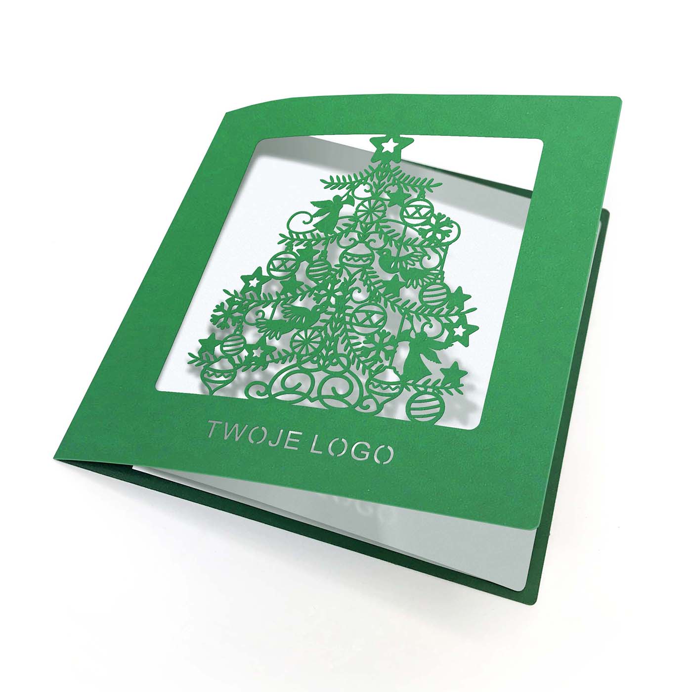 Biznesowa kartka świąteczna wycinana laserowo z motywem precyzyjnie wyciętej choinki jest doskonałym sposobem na wyrażenie świątecznych życzeń w sposób elegancki i profesjonalny. Wykonana z wysokiej jakości zielonego papieru barwionego w masie. Możliwe jest umieszczenie logo firmy na kartce, co pozwoli wyróżnić się i promować swoją markę. Wysokiej jakości materiał, z którego wykonana jest kartka, zapewnia trwałość i elegancję. Wkładka do nadruku życzeń biała matowa.