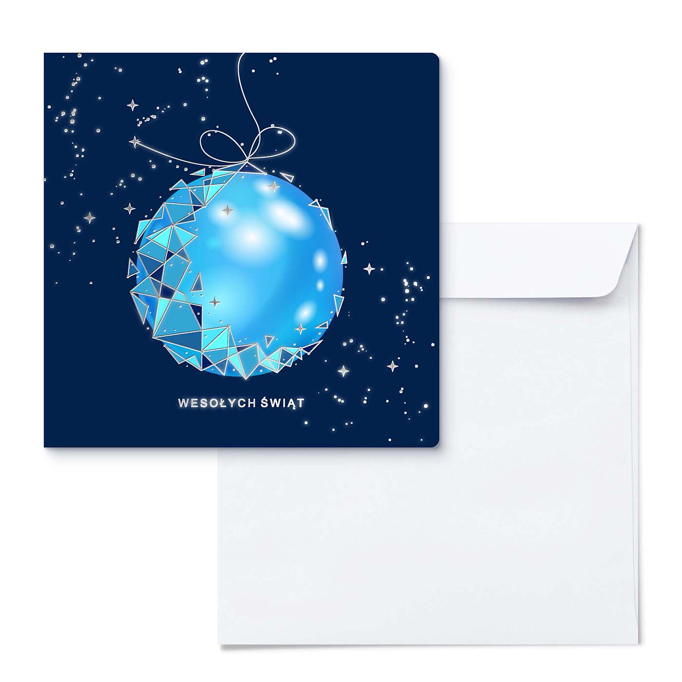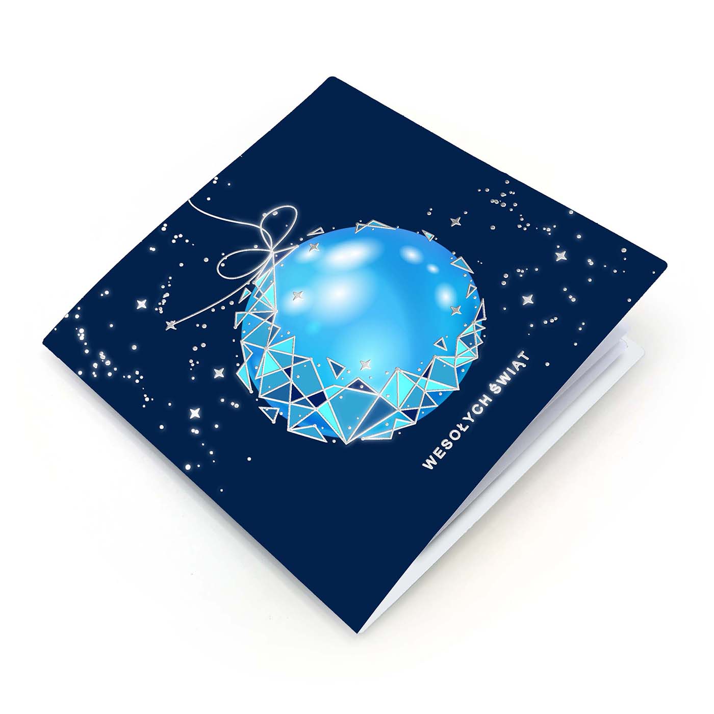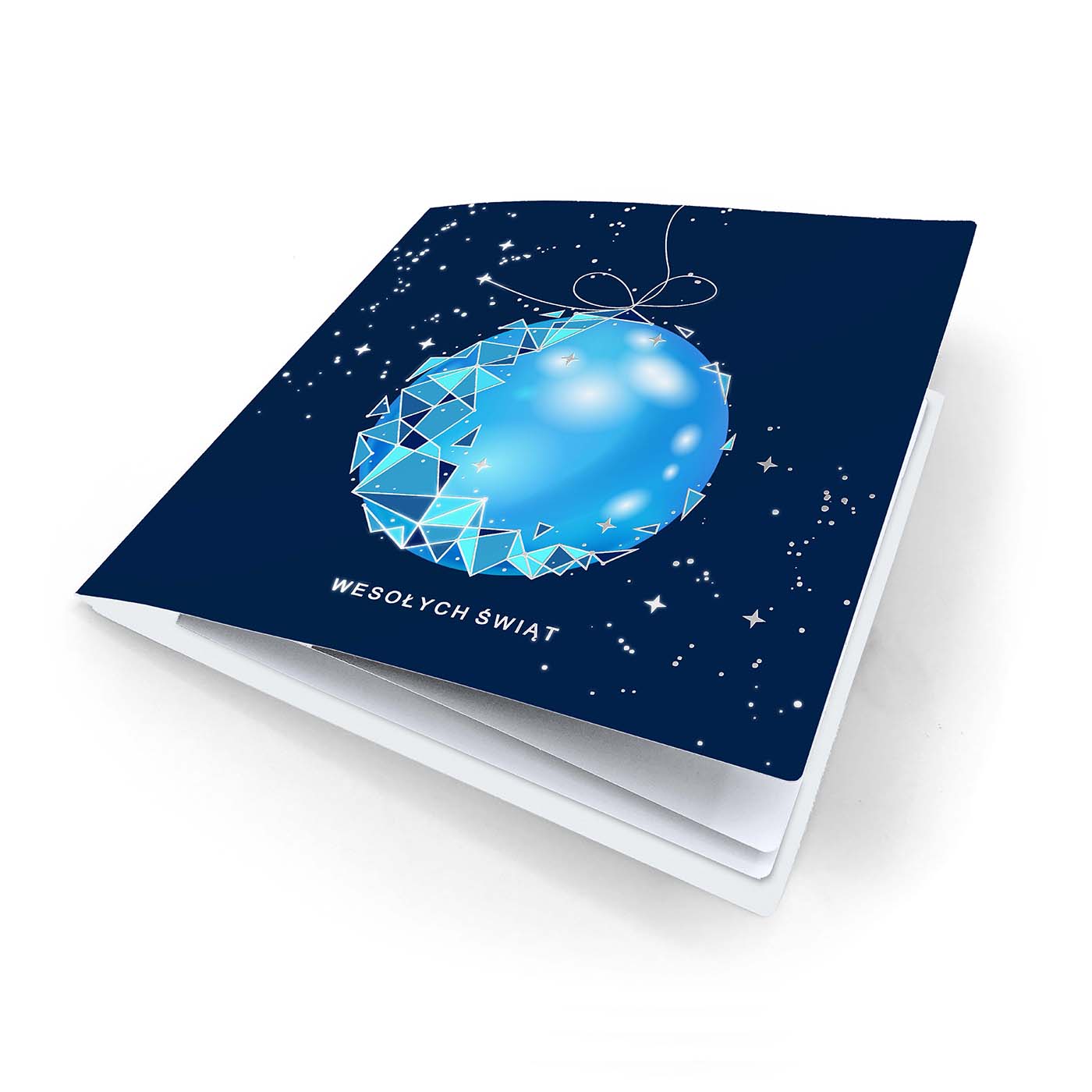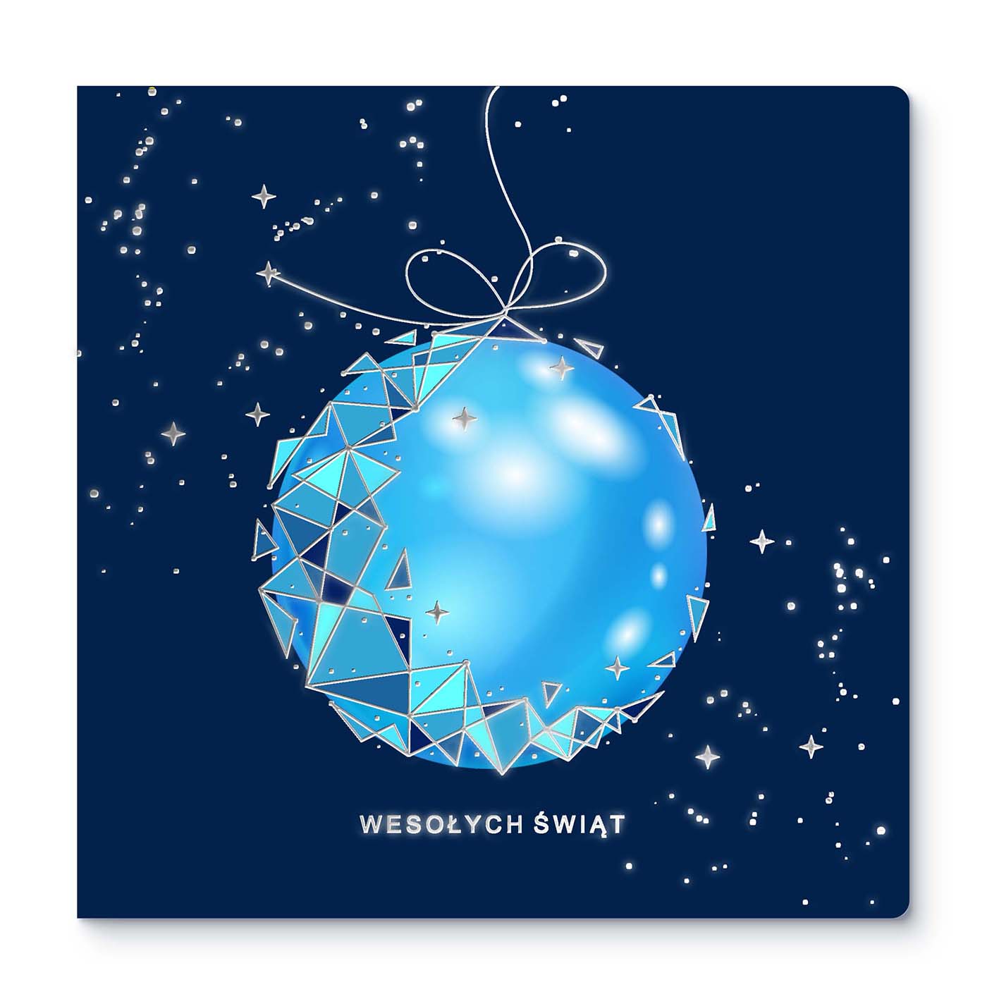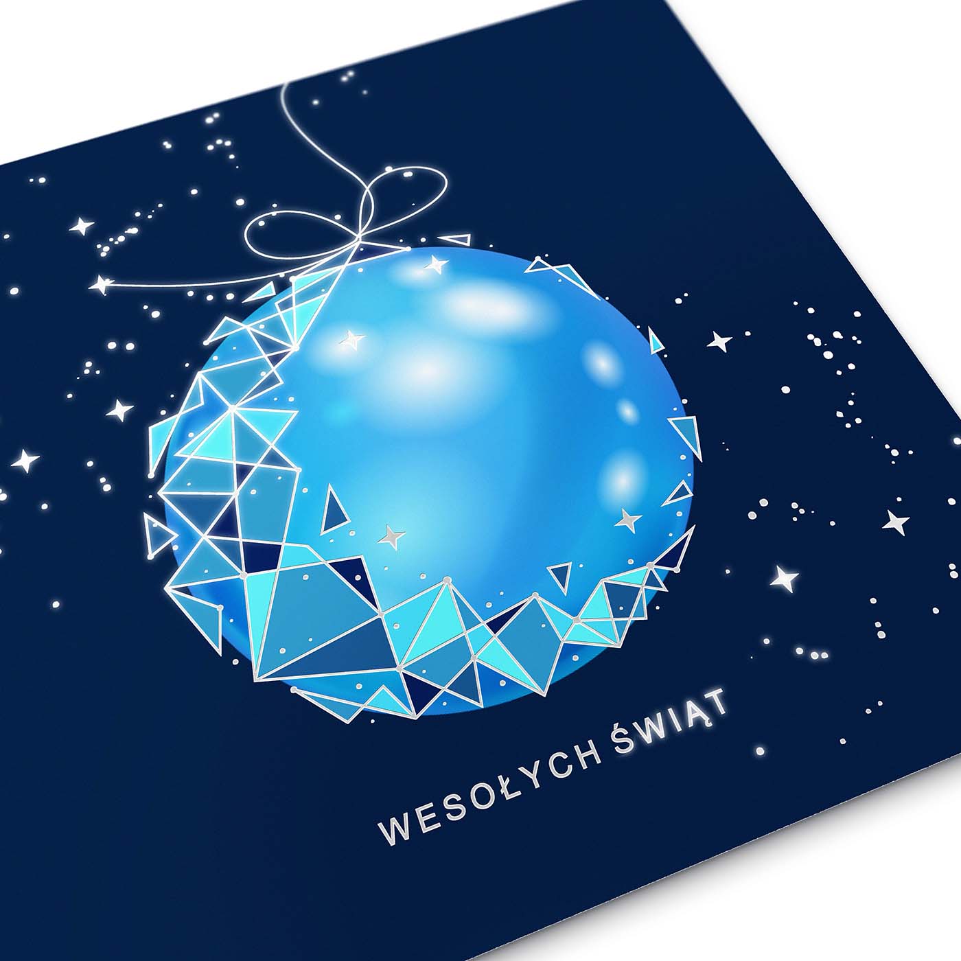 Nowoczesna kartka świąteczna wykonana z wysokiej jakości sztywnego papieru, ozdobiona dynamicznym motywem bombki w chłodnych odcieniach błękitu. Na granatowym tle rozbłyskują geometryczne linie, srebrzone detale i drobne gwiazdki, które nadają projektowi kosmicznej lekkości i wyjątkowego blasku. Grafika została wykonana techniką druku cyfrowego z dodatkiem srebrzenia, co tworzy efekt wielowymiarowości i elegancji.
