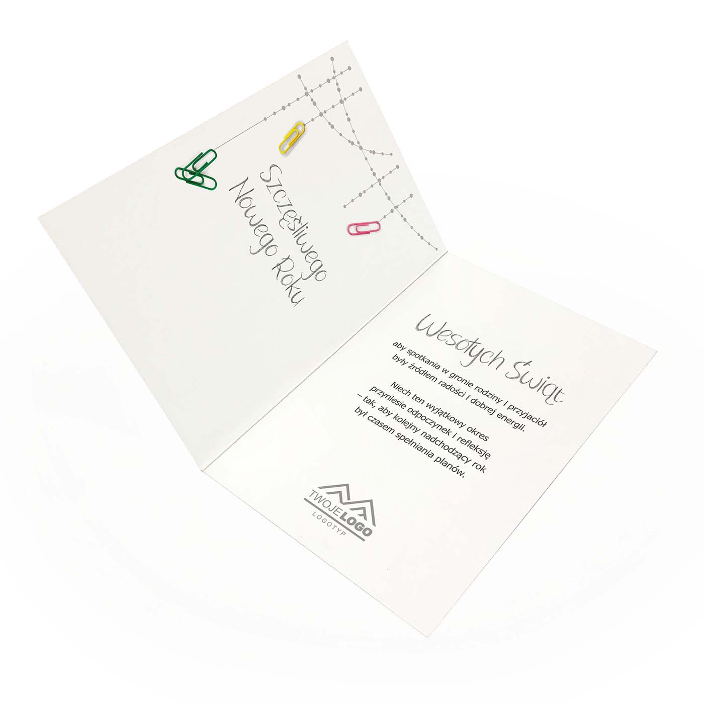 - Środek: zadruk dwustronny, miejsce na życzenia i logotyp