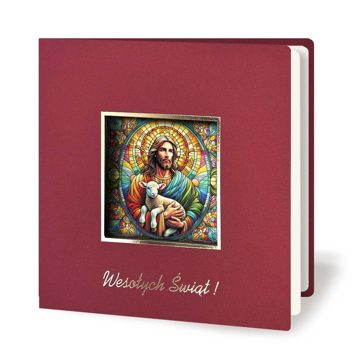 Centralnym elementem okładki jest okienko, przez które widoczna jest barwna grafika inspirowana witrażem, przedstawiająca Jezusa trzymającego baranka - symbol niewinności, ofiary i odkupienia. Kompozycja witrażowa przyciąga wzrok bogactwem kolorów i detali, tworząc efekt głębi oraz wyjątkowego światła. Okienko zostało subtelnie podkreślone złoconą ramką, a całość dopełnia elegancki, złocony napis "Wesołych Świąt", umieszczony na okładce. Wnętrze kartki stanowi matowa wkładka w kolorze ecru, przeznaczona do nadruku treści życzeń oraz logotypu.