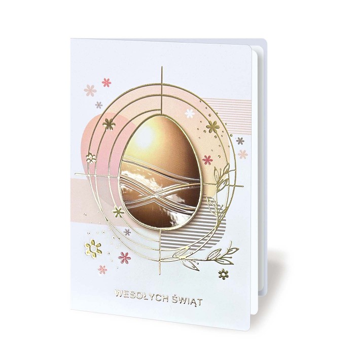 Elegancka kartka wielkanocna o nowoczesnym charakterze, która zachwyca wyważoną kompozycją geometrycznych form i delikatnych, wiosennych akcentów. Centralny motyw jajka, wzbogacony wypukłym złoceniem oraz efektem druku 3D, tworzy wrażenie głębi i subtelnego połysku. Pastelowa kolorystyka w połączeniu ze złotymi liniami i drobnymi motywami kwiatowymi nadaje całości lekkości, świeżości i współczesnej elegancji, idealnie wpisującej się w klimat Świąt Wielkanocnych.