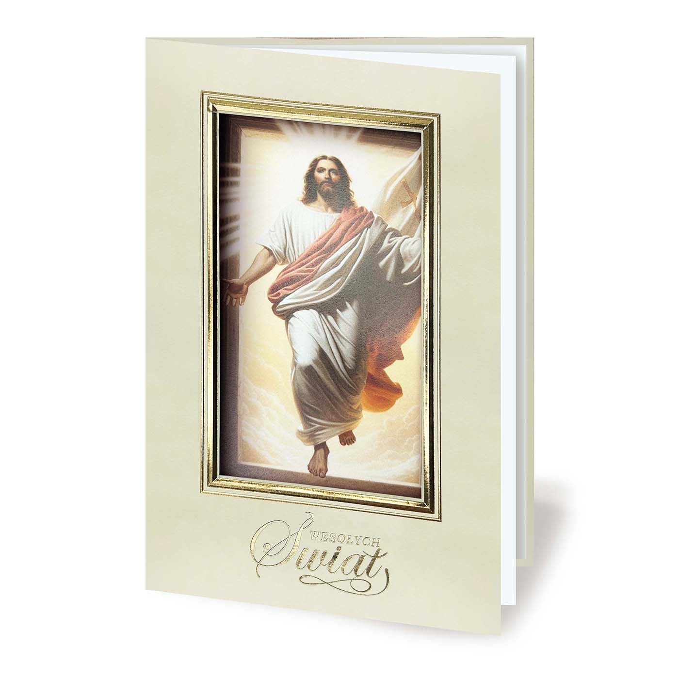 Okładkę zdobi trójwymiarowa, tłoczona i złocona ramka, przylegająca do wyciętego otworu, przez który widoczna jest kolorowa grafika przedstawiająca Jezusa Zmartwychwstałego. Ilustracja, nadrukowana na pierwszej stronie wkładki, emanuje światłem i symboliką nadziei, podkreślając religijny charakter kartki. Całość dopełnia elegancki, złocony napis "Wesołych Świąt" umieszczony w dolnej części okładki. Wnętrze kartki stanowi matowa wkładka w odcieniu ecru, przeznaczona do nadruku treści życzeń oraz logotypu.