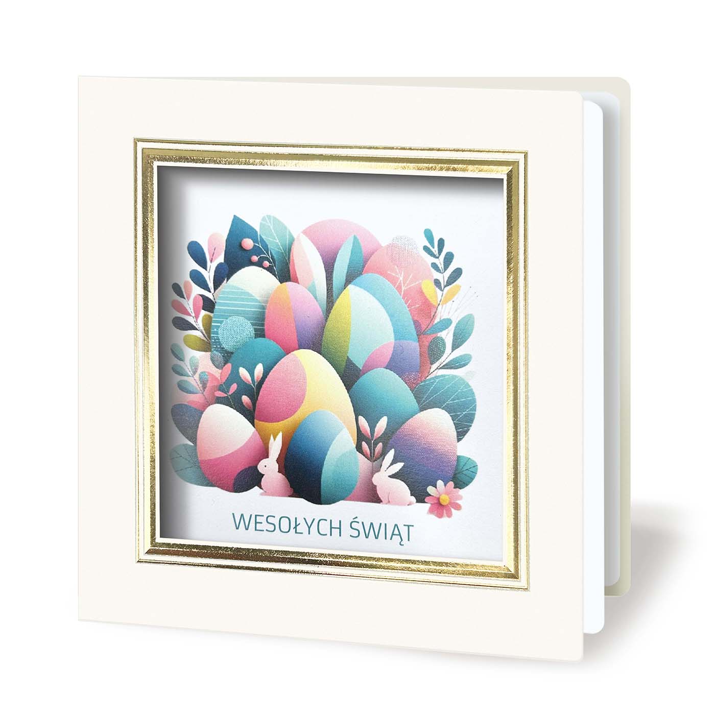 Nowoczesna i pełna lekkości kartka wielkanocna, która zachwyca harmonijnym połączeniem pastelowych kolorów oraz eleganckiego wykończenia. Delikatna, wiosenna grafika pisanek i króliczków wprowadza radosny nastrój, a subtelna złocona ramka nadaje całości szlachetnego charakteru.
