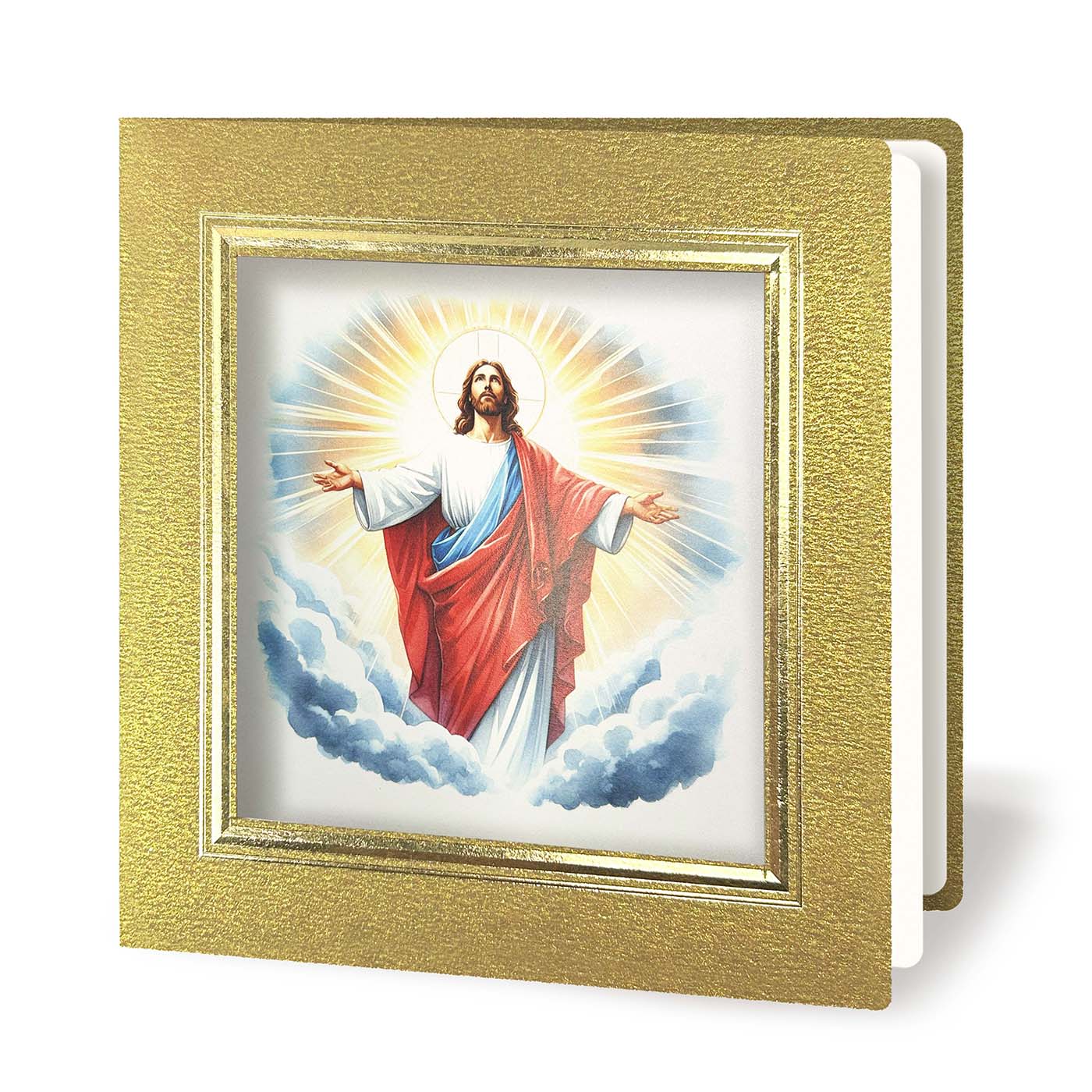 Okładkę zdobi trójwymiarowa, tłoczona i złocona ramka, subtelnie przylegająca do okienka. Przez wycięcie widoczna jest kolorowa grafika przedstawiająca Jezusa Zmartwychwstałego, nadrukowana na pierwszej stronie wkładki. Kompozycja ta podkreśla religijny i duchowy wymiar kartki, a złota kolorystyka dodatkowo wzmacnia jej elegancki i świąteczny charakter. Wnętrze kartki stanowi wkładka w delikatnym odcieniu ecru, przeznaczona do nadruku treści życzeń oraz logotypu.