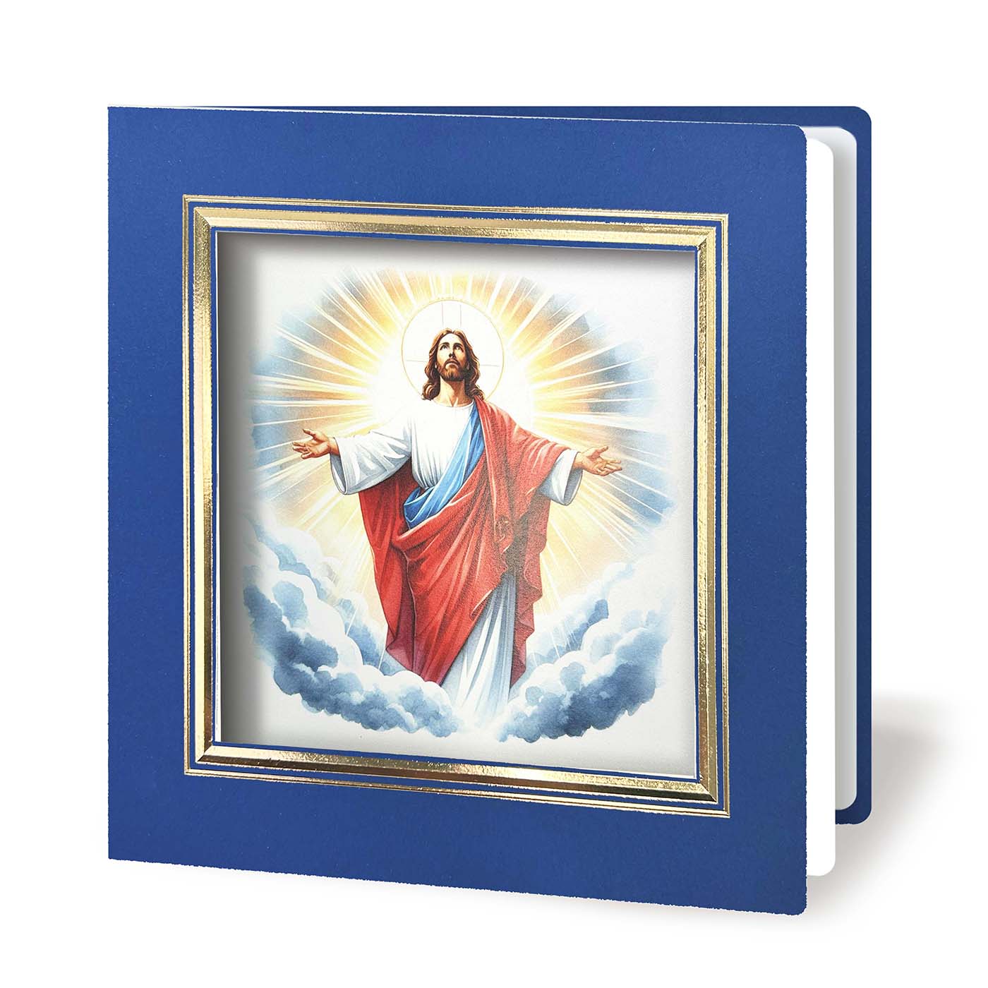 Okładkę zdobi trójwymiarowa, tłoczona i złocona ramka, otaczająca centralne okienko. Przez wycięcie widoczna jest kolorowa grafika przedstawiająca Jezusa Zmartwychwstałego, nadrukowana na pierwszej stronie wkładki. Kompozycja ta nadaje kartce wyraźnie religijny charakter, a połączenie granatu i złota tworzy harmonijną, elegancką całość. Wnętrze kartki stanowi matowa wkładka w kolorze ecru, przeznaczona do nadruku treści życzeń oraz logotypu.