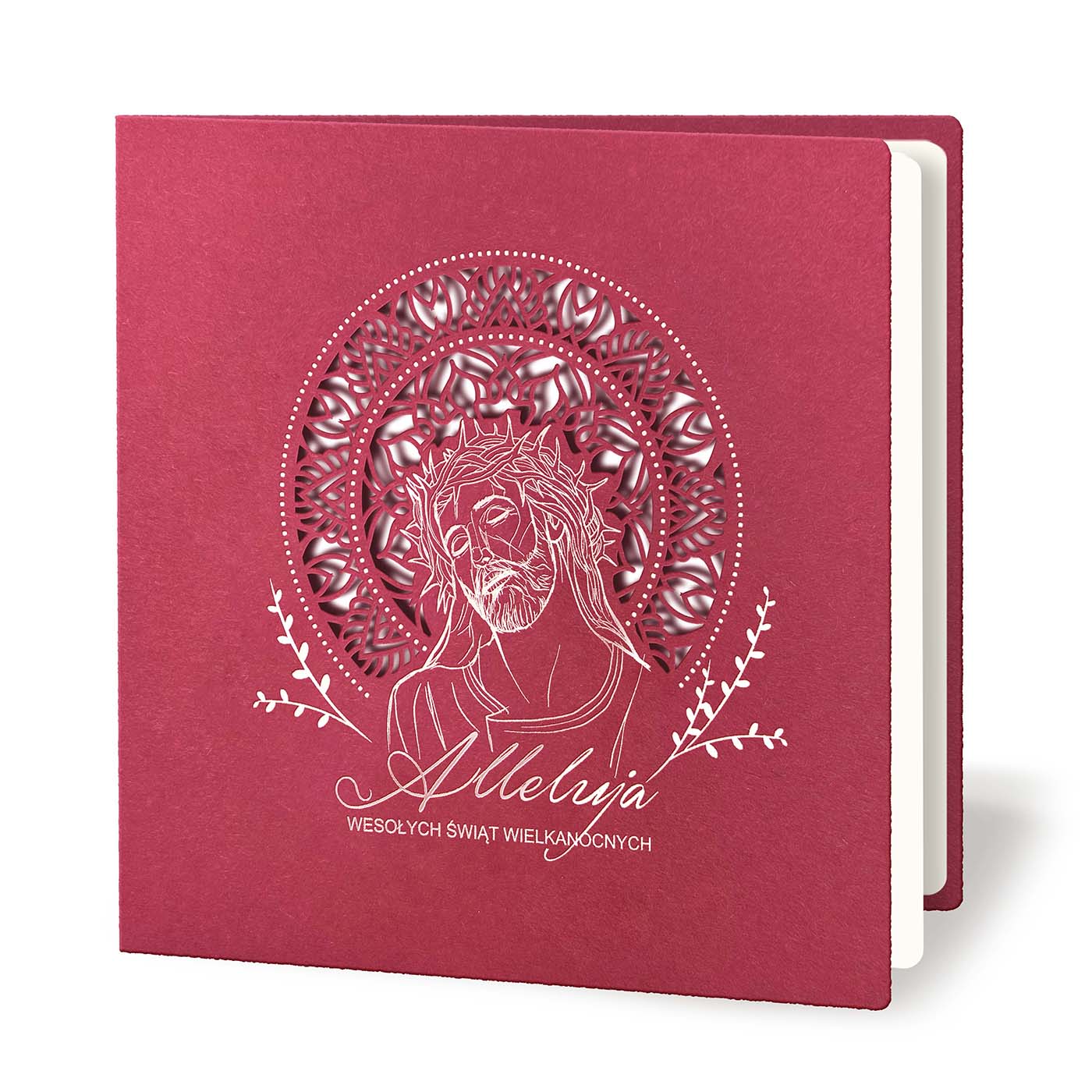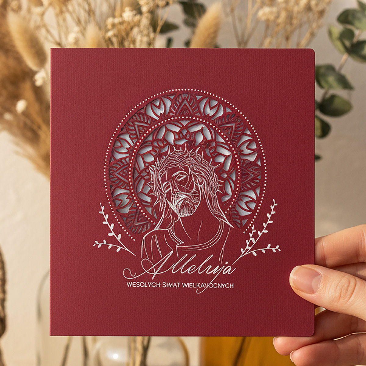 Centralną część okładki zdobi złocony motyw Pana Jezusa, subtelnie wkomponowany w misterny, ażurowy wzór wycięty laserowo. Wielowarstwowa kompozycja tworzy efekt głębi i lekkości, podkreślając artystyczny charakter kartki. Całość uzupełnia elegancki napis "Alleluja" wraz z życzeniami "Wesołych Świąt Wielkanocnych", harmonijnie wpisany w projekt okładki. Wnętrze kartki stanowi matowa wkładka w kolorze ecru, przeznaczona do nadruku treści życzeń oraz logotypu.