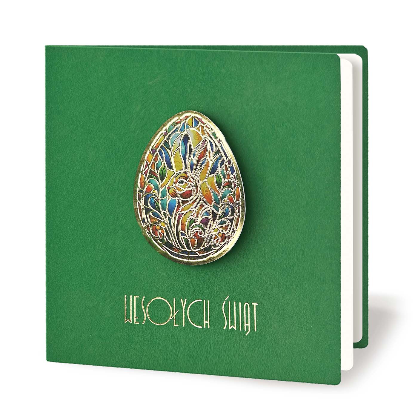 Okładka została wykonana z wysokiej jakości matowego papieru barwionego w masie w intensywnym, zielonym kolorze. Jej powierzchnię zdobi delikatnie złocony napis, który nadaje całości szlachetnego charakteru. Centralnym punktem kartki jest efektowna aplikacja w formie kolorowej pisanki - nadrukowana innowacyjną techniką druku i wzbogacona trójwymiarowym złoceniem, które pięknie odbija światło i podkreśla detale wzoru. Wnętrze uzupełnia matowa wkładka w kolorze ecru, stanowiąca eleganckie tło dla wielkanocnych życzeń.