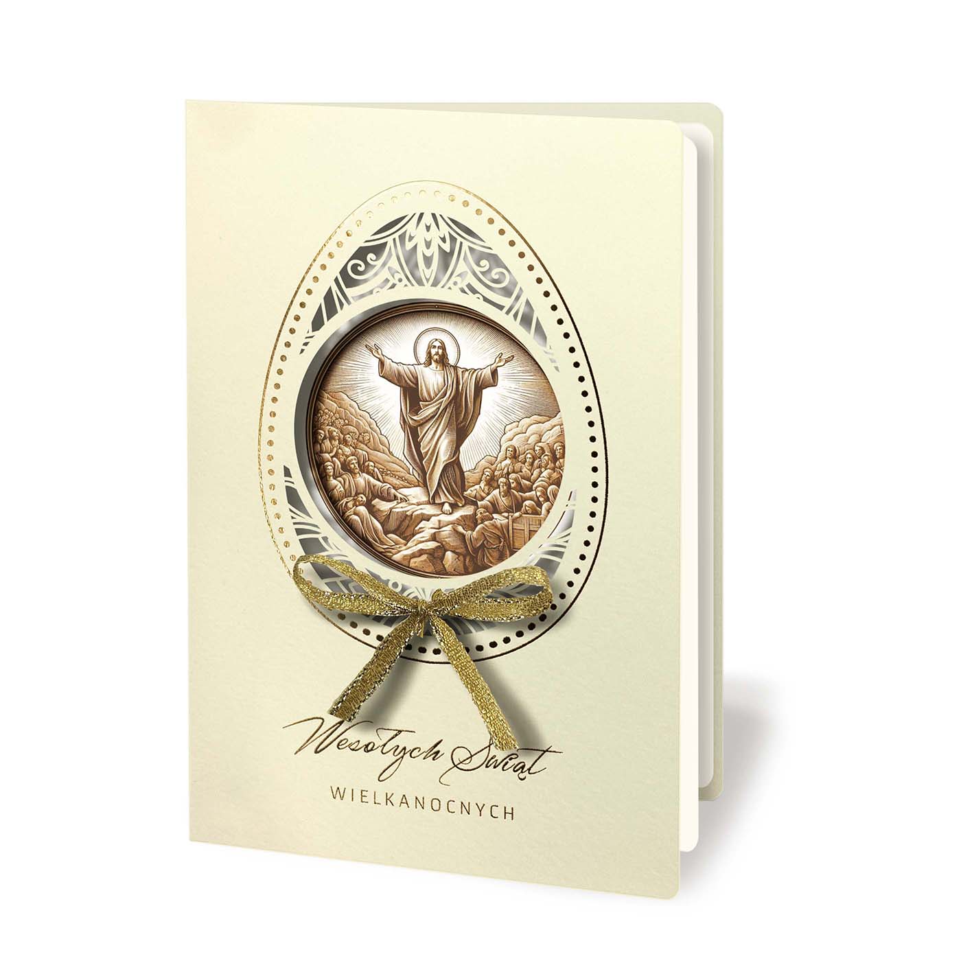 Centralnym elementem okładki jest motyw jajka wielkanocnego z precyzyjnym, ażurowym wycięciem laserowym, przez które widoczna jest grafika przedstawiająca Jezusa Zmartwychwstałego, nadrukowana na pierwszej stronie wkładki. Ażurowy wzór został dodatkowo uszlachetniony subtelnym złoceniem, które pięknie podkreśla detale i nadaje całości wyjątkowej lekkości. Kompozycję dopełnia elegancka, satynowa kokardka umieszczona na okładce, wprowadzająca delikatny, dekoracyjny akcent. Pod motywem znajduje się estetyczny napis "Wesołych Świąt Wielkanocnych", harmonijnie wpisujący się w całość projektu. Wnętrze kartki stanowi matowa wkładka w kolorze ecru, przeznaczona do nadruku treści życzeń oraz logotypu.