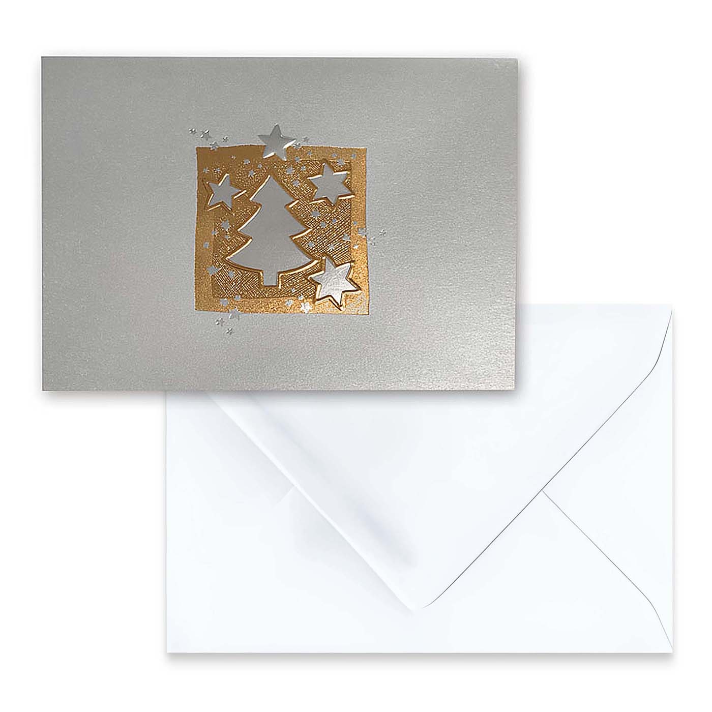 Kartka świąteczna z wysokiej jakości ozdobnego, metalizowanego papieru barwionego w masie w kolorze srebrnym. w centralnej części okładki znajduję się subtelne zdobienie w postaci choinki.
