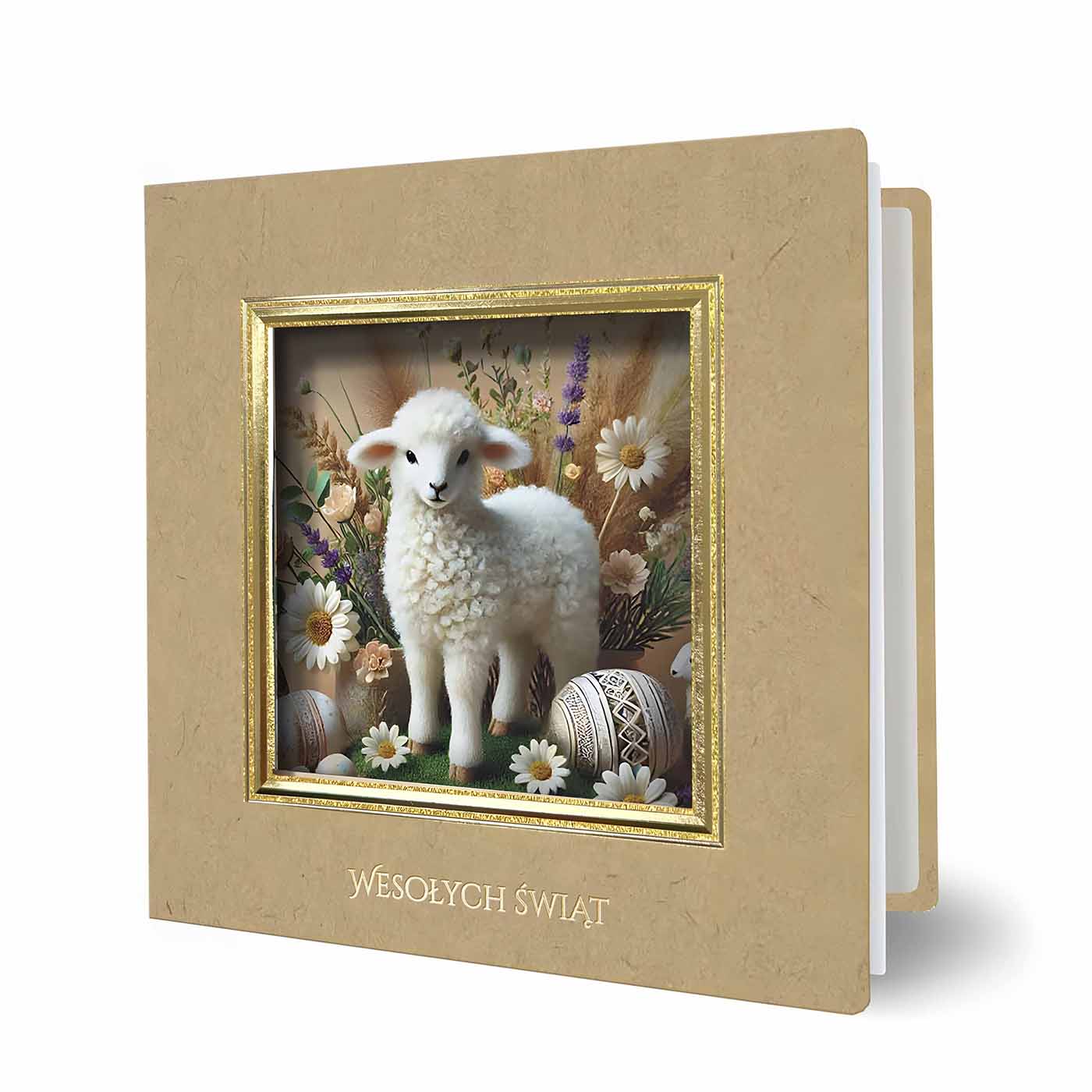 Subtelna i pełna ciepła kartka wielkanocna, która nawiązuje do tradycyjnej symboliki Świąt w eleganckim, stonowanym wydaniu. Okładkę wykonano z wysokiej jakości sztywnego papieru w naturalnym, ciepłym odcieniu brązu, który nadaje projektowi szlachetny i ponadczasowy charakter. Centralnym elementem kartki jest dekoracyjny otwór otoczony trójwymiarową, tłoczoną i złoconą ramką, przez który widoczna jest delikatna świąteczna grafika z motywem baranka wśród wiosennych kwiatów. Całość tworzy harmonijną kompozycję, emanującą spokojem i elegancją.