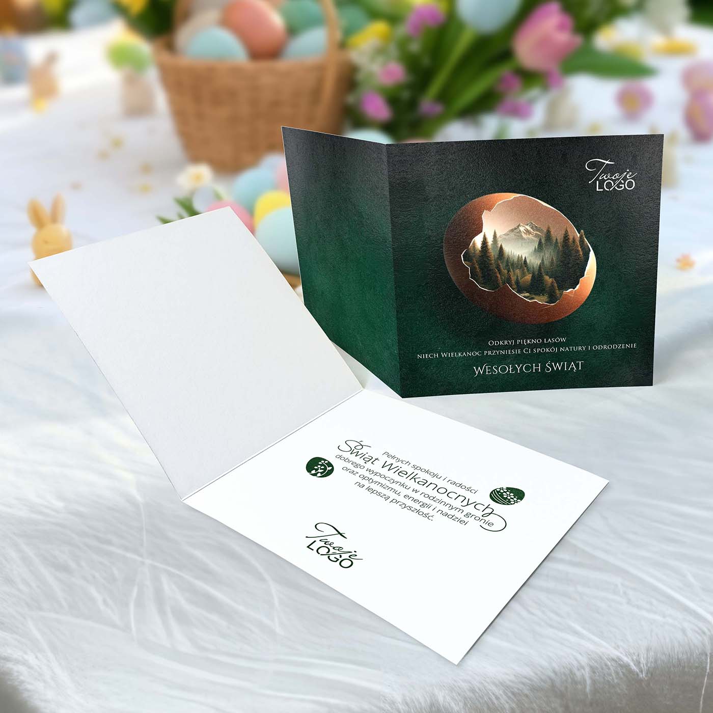 Ekskluzywna kartka wielkanocna o wyjątkowym designie, łącząca tradycję z nowoczesnym data-stylem. Na okładce umieszczono efektowną grafikę w postaci pękającego jajka, w którym skrywa się naturalny pejzaż, symbolizujący odrodzenie i nadzieję.