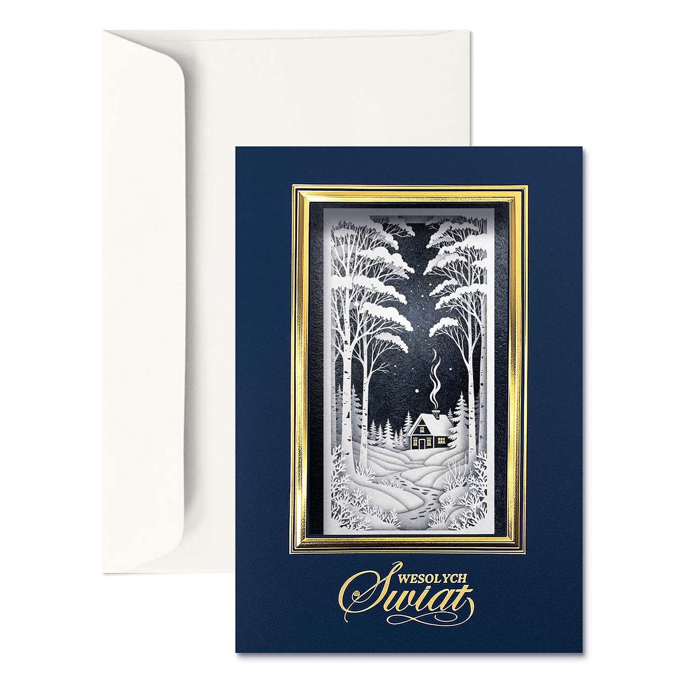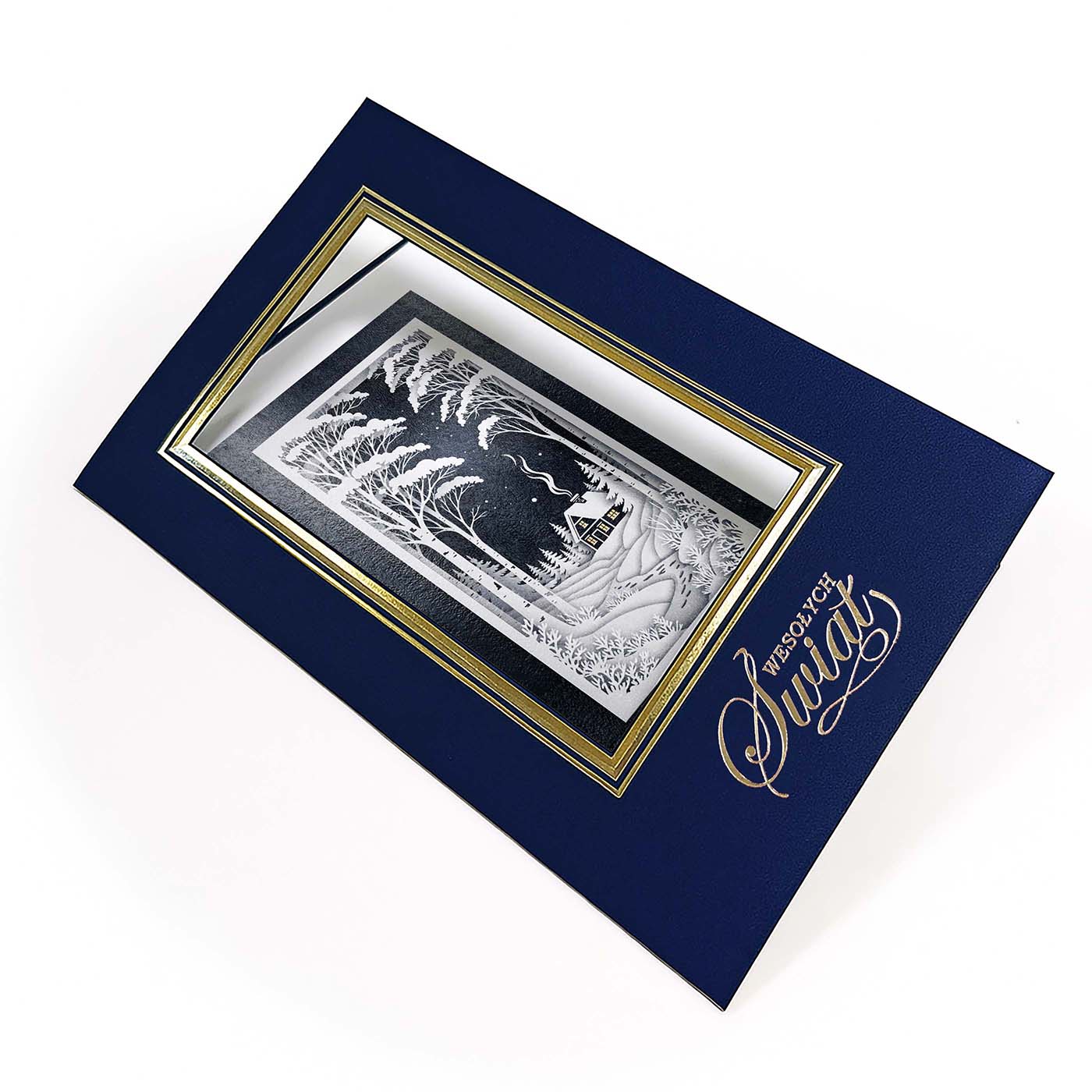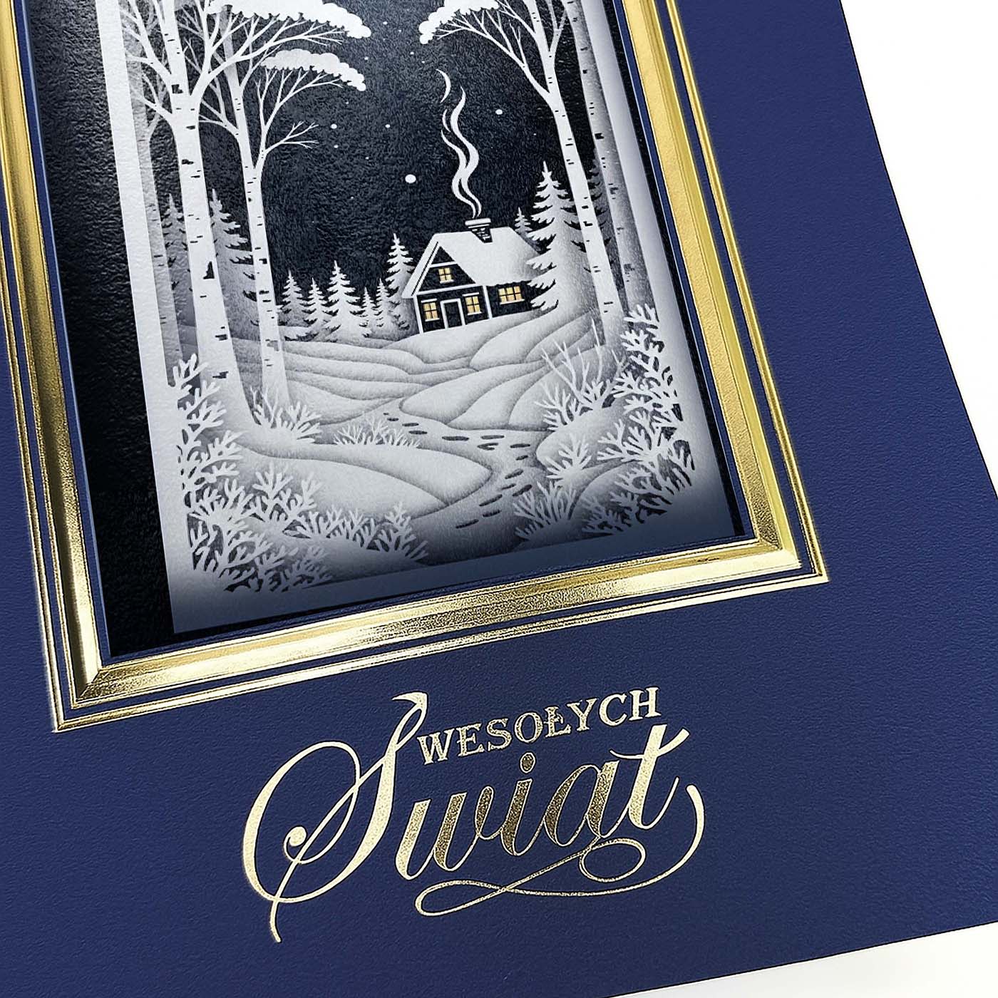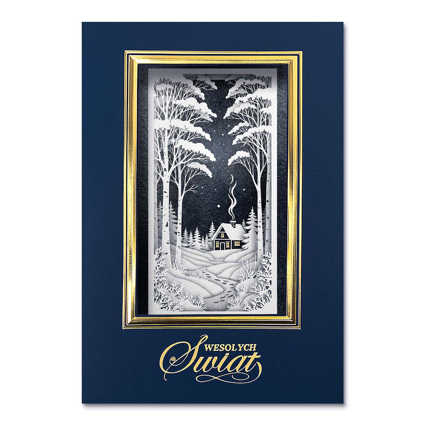 Ekskluzywna kartka świąteczna wykonana z wysokiej jakości papieru w eleganckim granatowym kolorze o subtelnej strukturze. Okładkę zdobi złocona ramka, w której znajduje się wyjątkowa, trójwymiarowa ilustracja - samotna, oświetlona chata otulona śniegiem, ukryta wśród wysokich drzew pod rozgwieżdżonym, zimowym niebem. Spokój, głębia i świąteczna magia zamknięte w jednej, dopracowanej kompozycji.