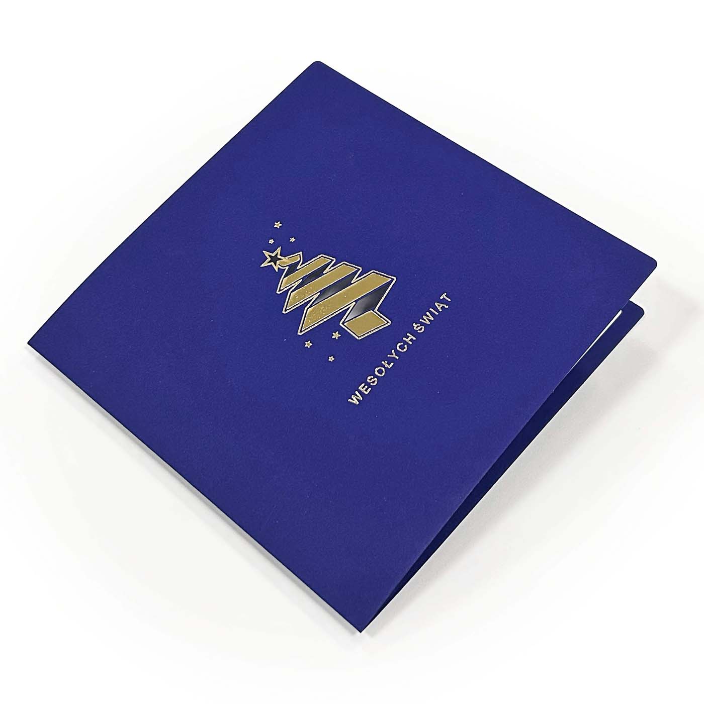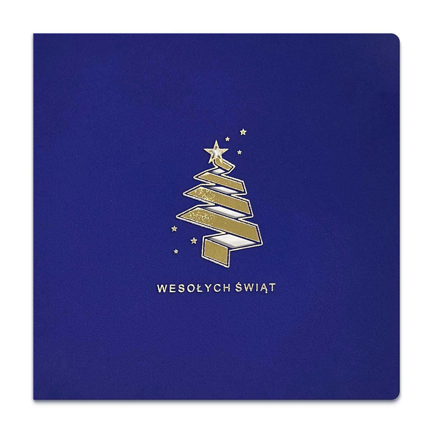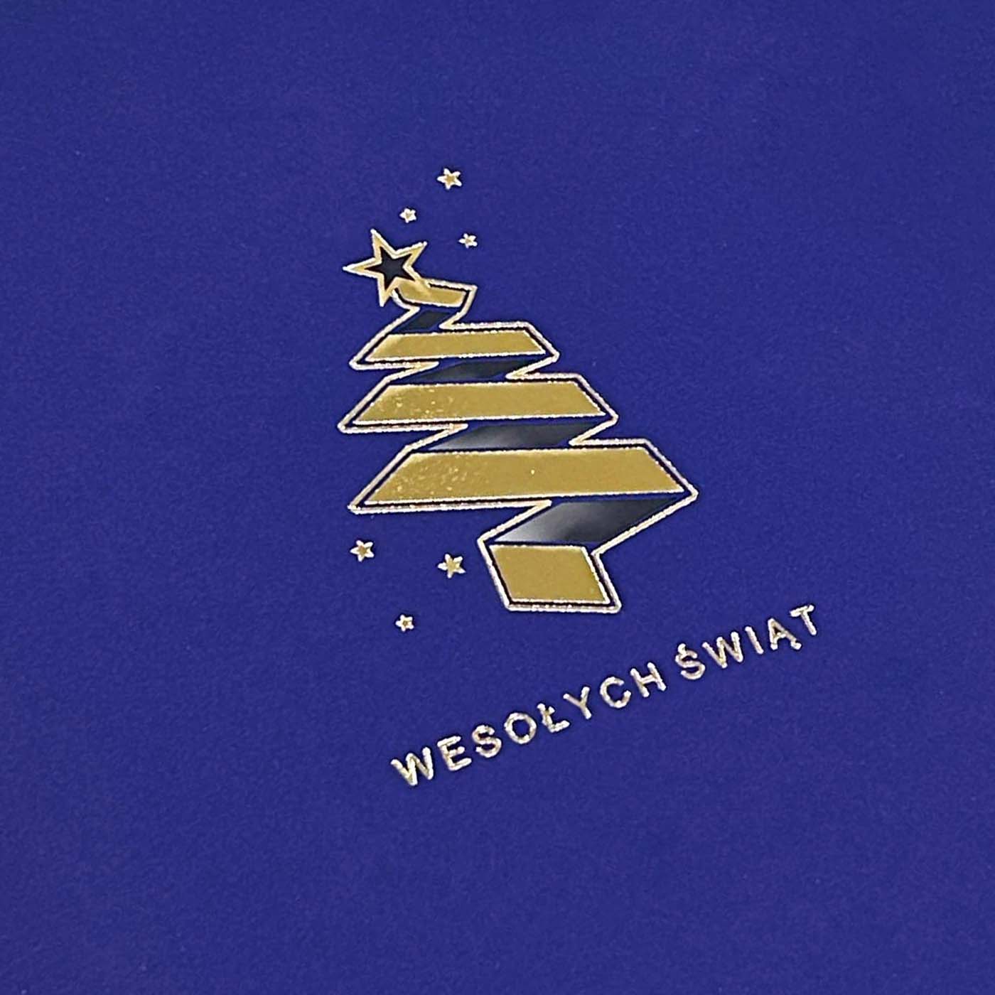 Nowoczesna i minimalistyczna kartka świąteczna, wykonana z wysokiej jakości papieru barwionego w masie w odcieniu głębokiego granatu. Na okładce znajduje się stylizowana choinka, której forma przypomina spiralnie zwiniętą wstęgę - subtelna gra linii i światła podkreślona została eleganckim złoceniem i cięciem laserowym. Całości dopełnia napis "Wesołych Świąt", również w złocie, oraz delikatne gwiazdki, tworzące harmonijną, świąteczną kompozycję.