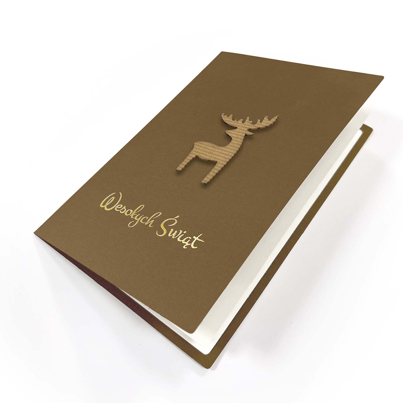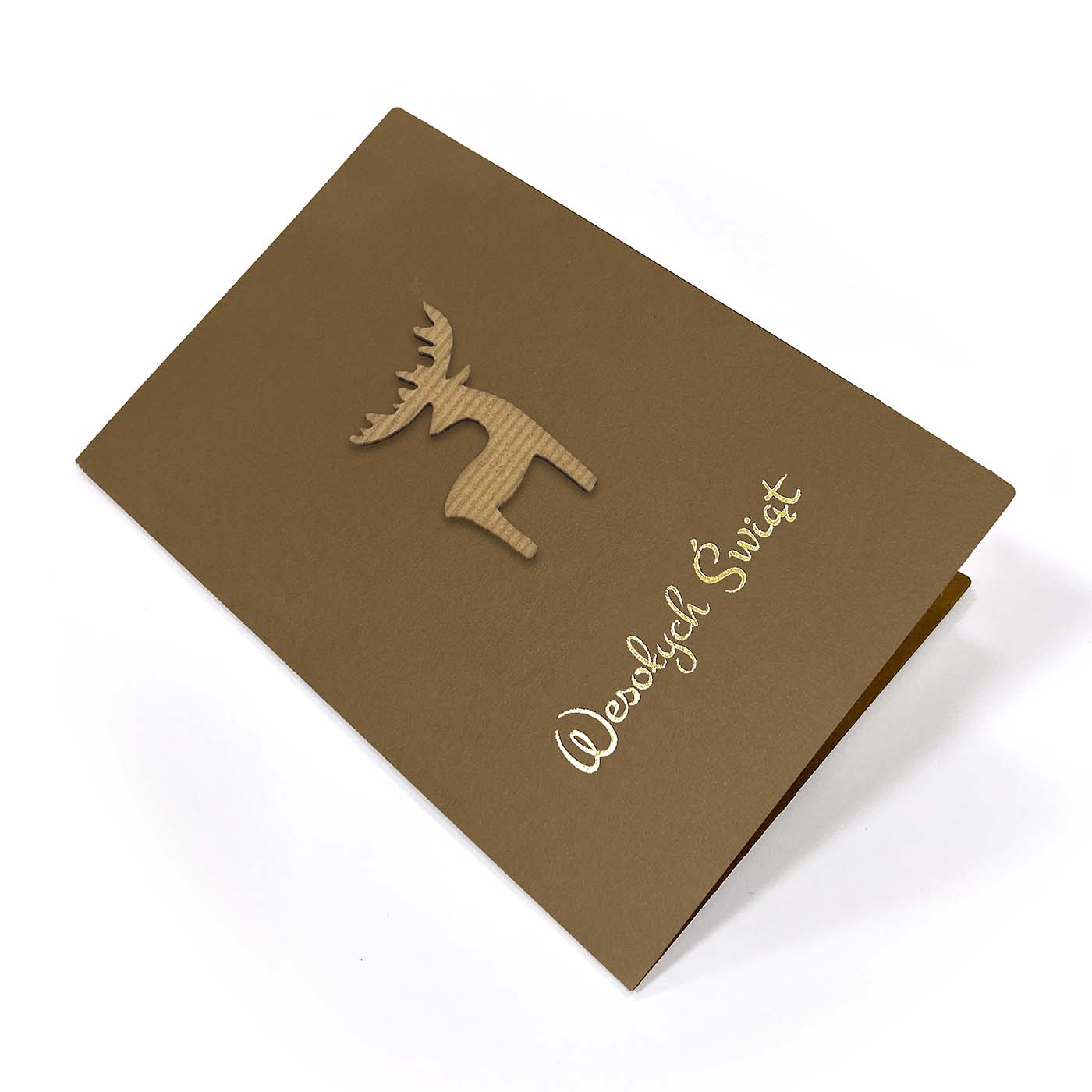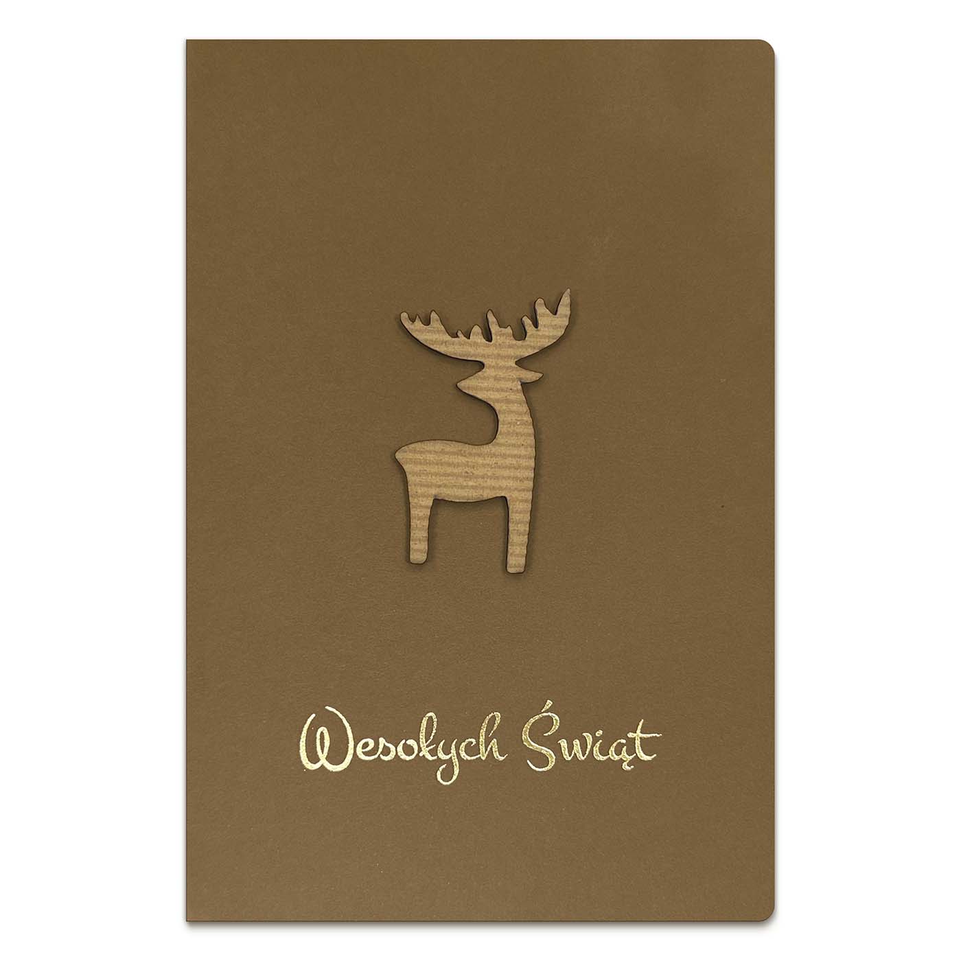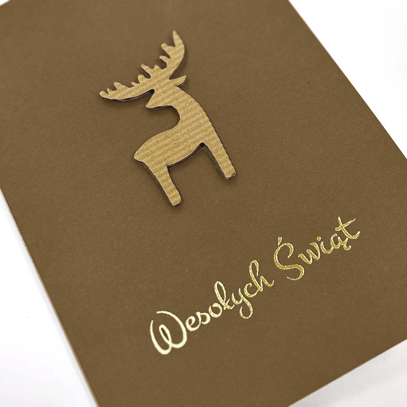 Kartka świąteczna wykonana z eleganckiego papieru barwionego w masie w ciepłym, karmelowym odcieniu. Okładkę zdobi minimalistyczny motyw renifera, wykonany z ekologicznej tektury o strukturze falistej, tworzący subtelny efekt przestrzenny. Całość dopełnia złocony, ręcznie tłoczony napis "Wesołych Świąt", który dodaje kompozycji szlachetności.