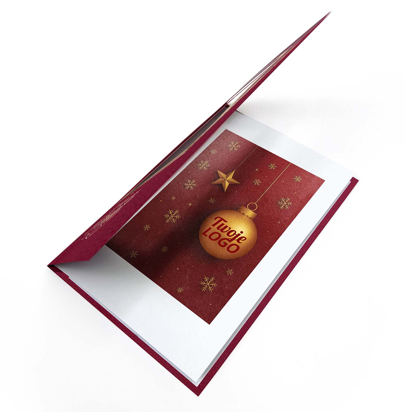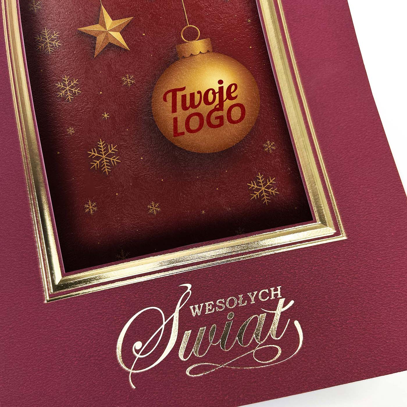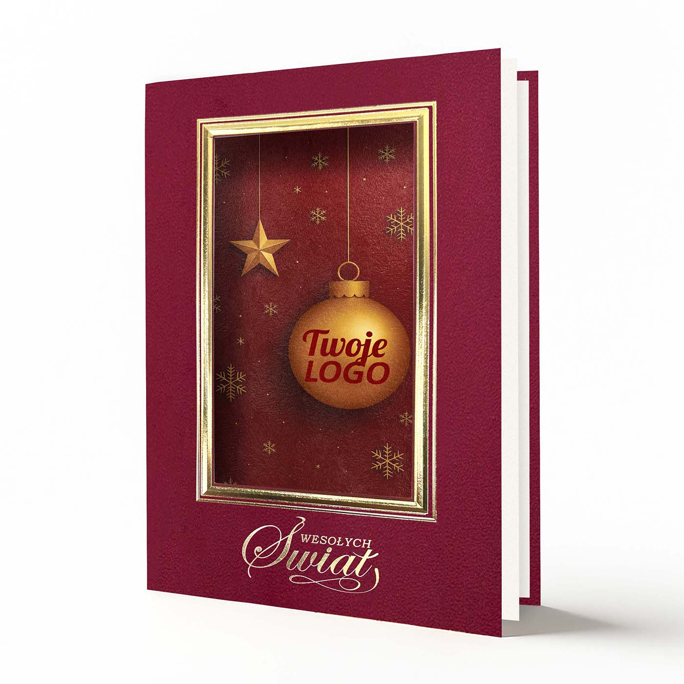 Elegancka kartka świąteczna utrzymana w odcieniach głębokiego bordo, ozdobiona świątecznym motywem bombki i gwiazdy. Na okładce znajduje się efektowna ramka z tłoczeniem i złoceniem, która dodaje prestiżowego charakteru. W centralnym punkcie przewidziano miejsce na nadruk logotypu, co czyni kartkę idealną propozycją dla firm.