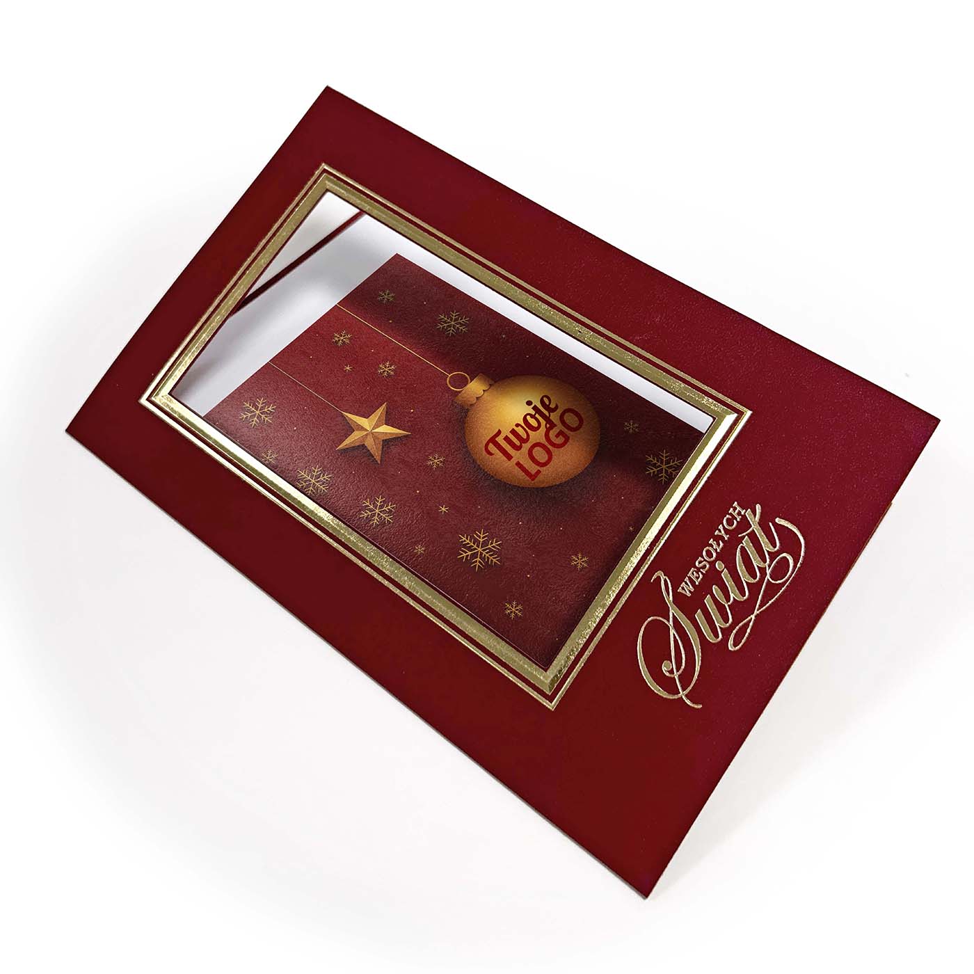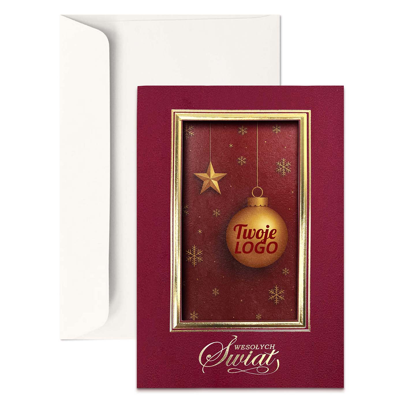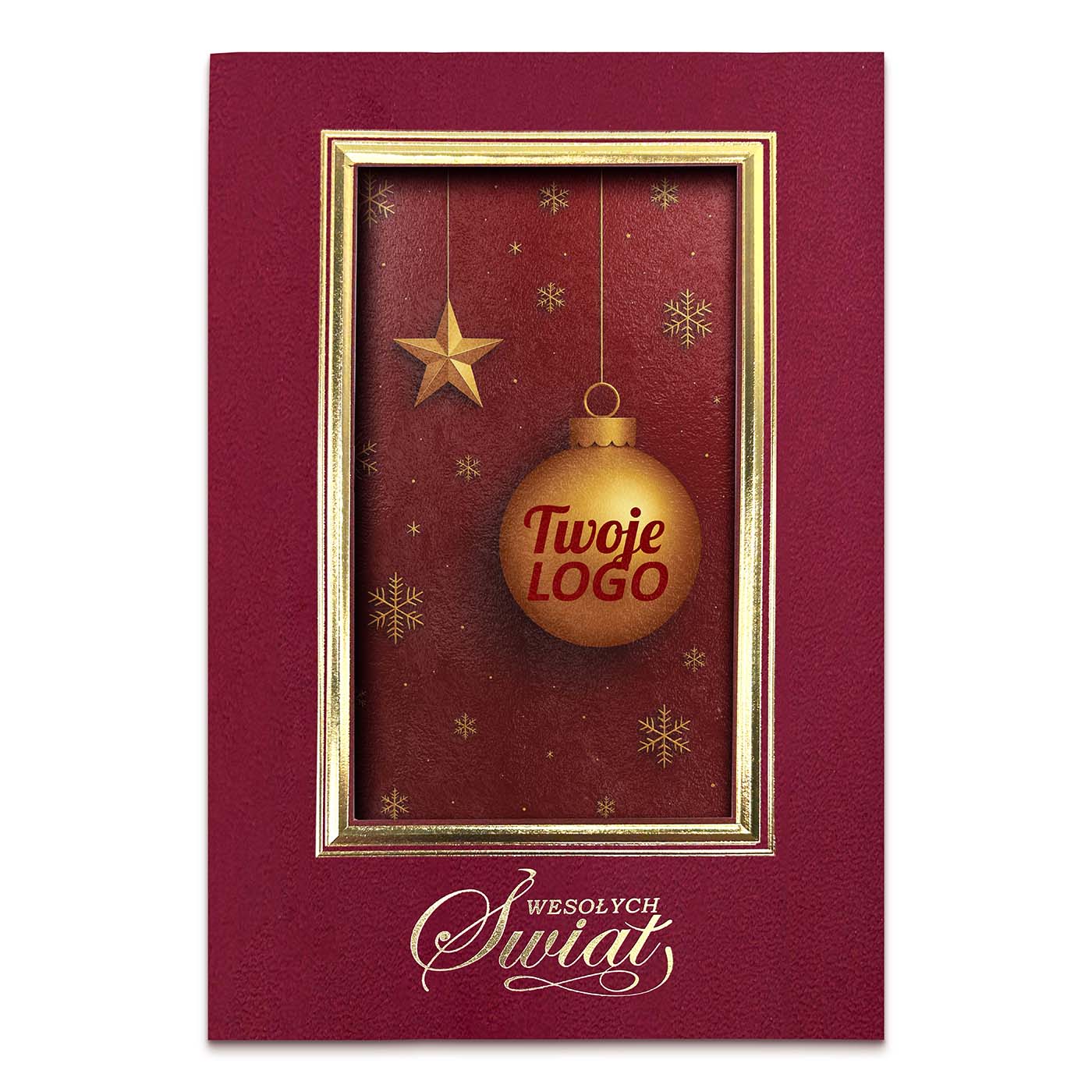 Elegancka kartka świąteczna utrzymana w odcieniach głębokiego bordo, ozdobiona świątecznym motywem bombki i gwiazdy. Na okładce znajduje się efektowna ramka z tłoczeniem i złoceniem, która dodaje prestiżowego charakteru. W centralnym punkcie przewidziano miejsce na nadruk logotypu, co czyni kartkę idealną propozycją dla firm.