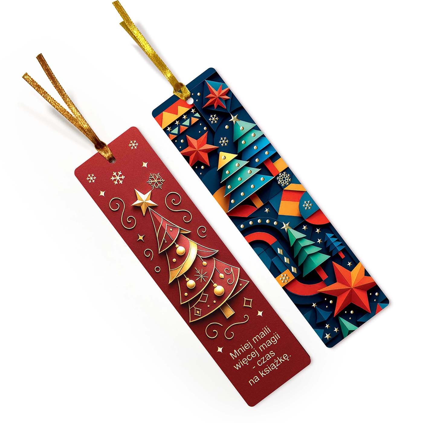 Elegancka, świąteczna zakładka do książki z efektowną grafiką po obu stronach, wzbogacona uszlachetnieniem w postaci przestrzennego złocenia 3D. Motywy bożonarodzeniowych choinek, gwiazd i śnieżynek zostały opracowane w stylu nowoczesnych, warstwowych ilustracji, które przyciągają wzrok i wprowadzają świąteczny nastrój. Na jednej ze stron umieszczono inspirujący napis: "Mniej maili, więcej magii - czas na książkę." Całość dopełnia delikatna, satynowa tasiemka w kolorze złotym, dzięki której zakładka nabiera charakteru eleganckiego upominku.