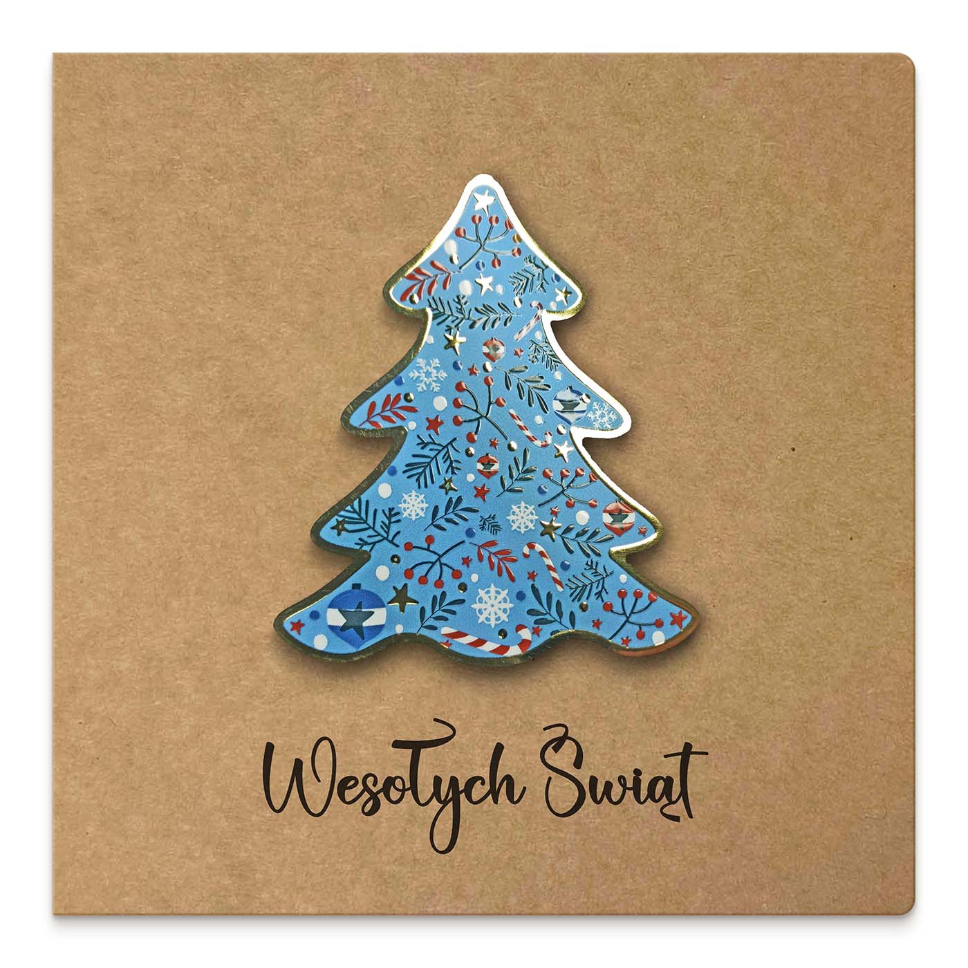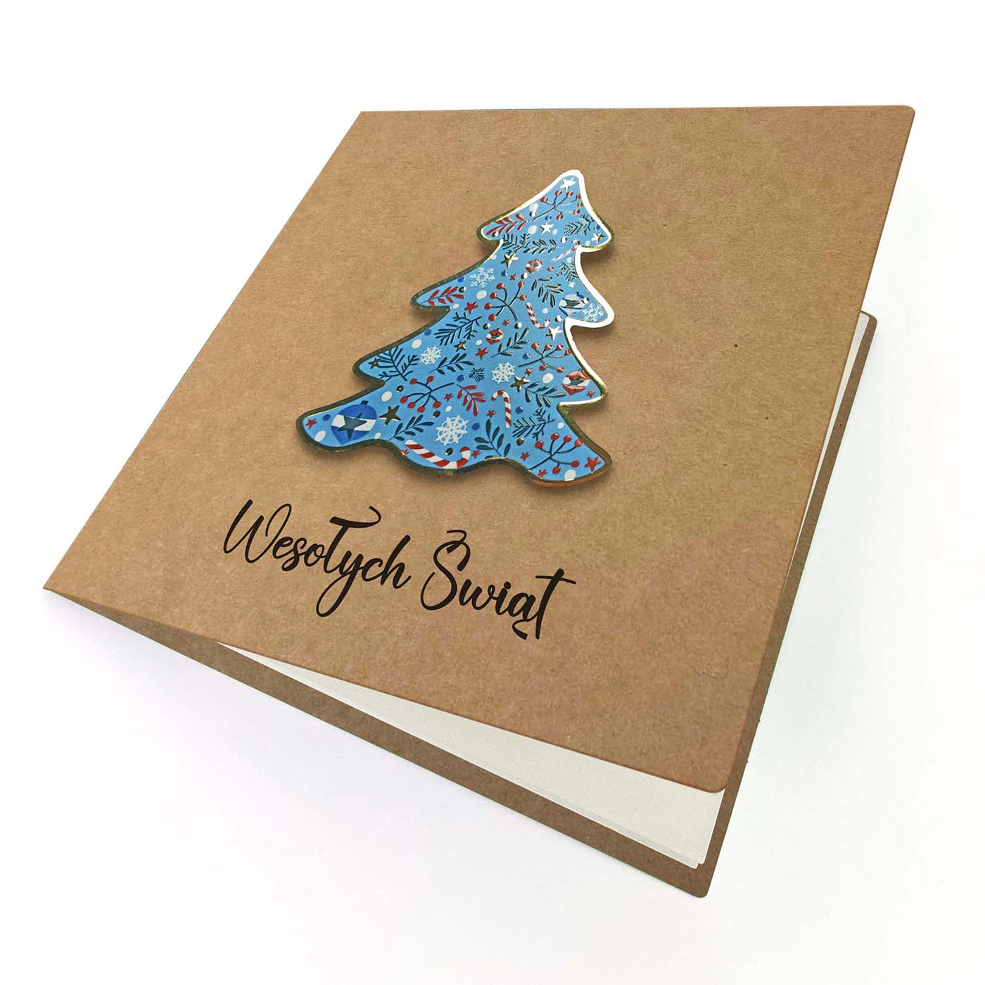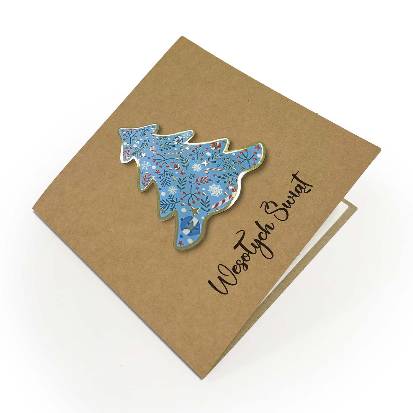 Unikalna kartka świąteczna z kolekcji ECO DESIGN, wykonana z kraftowego papieru z recyklingu i ozdobiona efektowną aplikacją 3D w kształcie choinki. Ażurowa choinka pokryta jest bogatym, zimowym ornamentem w odcieniach błękitu, czerwieni i bieli, a całość dopełniają luksusowe złocenia hotstampingiem w formie drobnych detali. Subtelny połysk nadaje karcie wyjątkowego uroku.