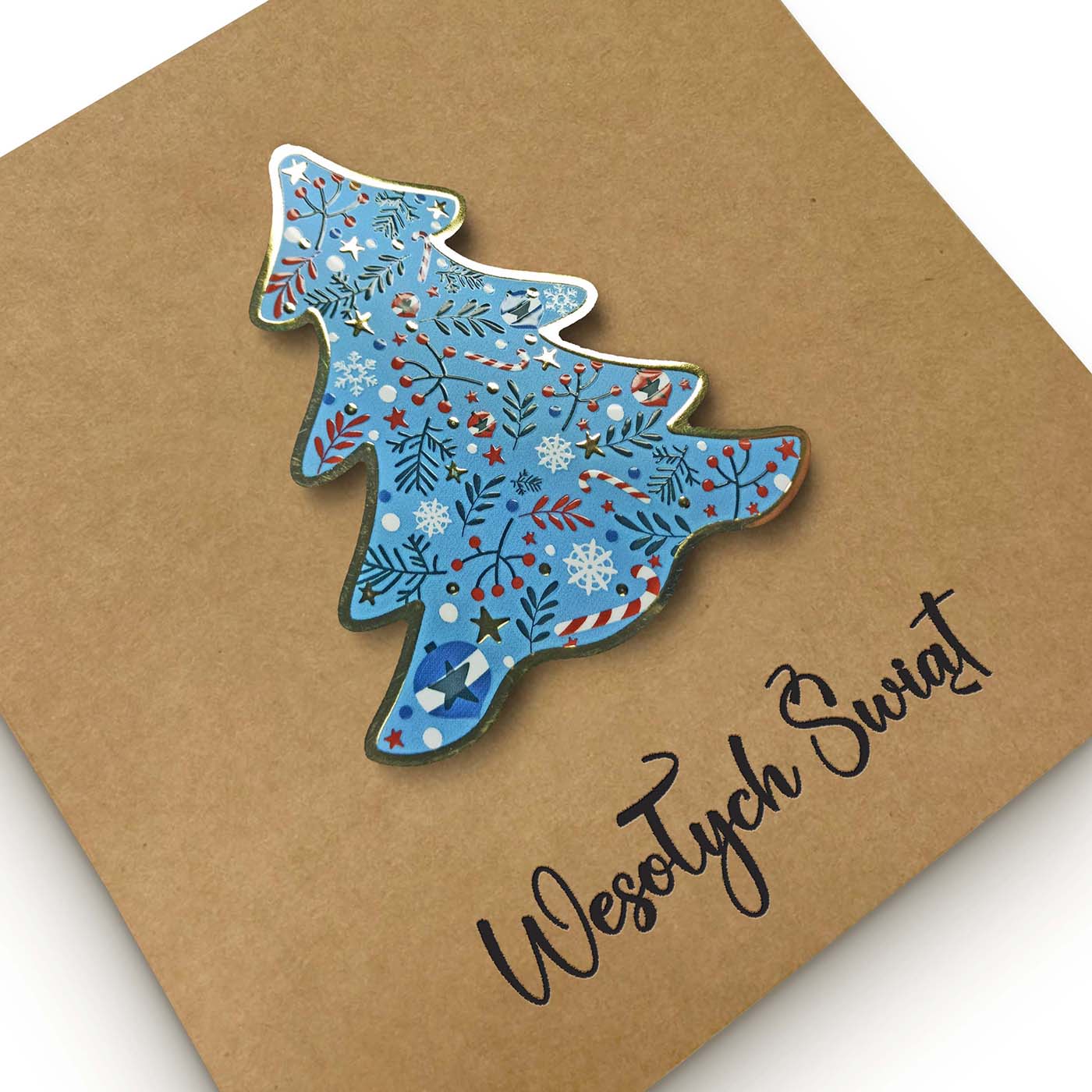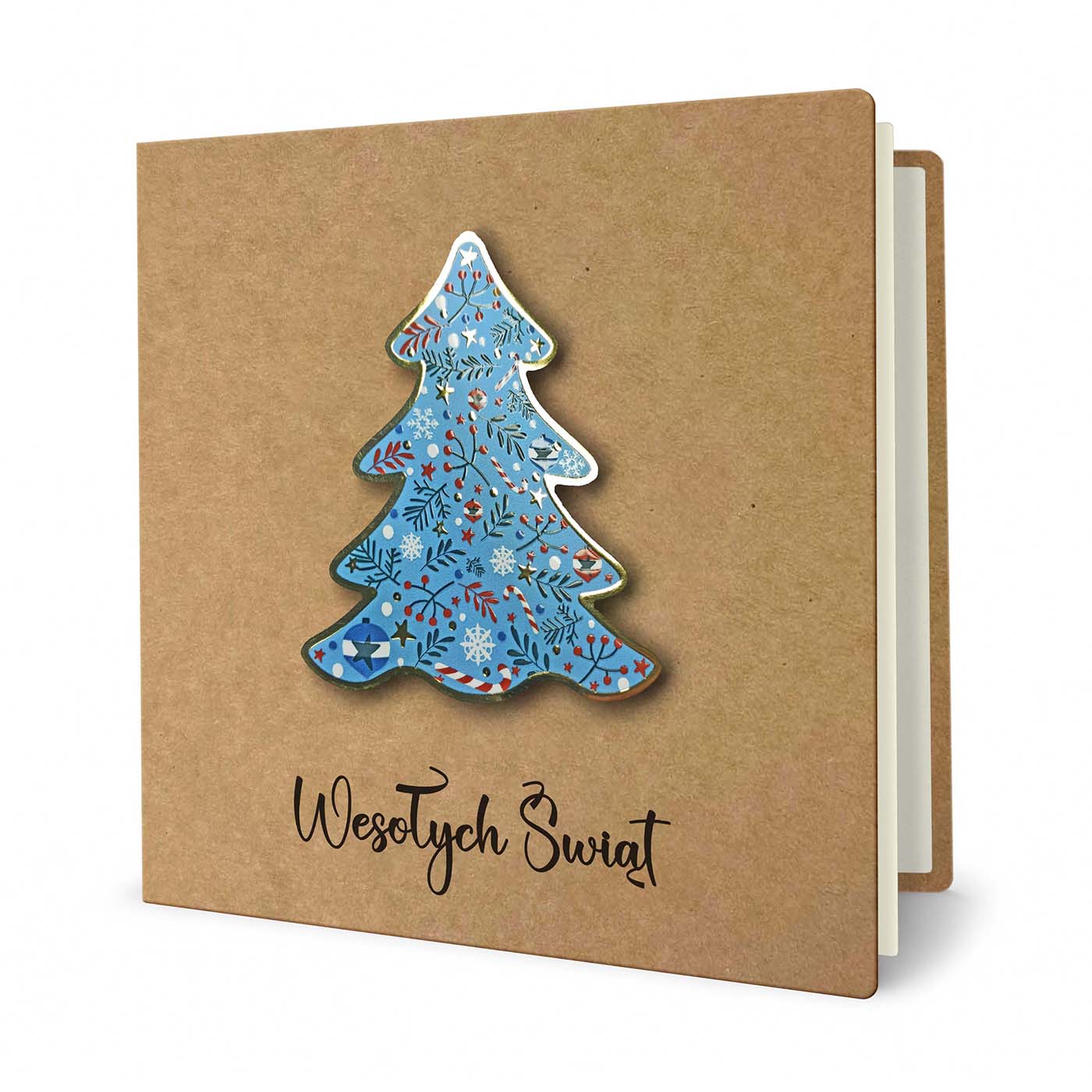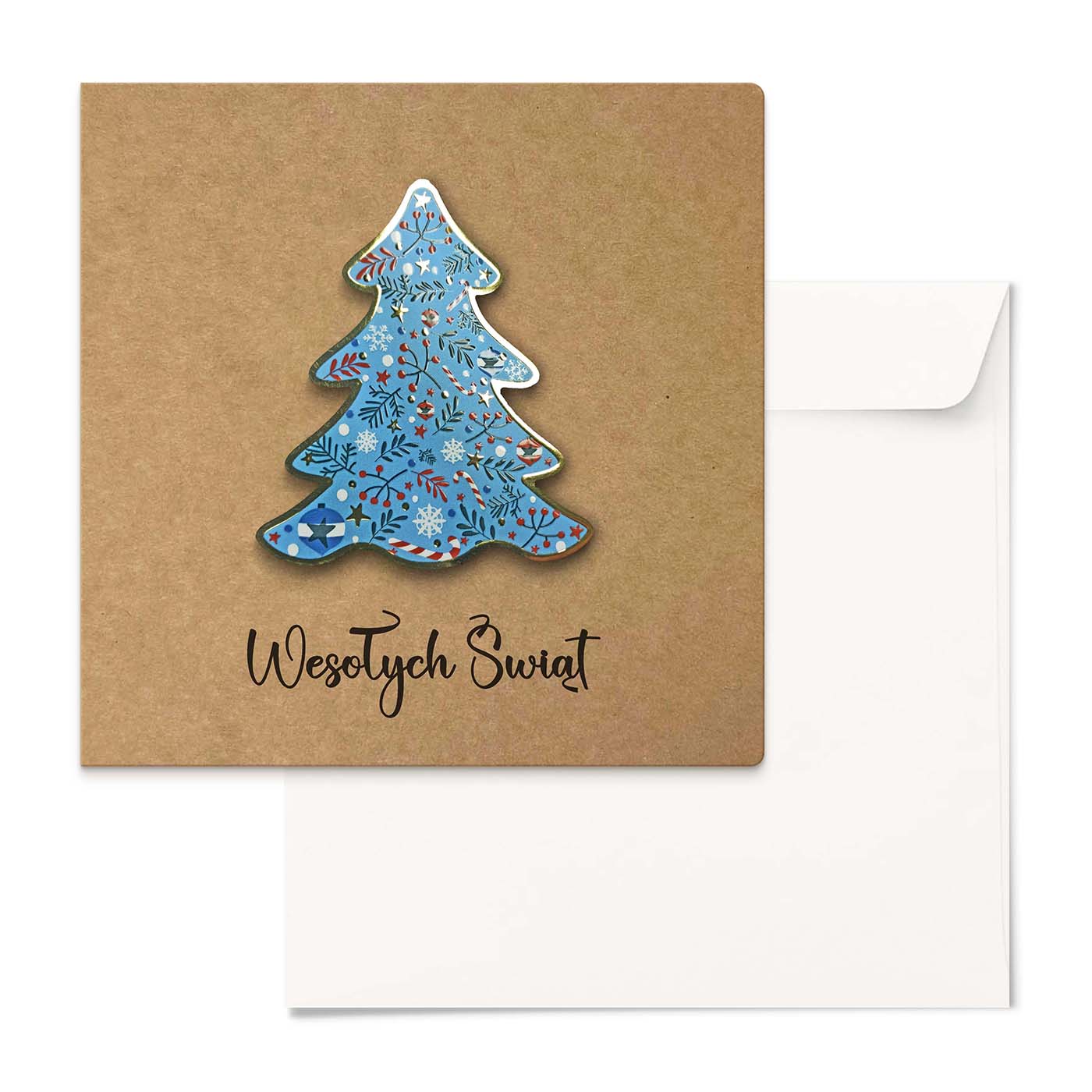 Unikalna kartka świąteczna z kolekcji ECO DESIGN, wykonana z kraftowego papieru z recyklingu i ozdobiona efektowną aplikacją 3D w kształcie choinki. Ażurowa choinka pokryta jest bogatym, zimowym ornamentem w odcieniach błękitu, czerwieni i bieli, a całość dopełniają luksusowe złocenia hotstampingiem w formie drobnych detali. Subtelny połysk nadaje karcie wyjątkowego uroku.
