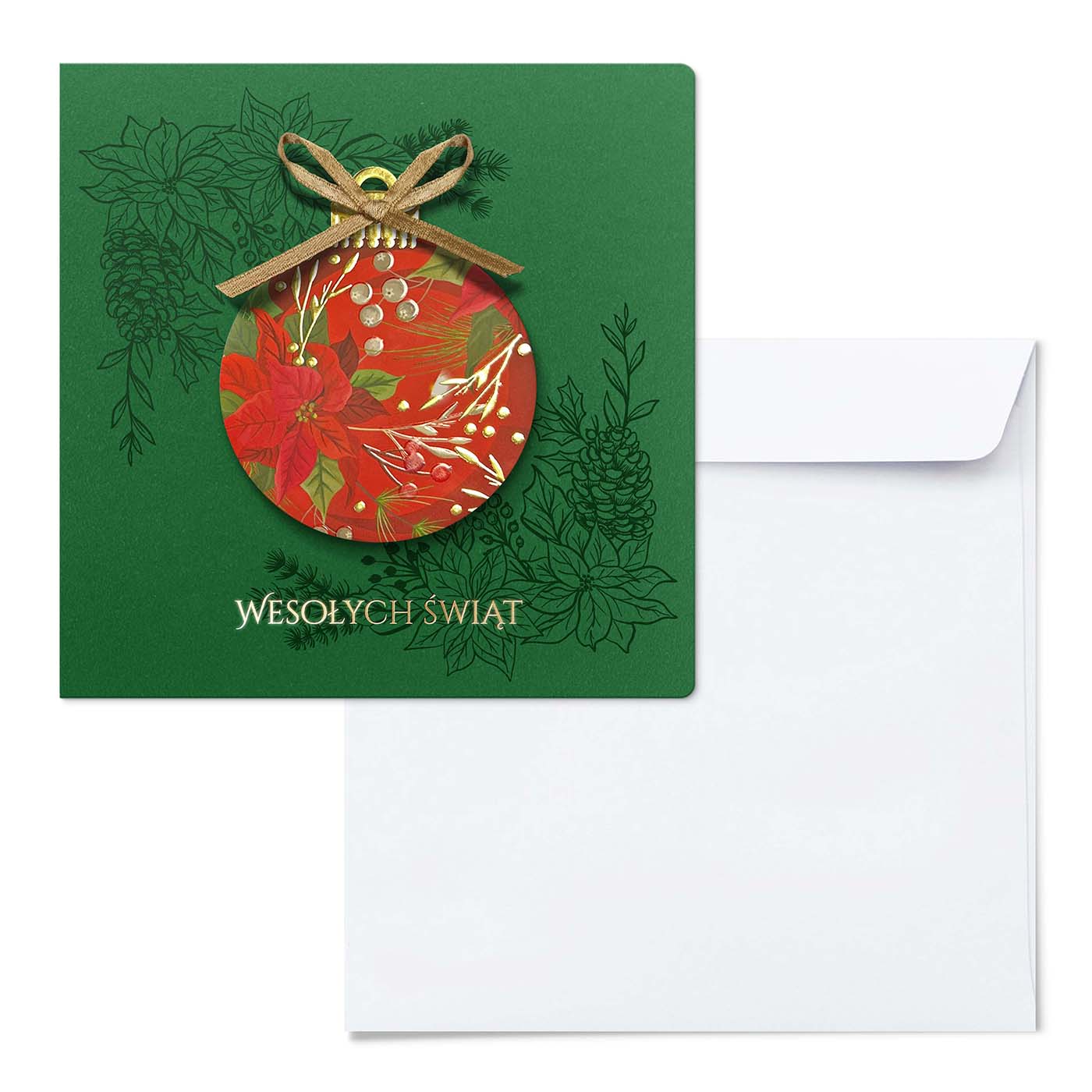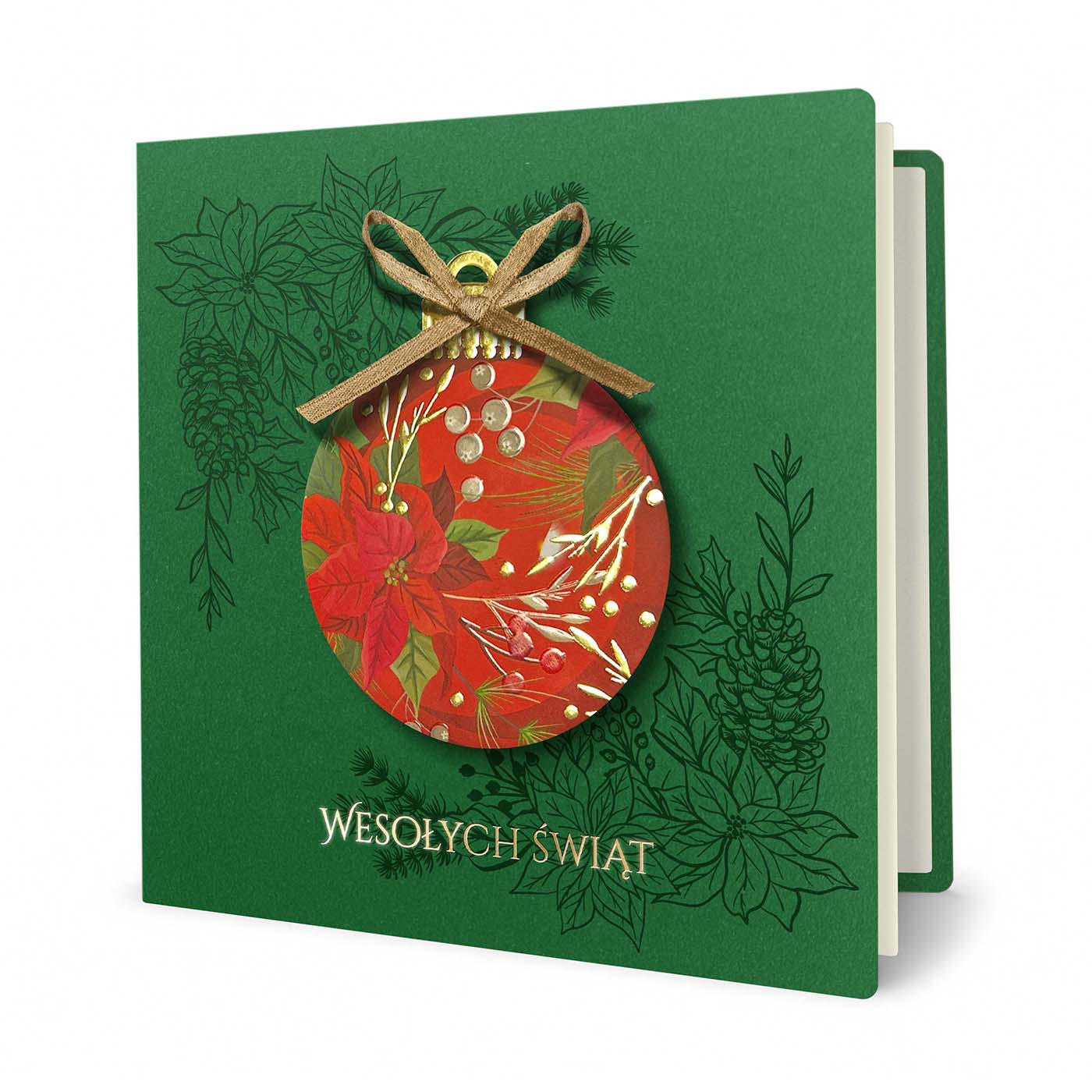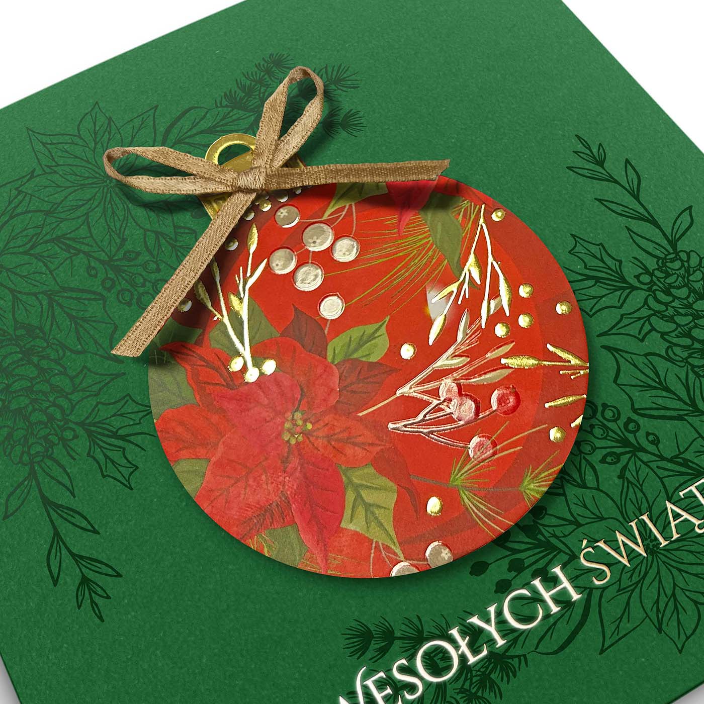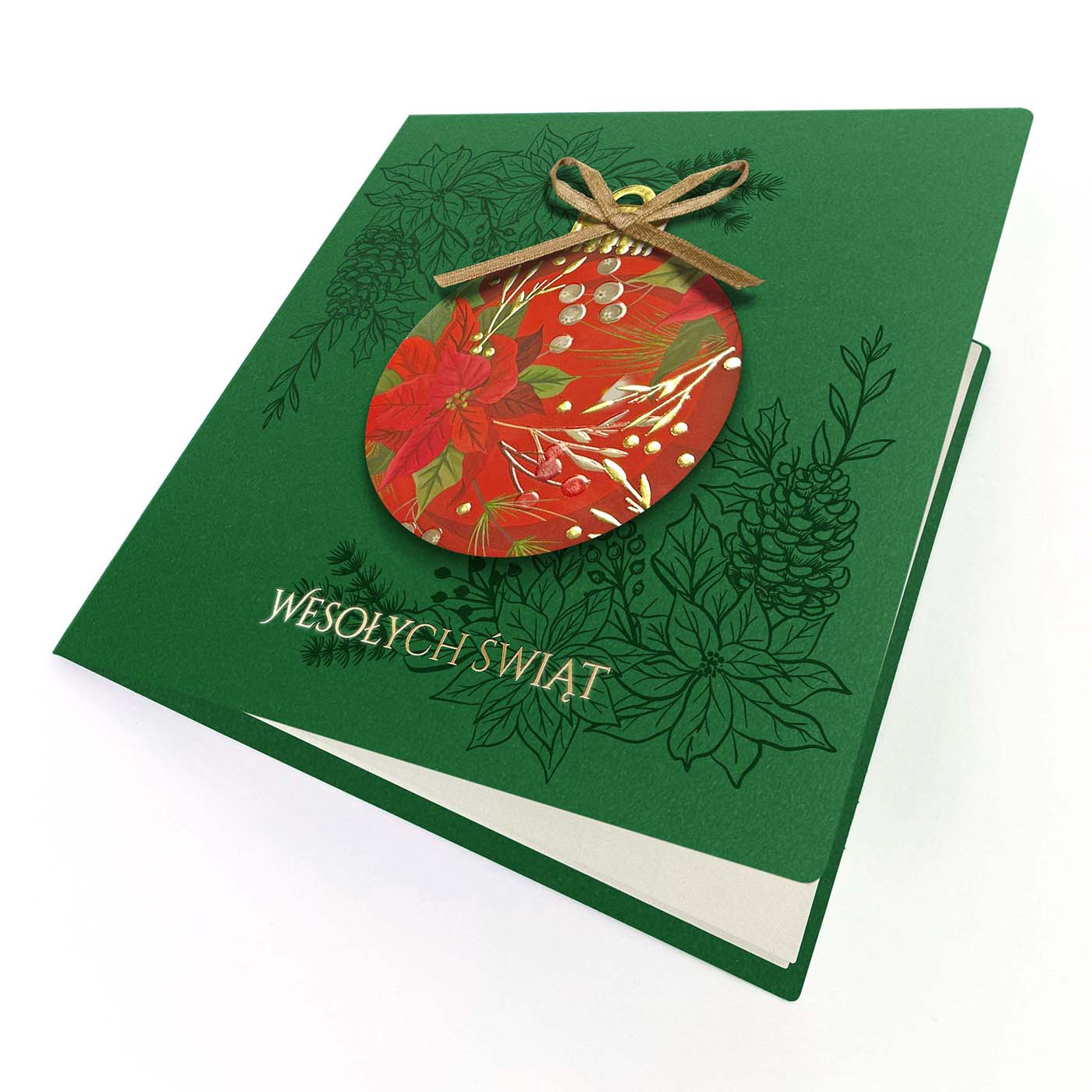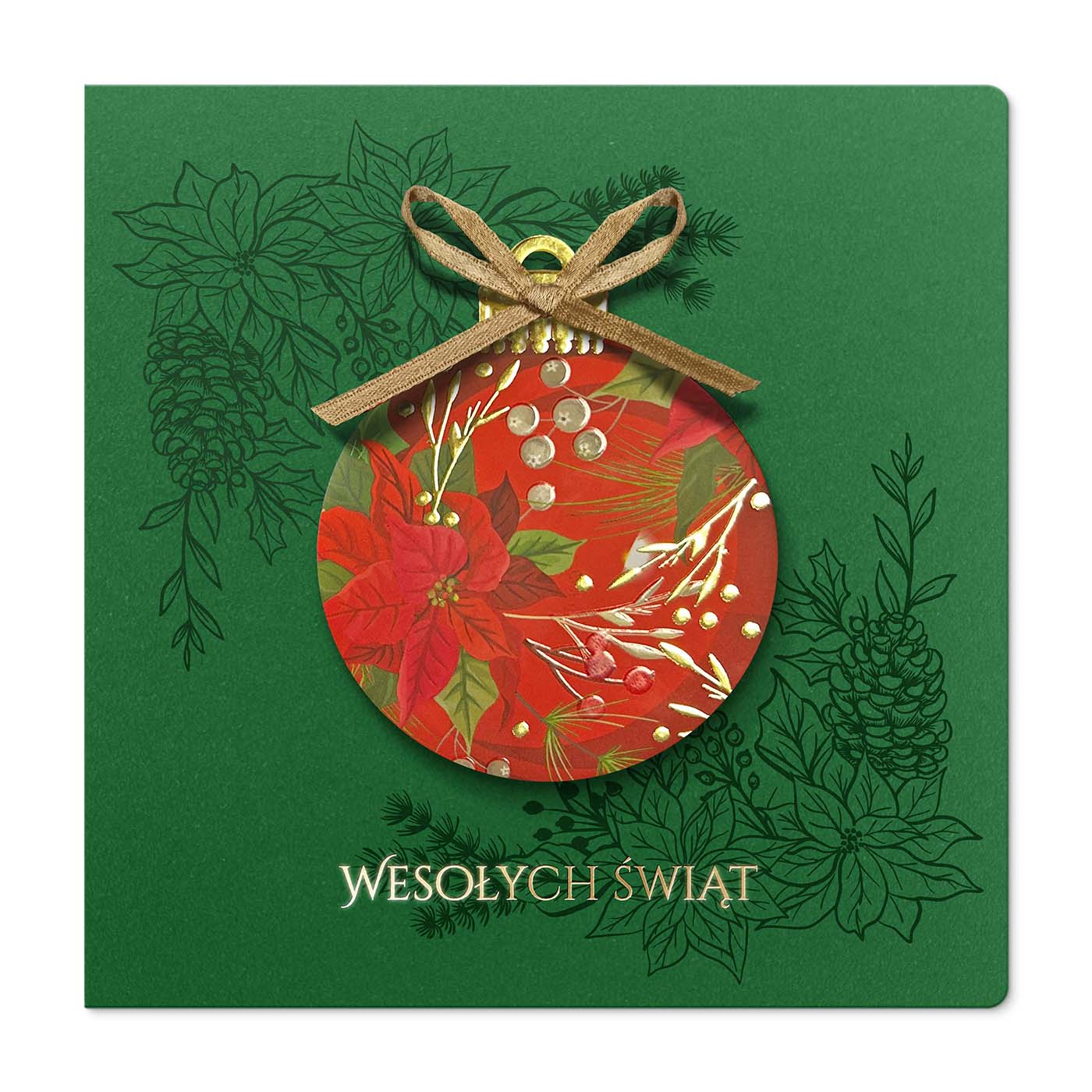 Ekskluzywna kartka świąteczna w formacie kwadratowym, wykonana z zielonego papieru barwionego w masie. Na okładce znajduje się przestrzenna aplikacja w postaci efektownej bombki 3D z motywem poinsecji, wzbogacona złoceniami i subtelnymi tłoczeniami. Całość dopełnia dekoracyjna, złota kokarda oraz elegancki nadruk "Wesołych Świąt".