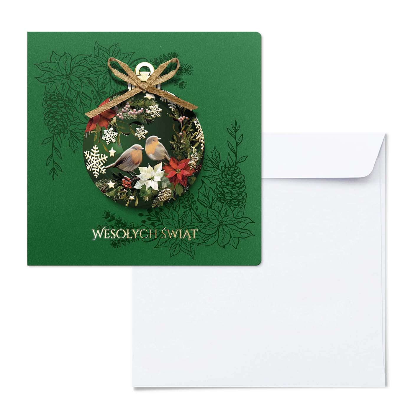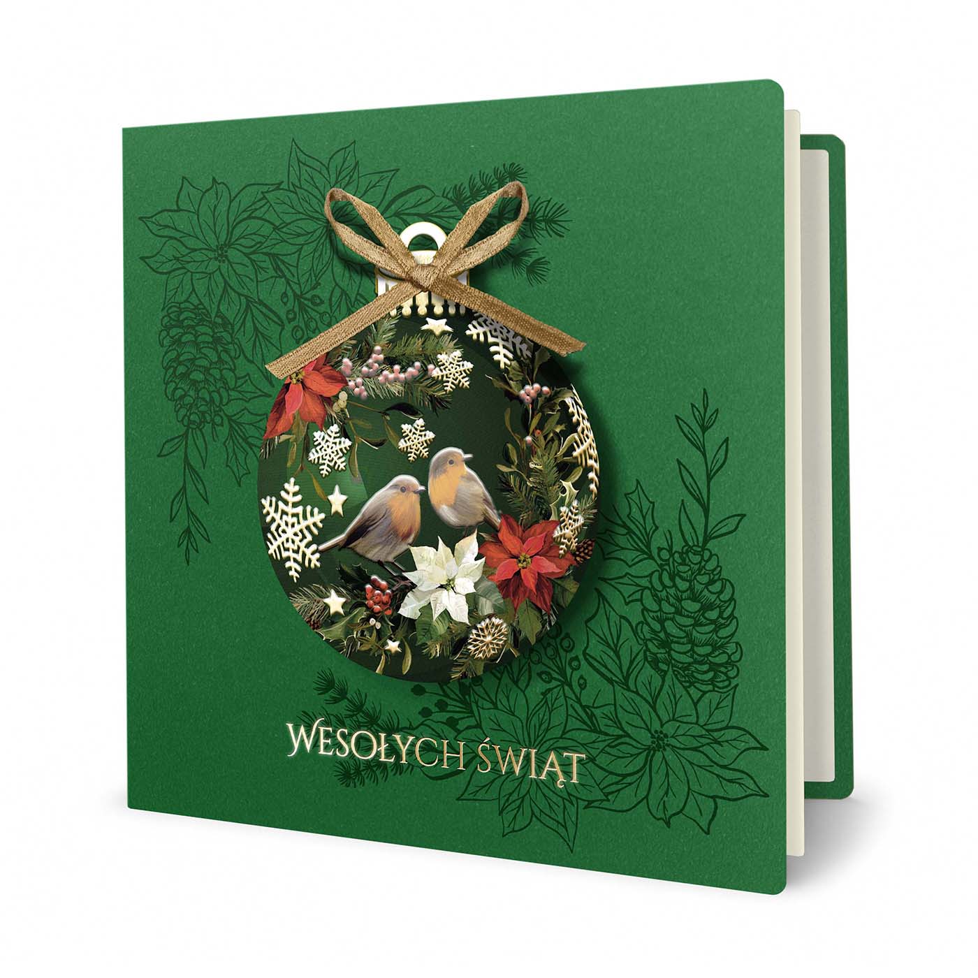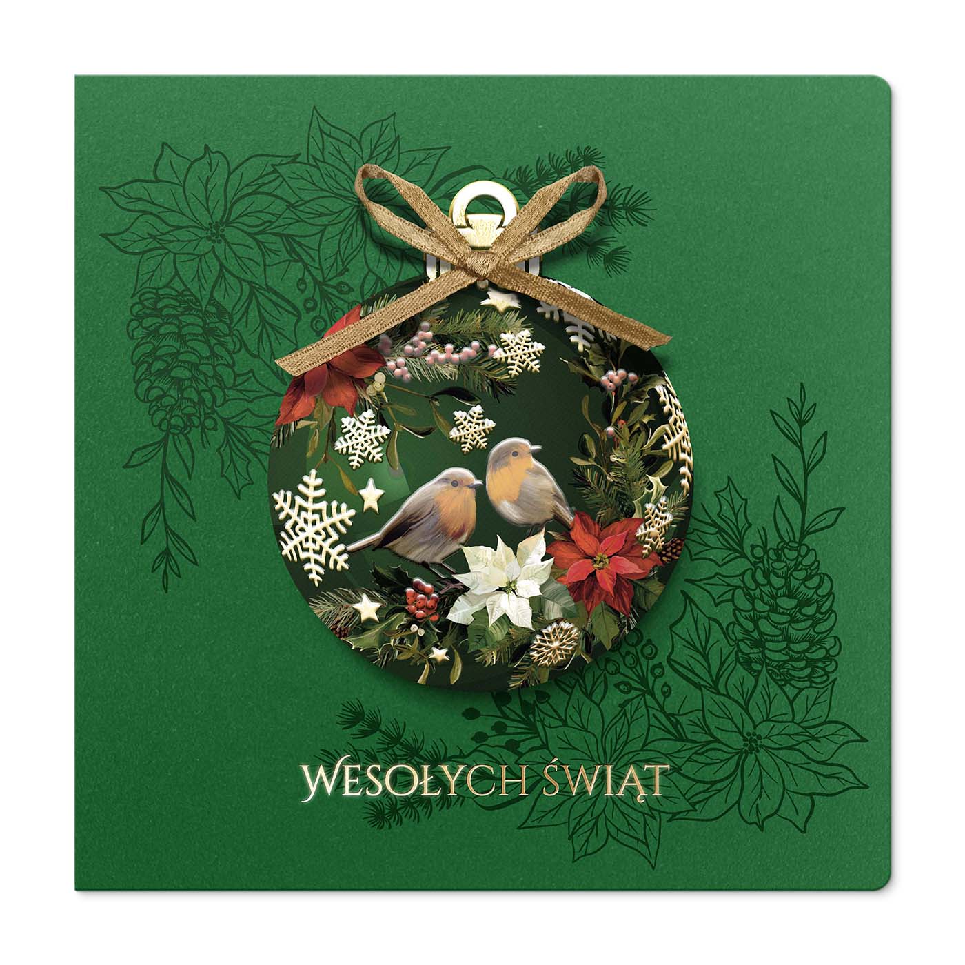 Ekskluzywna kartka świąteczna wykonana z wysokiej jakości zielonego papieru barwionego w masie o delikatnej, eleganckiej strukturze. Na okładce znajduje się efektowna aplikacja 3D w formie świątecznej bombki z ilustracją dwóch rudzików pośród zimowej kompozycji z poinsecji, ostrokrzewu, śnieżynek i zielonych gałązek. Bombka została wzbogacona złoceniem oraz przestrzennym wykończeniem, a całość dopełnia dekoracyjna kokardka ze złotej tasiemki.