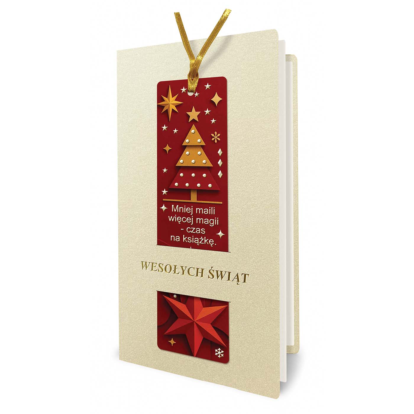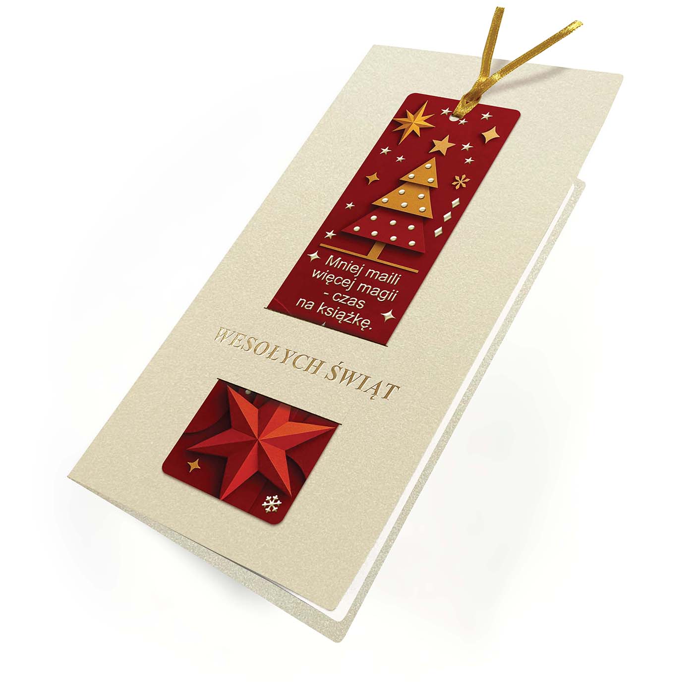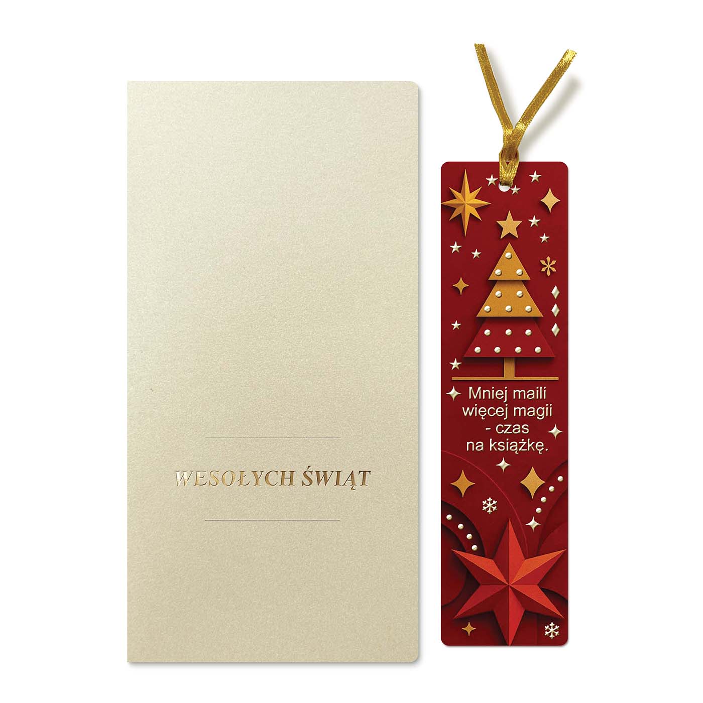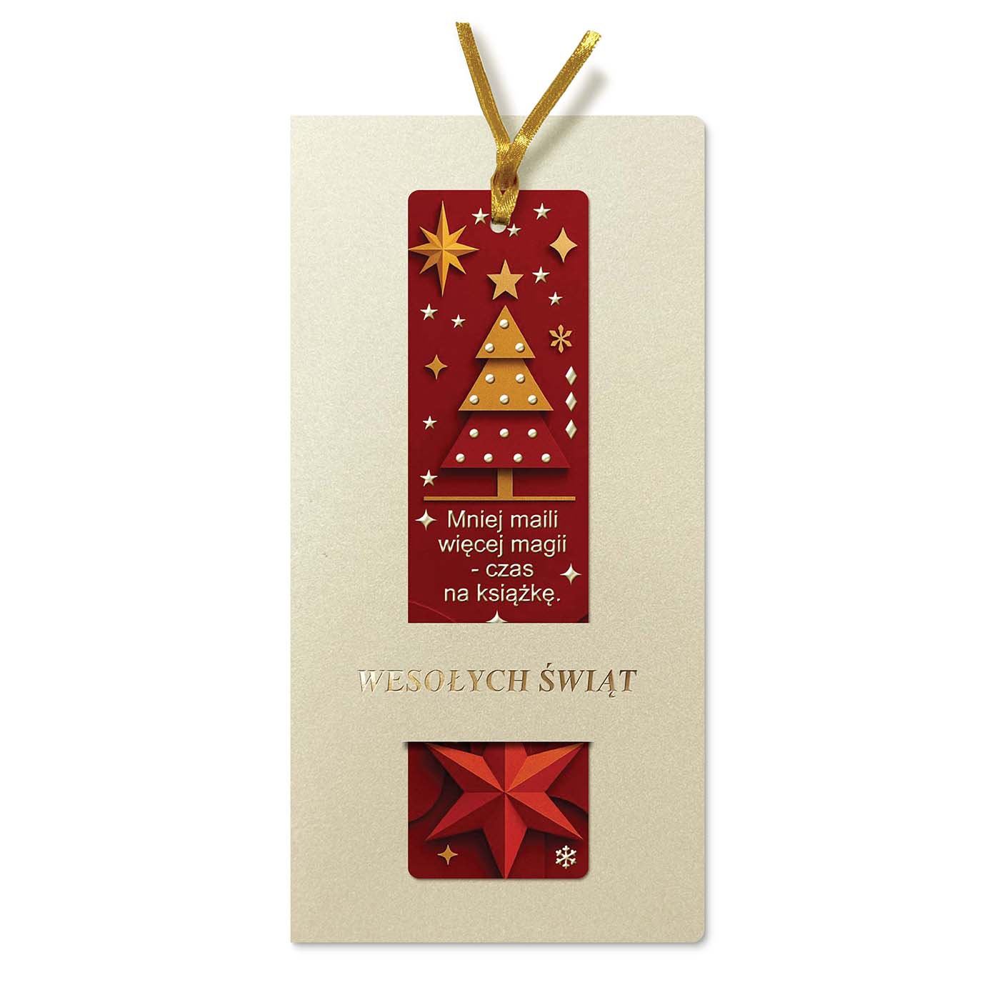 Elegancka kartka świąteczna z praktyczną zakładką do książki, idealna jako firmowy upominek lub oryginalny dodatek do życzeń. Na froncie umieszczono wyjmowaną zakładkę w intensywnie czerwonym kolorze, zdobioną złotą choinką, gwiazdami i napisem "Mniej maili, więcej magii - czas na książkę". Dolną część okładki zdobi motyw przestrzennej czerwonej gwiazdy. Napis "Wesołych Świąt" wykonano techniką hotstampingu w złotym kolorze, co nadaje całości luksusowego charakteru.
