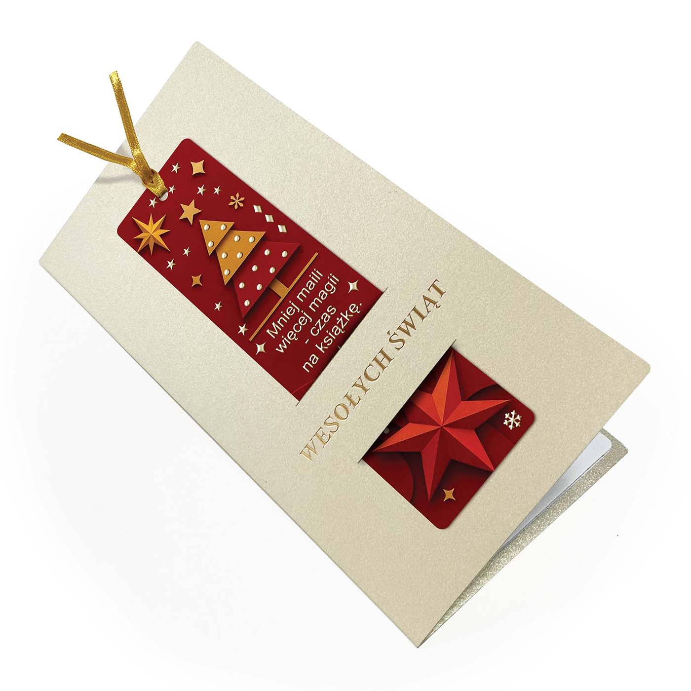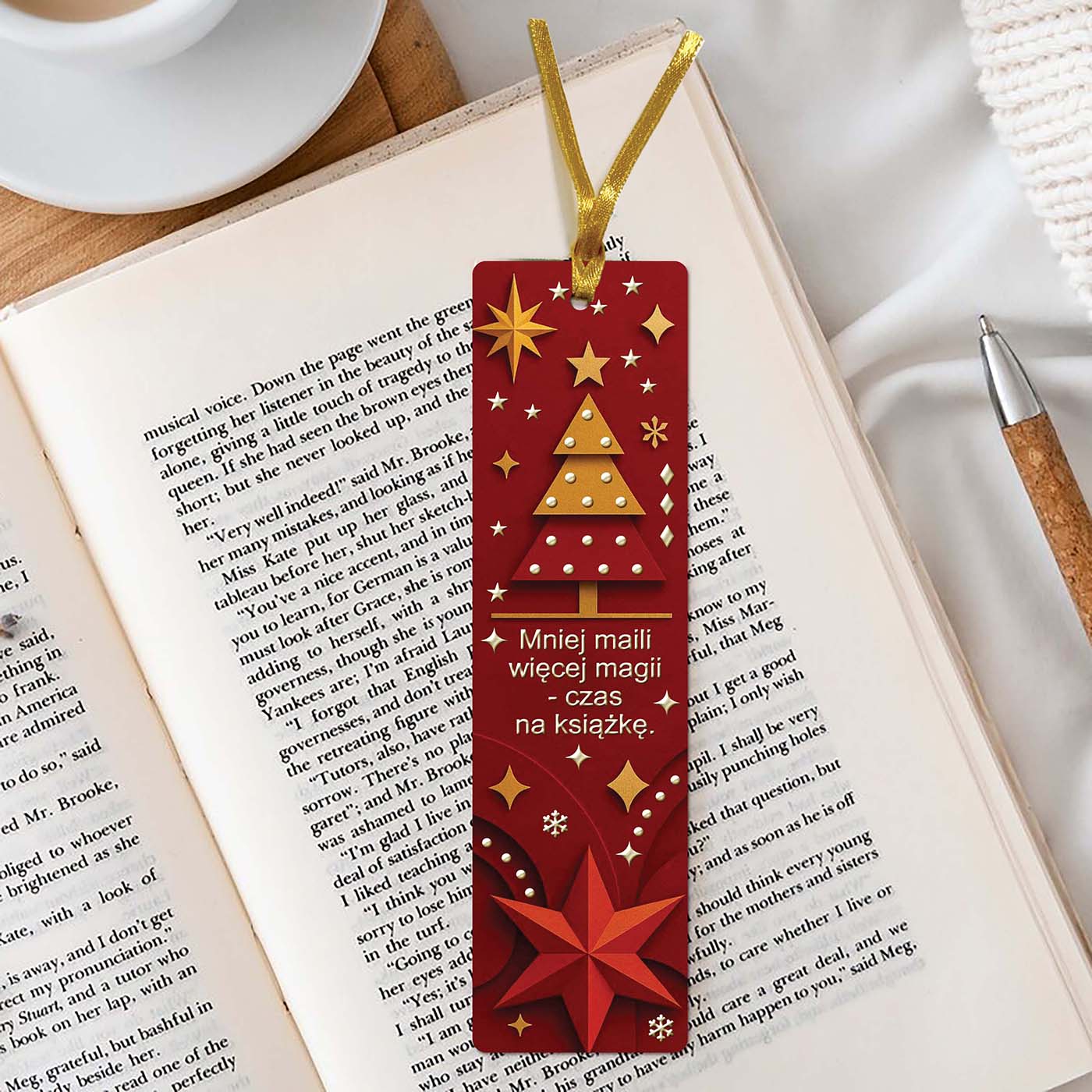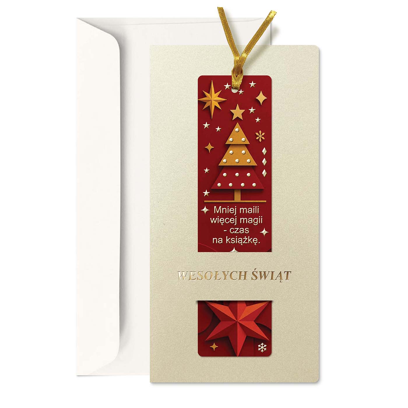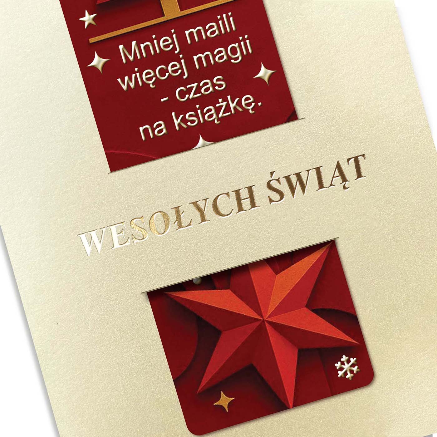 Elegancka kartka świąteczna z praktyczną zakładką do książki, idealna jako firmowy upominek lub oryginalny dodatek do życzeń. Na froncie umieszczono wyjmowaną zakładkę w intensywnie czerwonym kolorze, zdobioną złotą choinką, gwiazdami i napisem "Mniej maili, więcej magii - czas na książkę". Dolną część okładki zdobi motyw przestrzennej czerwonej gwiazdy. Napis "Wesołych Świąt" wykonano techniką hotstampingu w złotym kolorze, co nadaje całości luksusowego charakteru.