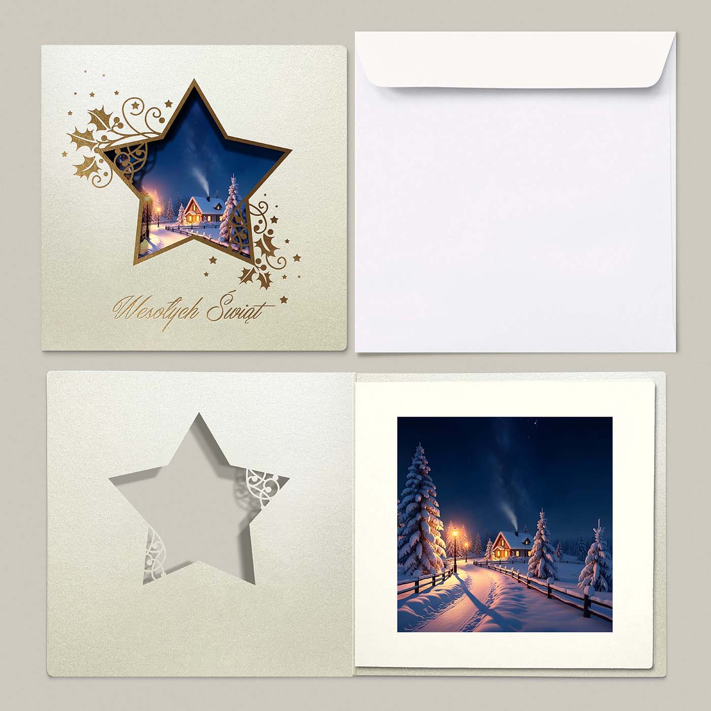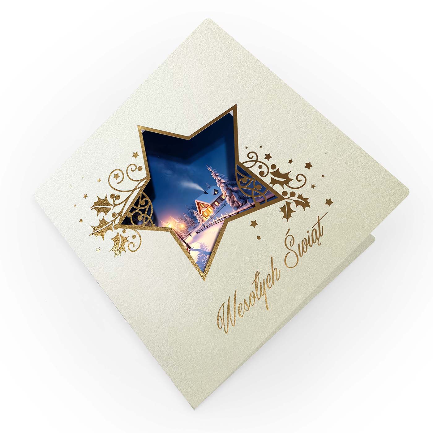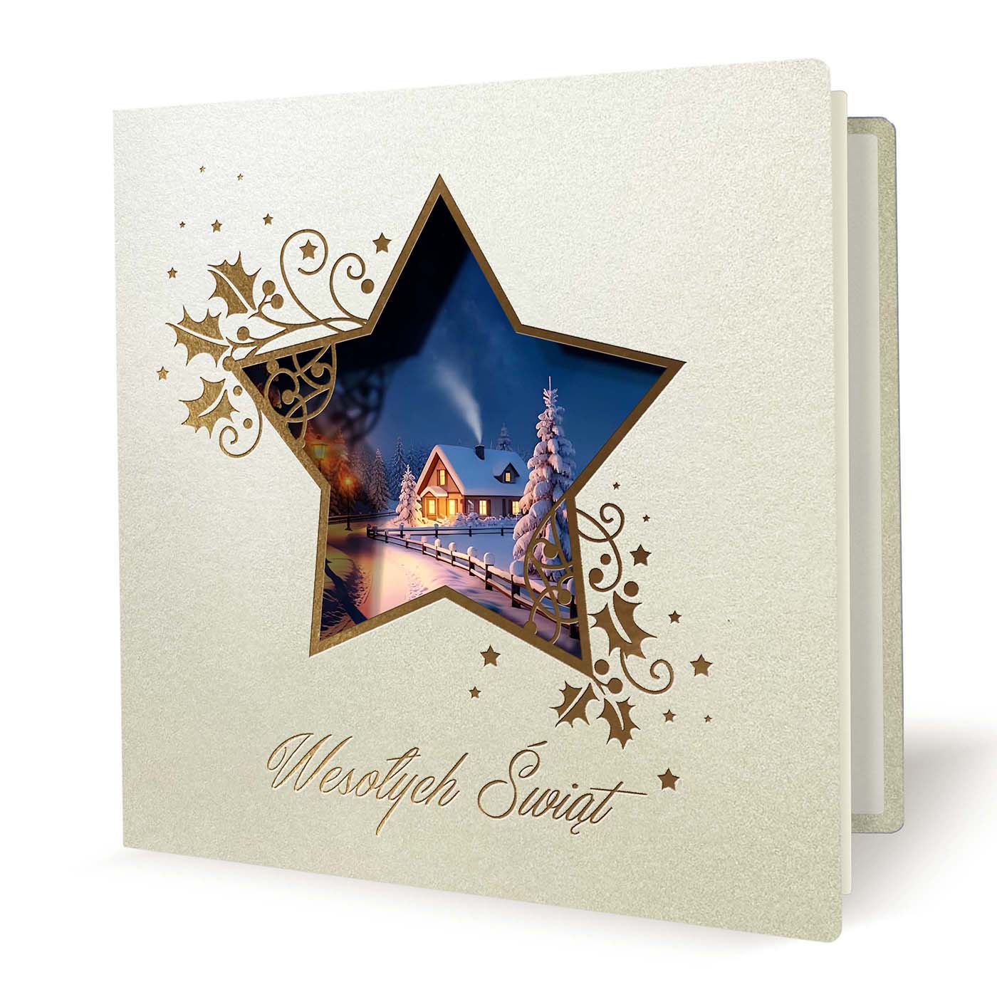 Elegancka kartka świąteczna wykonana z wysokiej jakości metalizowanego papieru w odcieniu ecru. Na okładce znajduje się precyzyjnie wycięty laserowo motyw dużej gwiazdy, wewnątrz której umieszczono nastrojową ilustrację zimowego krajobrazu - ośnieżony dom z rozświetlonymi oknami, otoczony świerkami i spokojną, zimową scenerią. Całość uzupełniają złocone ornamenty z motywem ostrokrzewu, drobne gwiazdki oraz elegancki napis Wesołych Świąt wykonany techniką hotstampingu.
