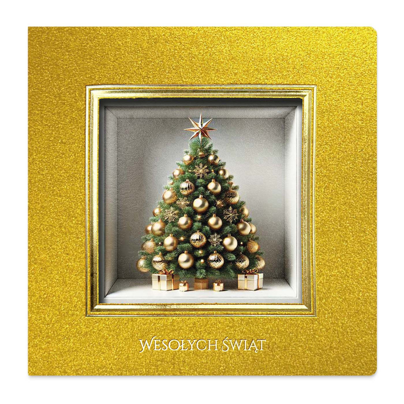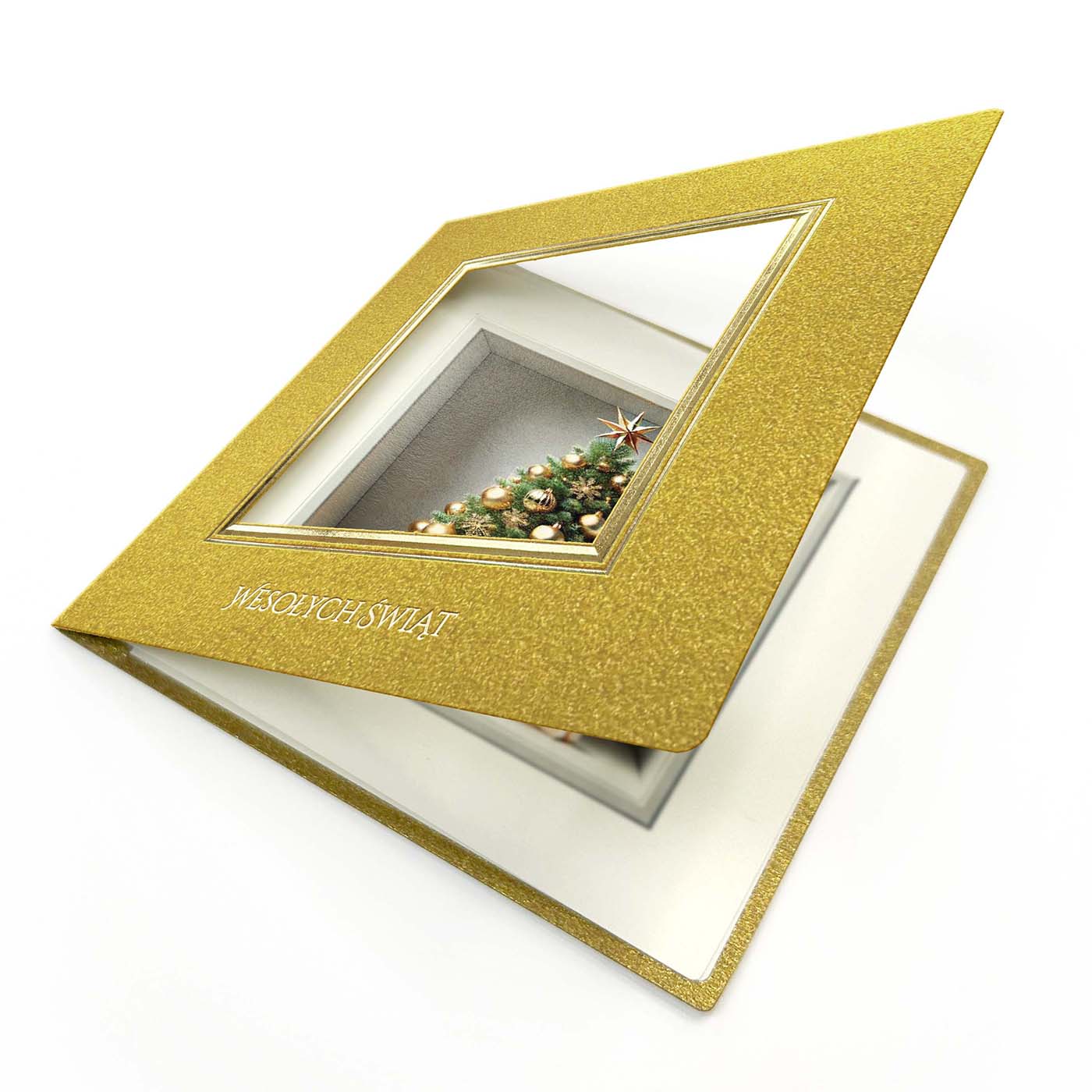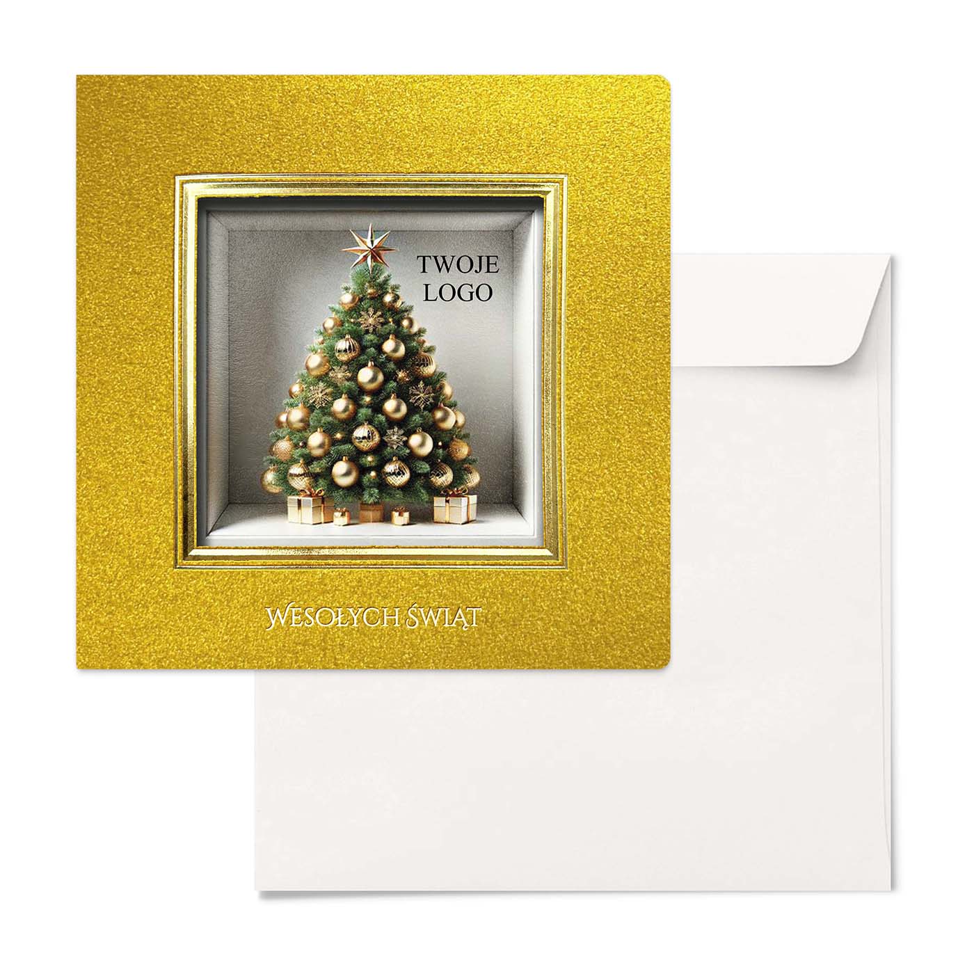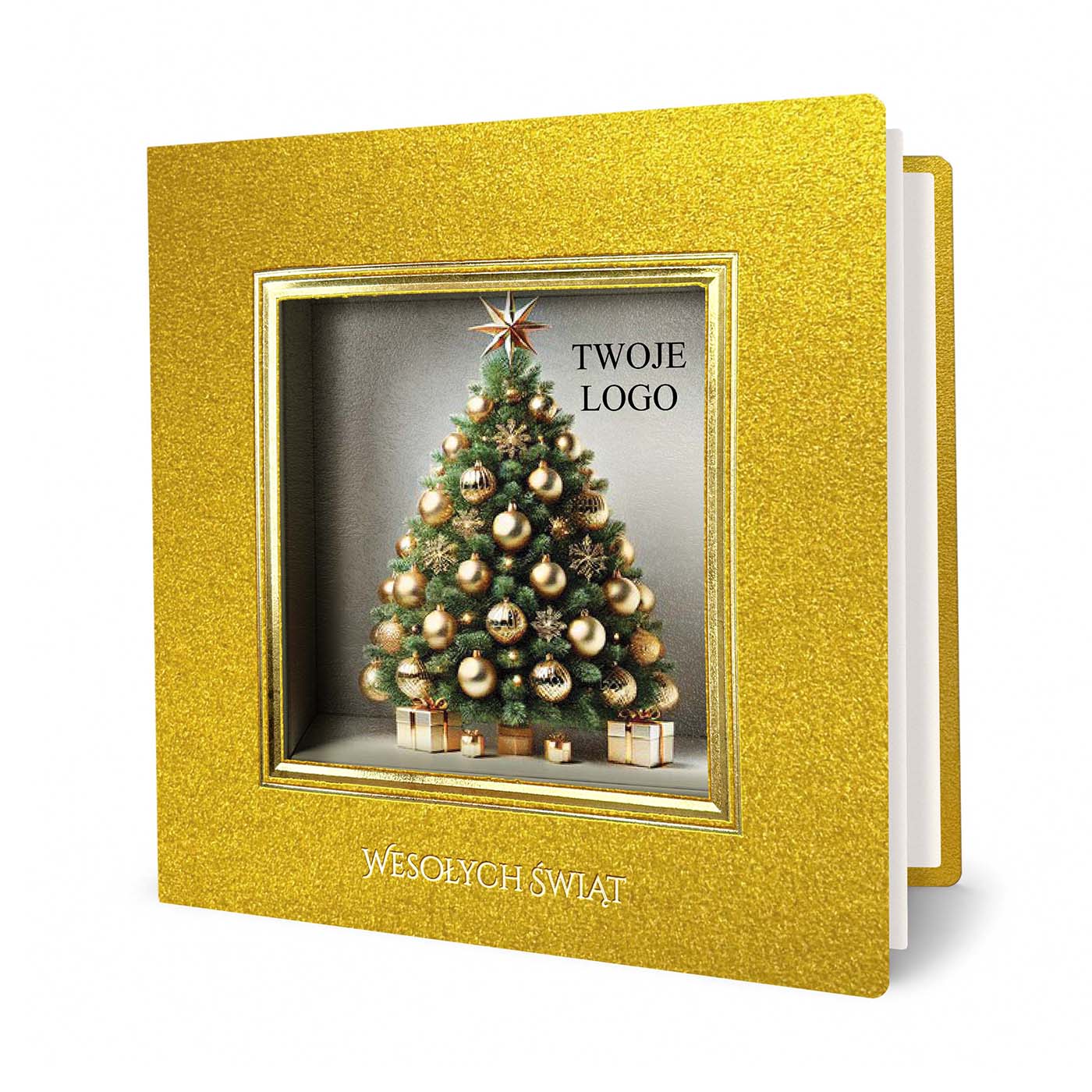 Elegancka kartka świąteczna wykonana z metalizowanego papieru w intensywnym złotym kolorze, który zachwyca swoim luksusowym połyskiem. Centralnym elementem jest przestrzenne okienko w formie złotej ramki, w którym umieszczono grafikę pięknej choinki udekorowanej złotymi bombkami i gwiazdą na szczycie. Pod drzewkiem znajdują się świąteczne prezenty, a obok - miejsce na nadruk logo firmy, które nadaje kartce indywidualny, biznesowy charakter. Złocony napis "Wesołych Świąt" wykonany techniką hotstampingu na dole okładki podkreśla elegancję projektu.