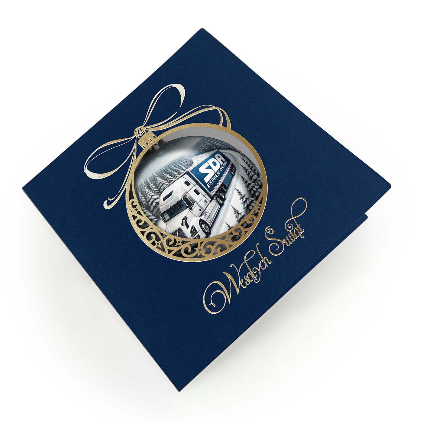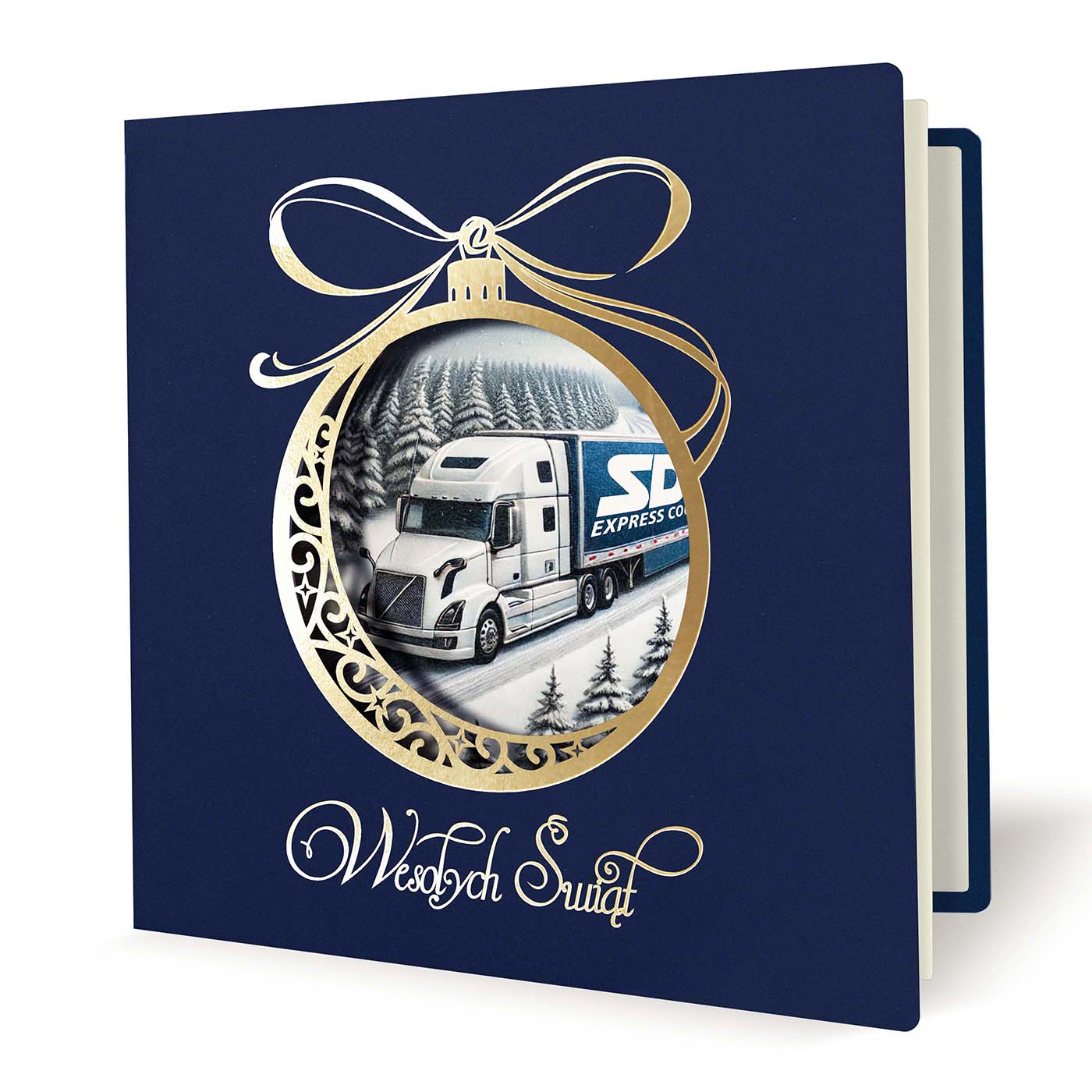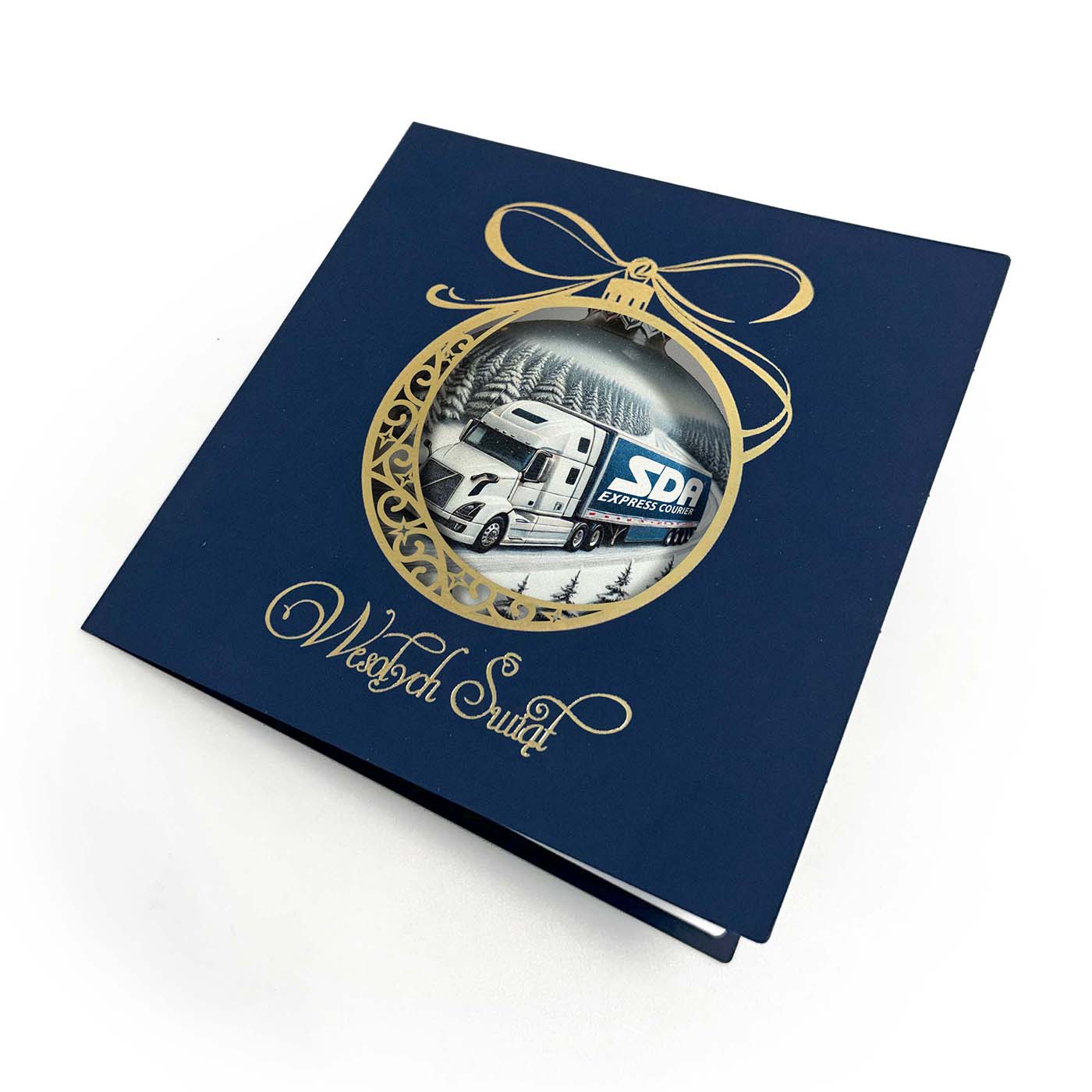 Ekskluzywna kartka świąteczna o unikalnym charakterze, wykonana z wysokiej jakości papieru w eleganckim granatowym kolorze. Centralnym elementem jest precyzyjnie wycięta laserowo bombka, ozdobiona złoconymi detalami i napisem Wesołych Świąt. Wewnątrz bombki znajduje się grafika przygotowana na indywidualne zamówienie - może to być Twoje logo, herb miasta, budynek firmy, maszyna z branży budowlanej czy produkt, który chcesz wypromować w świątecznym klimacie.