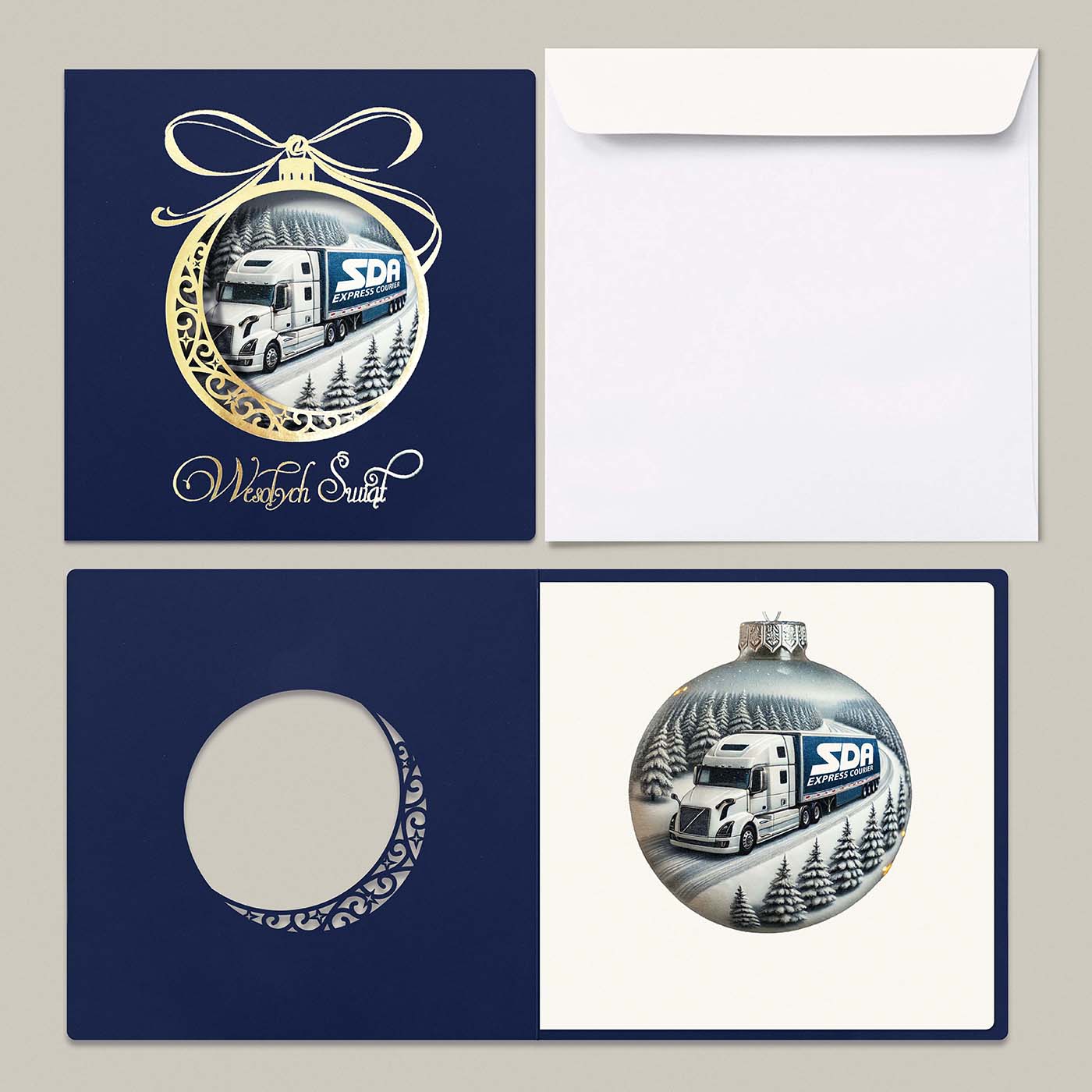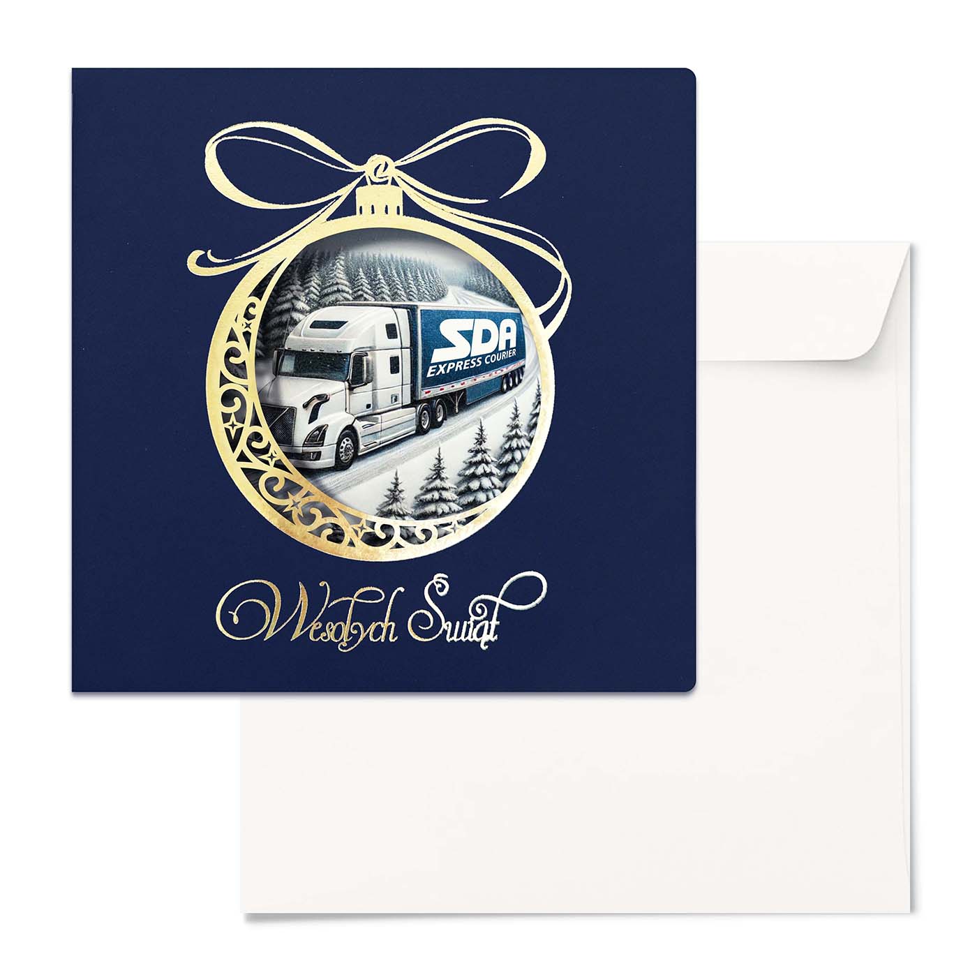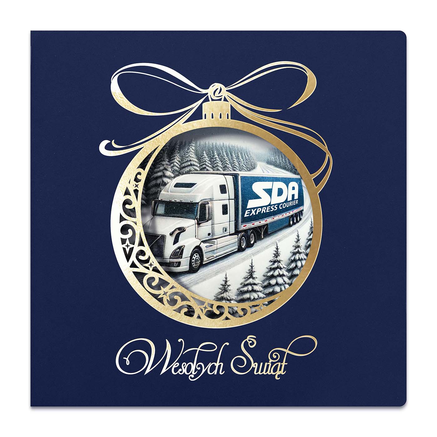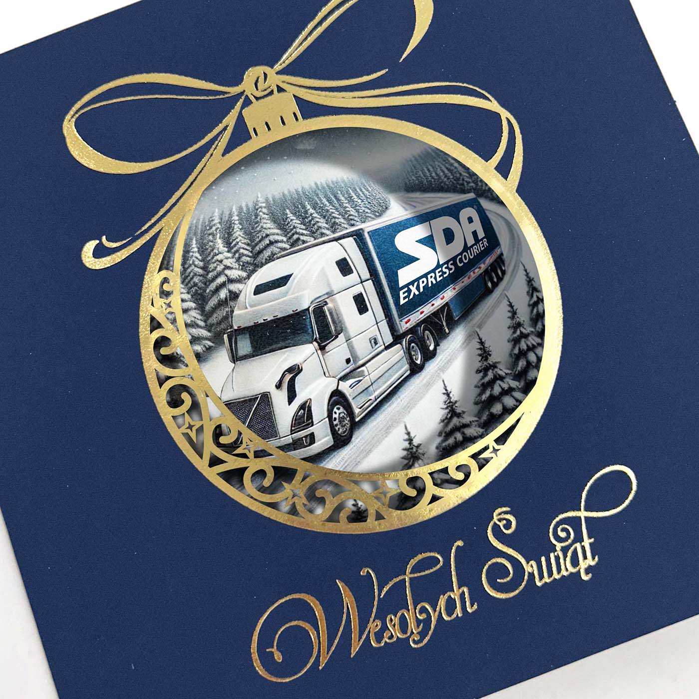 Ekskluzywna kartka świąteczna o unikalnym charakterze, wykonana z wysokiej jakości papieru w eleganckim granatowym kolorze. Centralnym elementem jest precyzyjnie wycięta laserowo bombka, ozdobiona złoconymi detalami i napisem Wesołych Świąt. Wewnątrz bombki znajduje się grafika przygotowana na indywidualne zamówienie - może to być Twoje logo, herb miasta, budynek firmy, maszyna z branży budowlanej czy produkt, który chcesz wypromować w świątecznym klimacie.