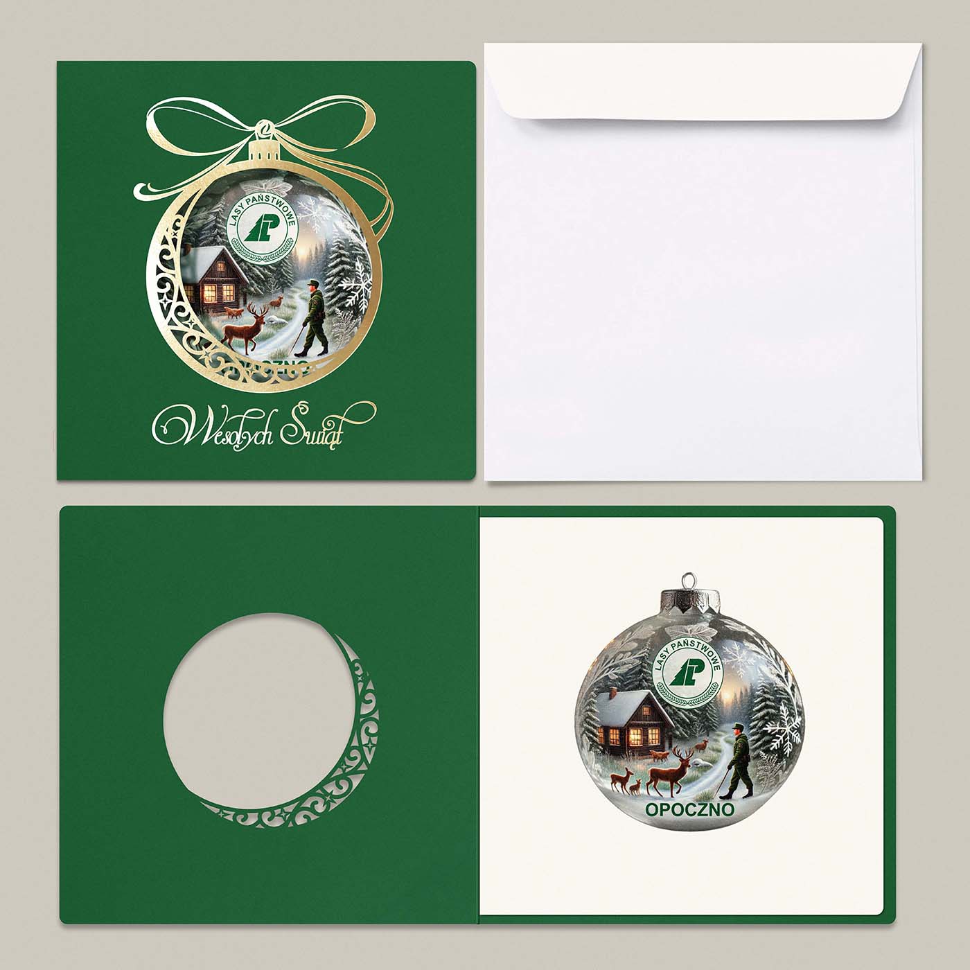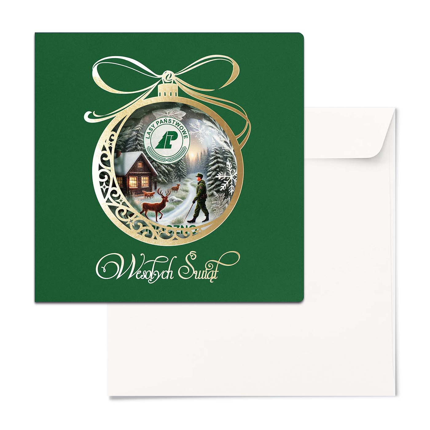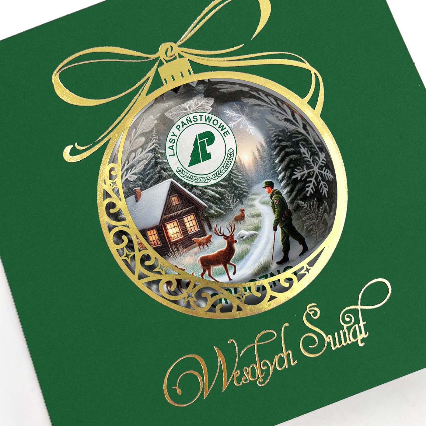 Ekskluzywna kartka świąteczna o unikalnym charakterze, wykonana z wysokiej jakości papieru w eleganckim zielonym kolorze. Centralnym elementem jest precyzyjnie wycięta laserowo bombka, ozdobiona złoconymi detalami i napisem Wesołych Świąt. Wewnątrz bombki znajduje się grafika przygotowana na indywidualne zamówienie - może to być Twoje logo, herb miasta, budynek firmy, maszyna z branży budowlanej czy produkt, który chcesz wypromować w świątecznym klimacie.