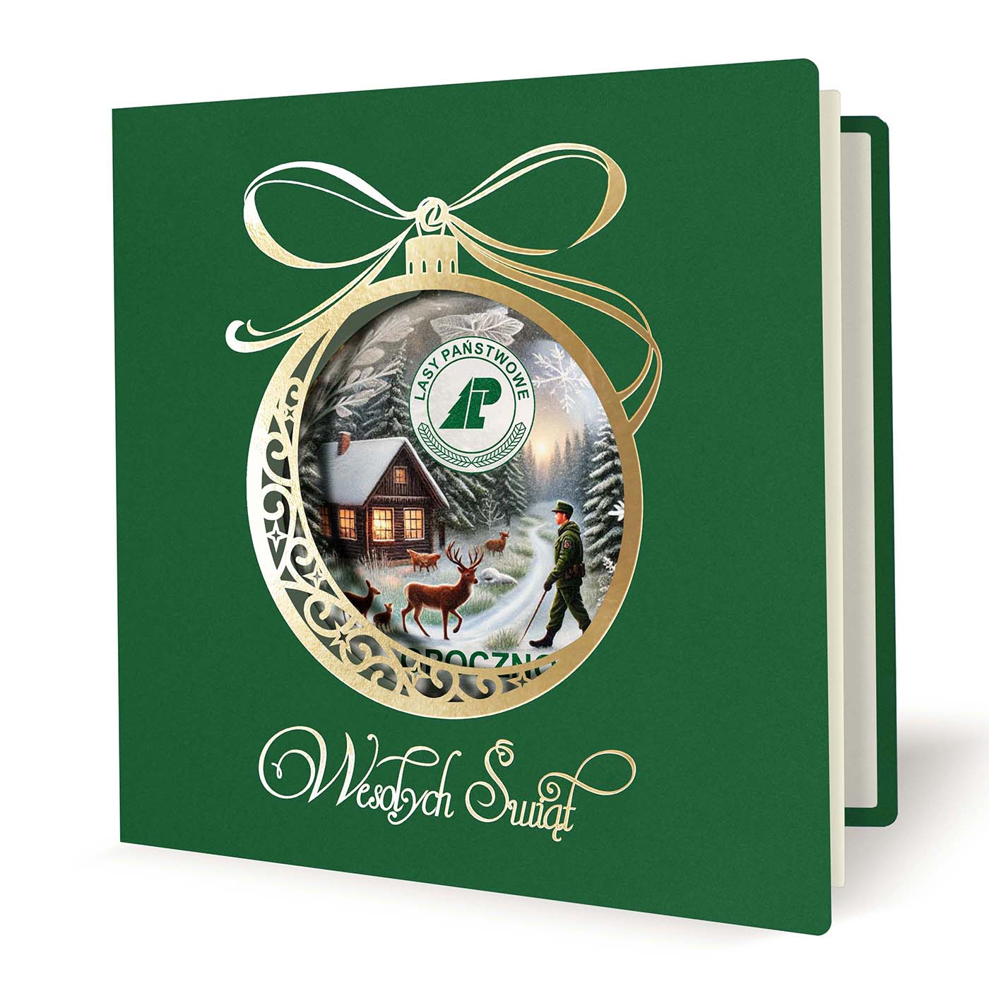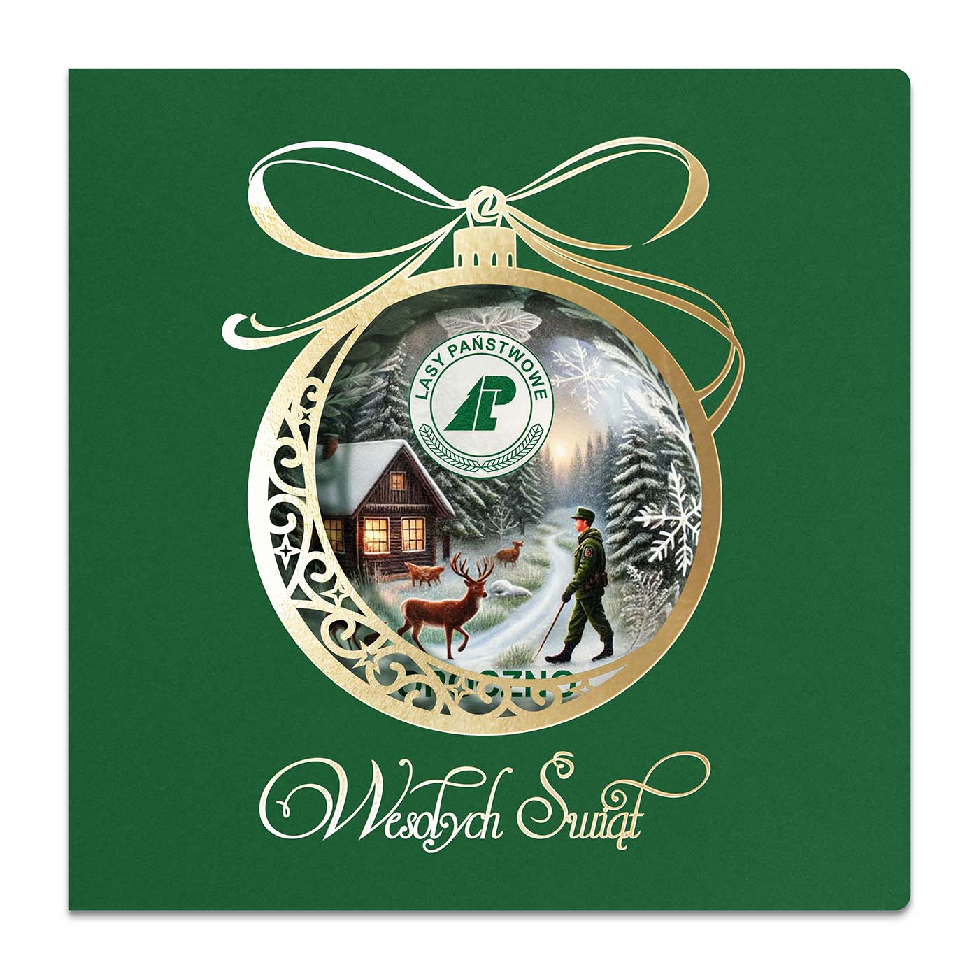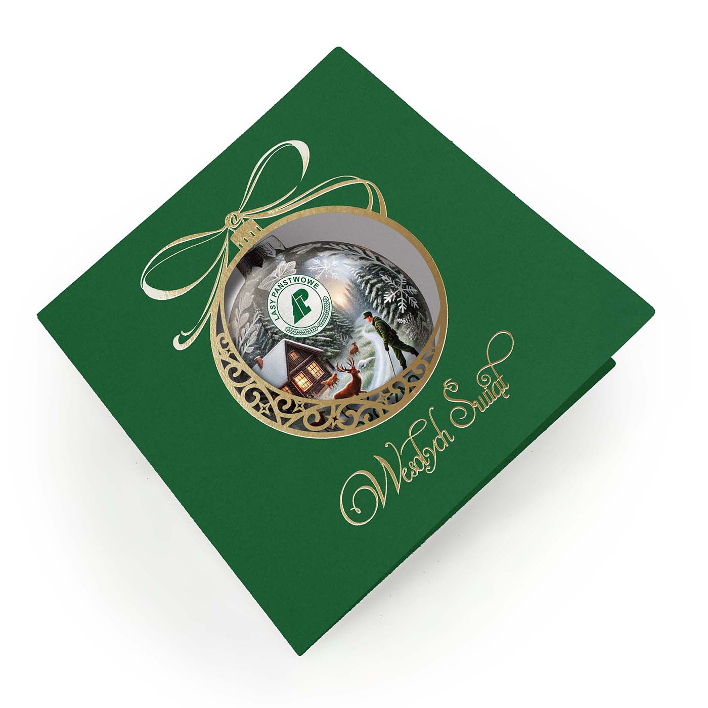 Ekskluzywna kartka świąteczna o unikalnym charakterze, wykonana z wysokiej jakości papieru w eleganckim zielonym kolorze. Centralnym elementem jest precyzyjnie wycięta laserowo bombka, ozdobiona złoconymi detalami i napisem Wesołych Świąt. Wewnątrz bombki znajduje się grafika przygotowana na indywidualne zamówienie - może to być Twoje logo, herb miasta, budynek firmy, maszyna z branży budowlanej czy produkt, który chcesz wypromować w świątecznym klimacie.