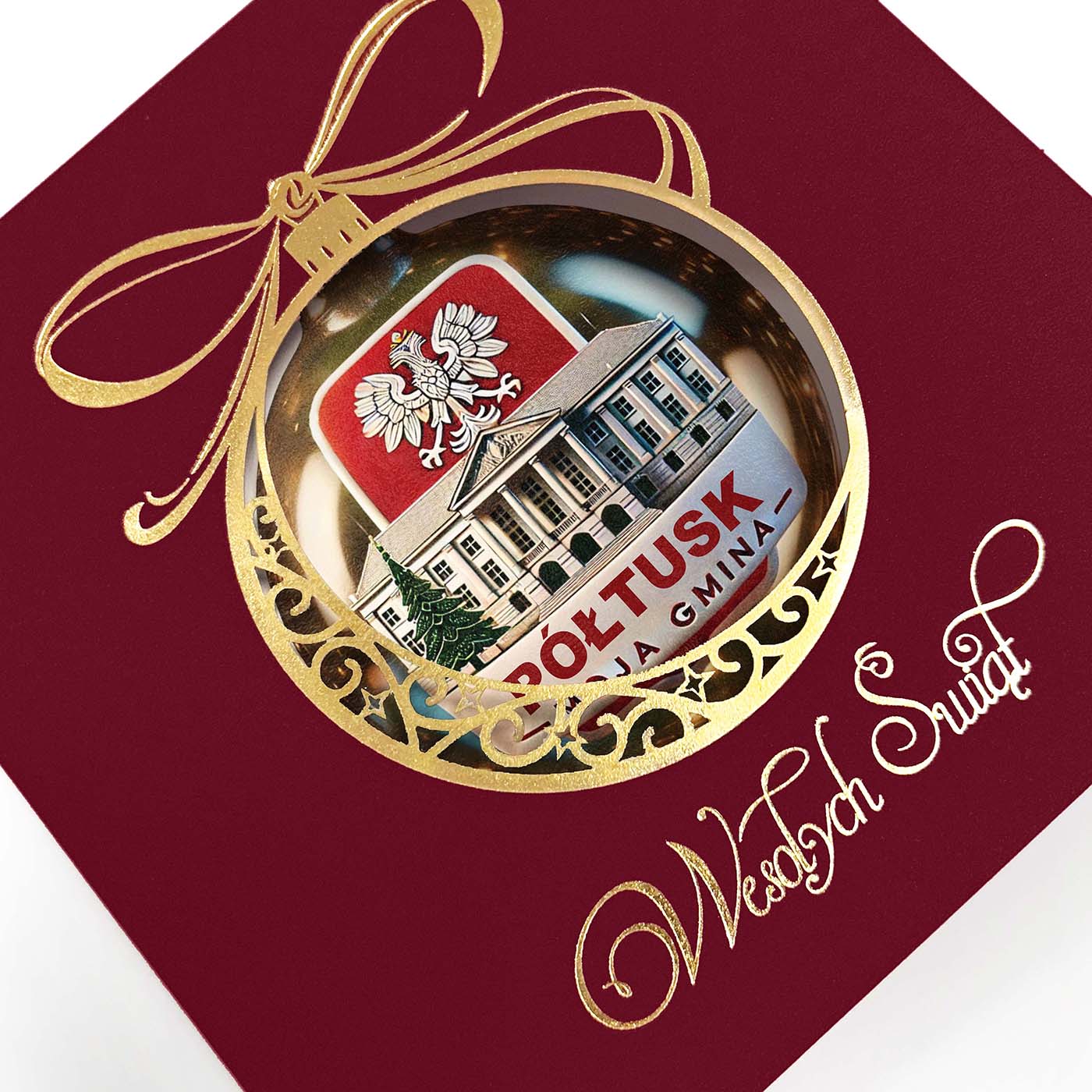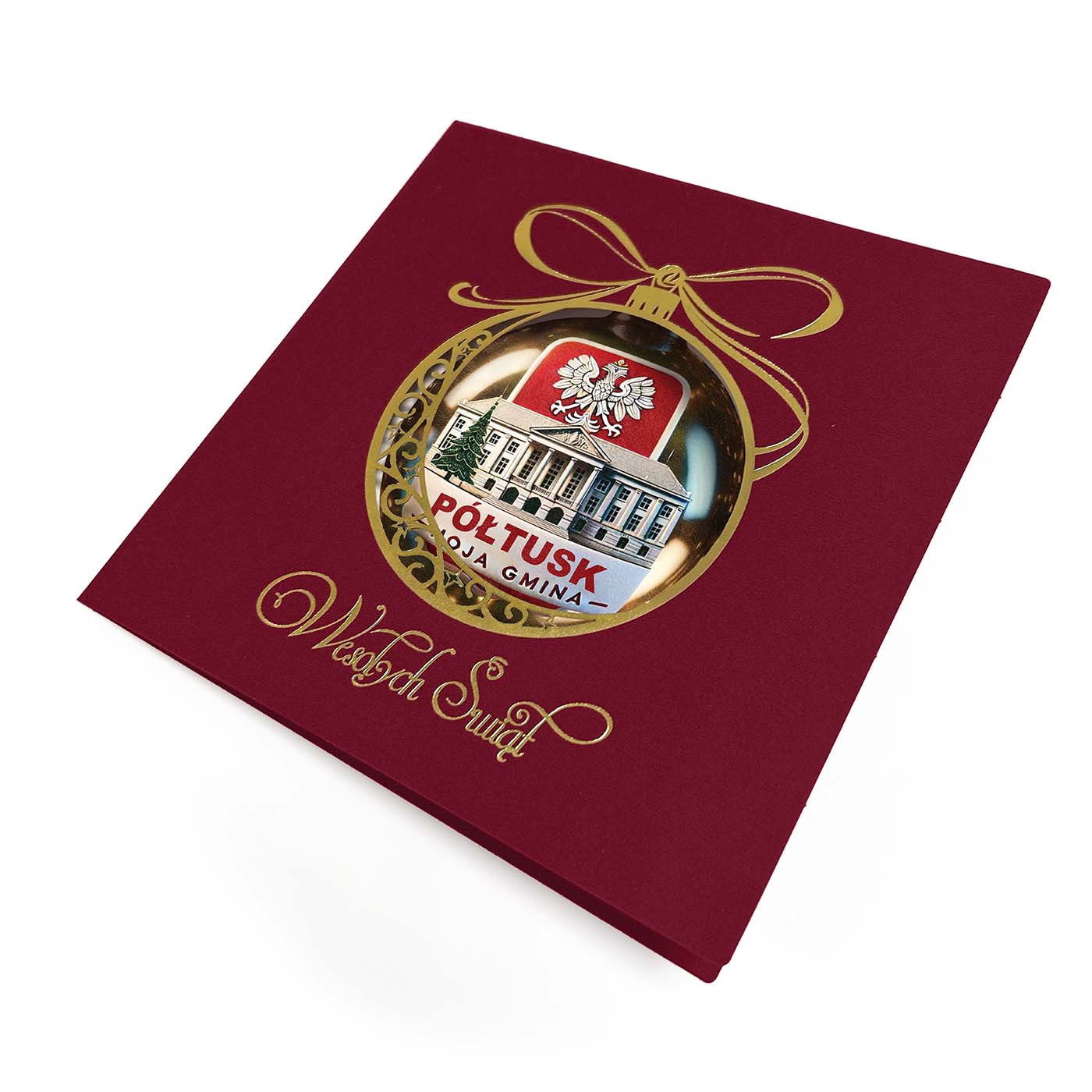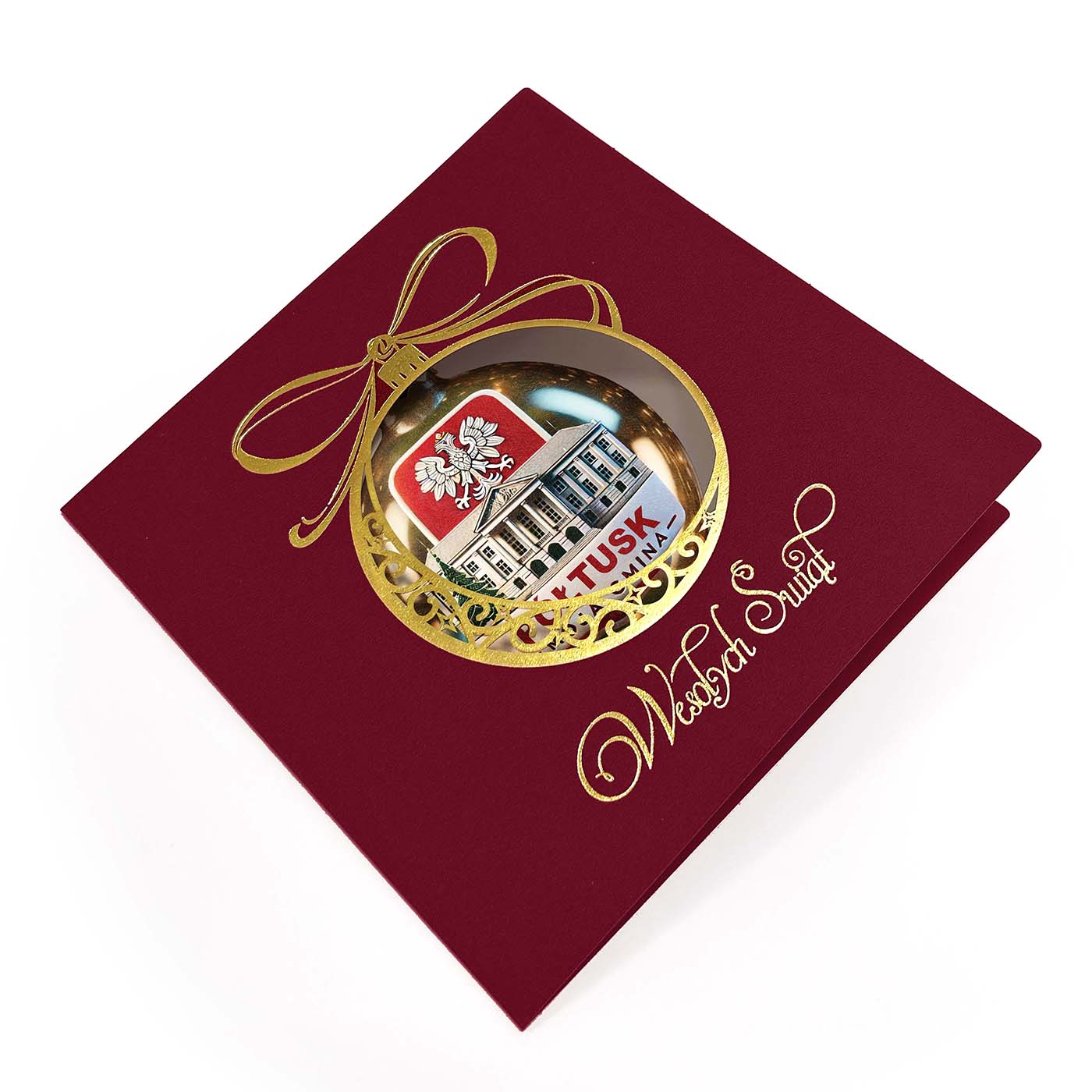 Ekskluzywna kartka świąteczna o unikalnym charakterze, wykonana z wysokiej jakości papieru w eleganckim bordowym kolorze. Centralnym elementem jest precyzyjnie wycięta laserowo bombka, ozdobiona złoconymi detalami i napisem Wesołych Świąt. Wewnątrz bombki znajduje się grafika przygotowana na indywidualne zamówienie - może to być Twoje logo, herb miasta, budynek firmy, maszyna z branży budowlanej czy produkt, który chcesz wypromować w świątecznym klimacie.