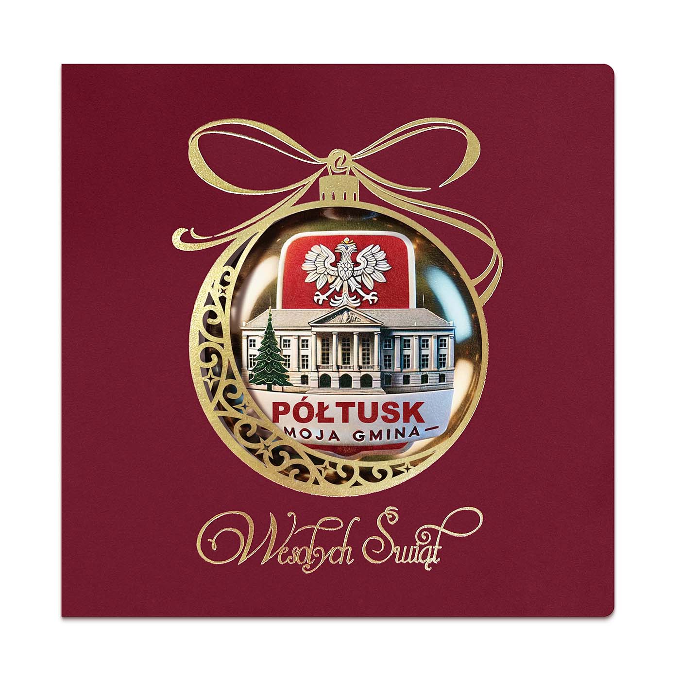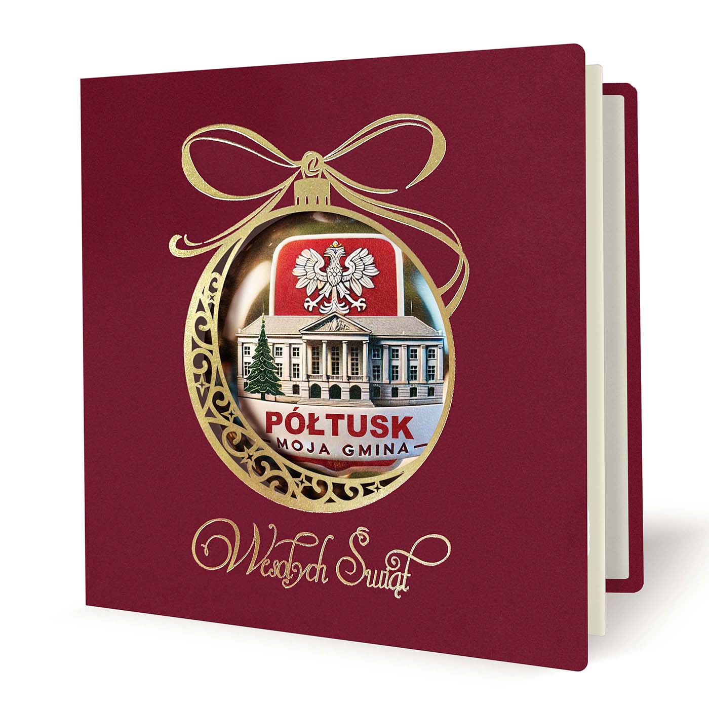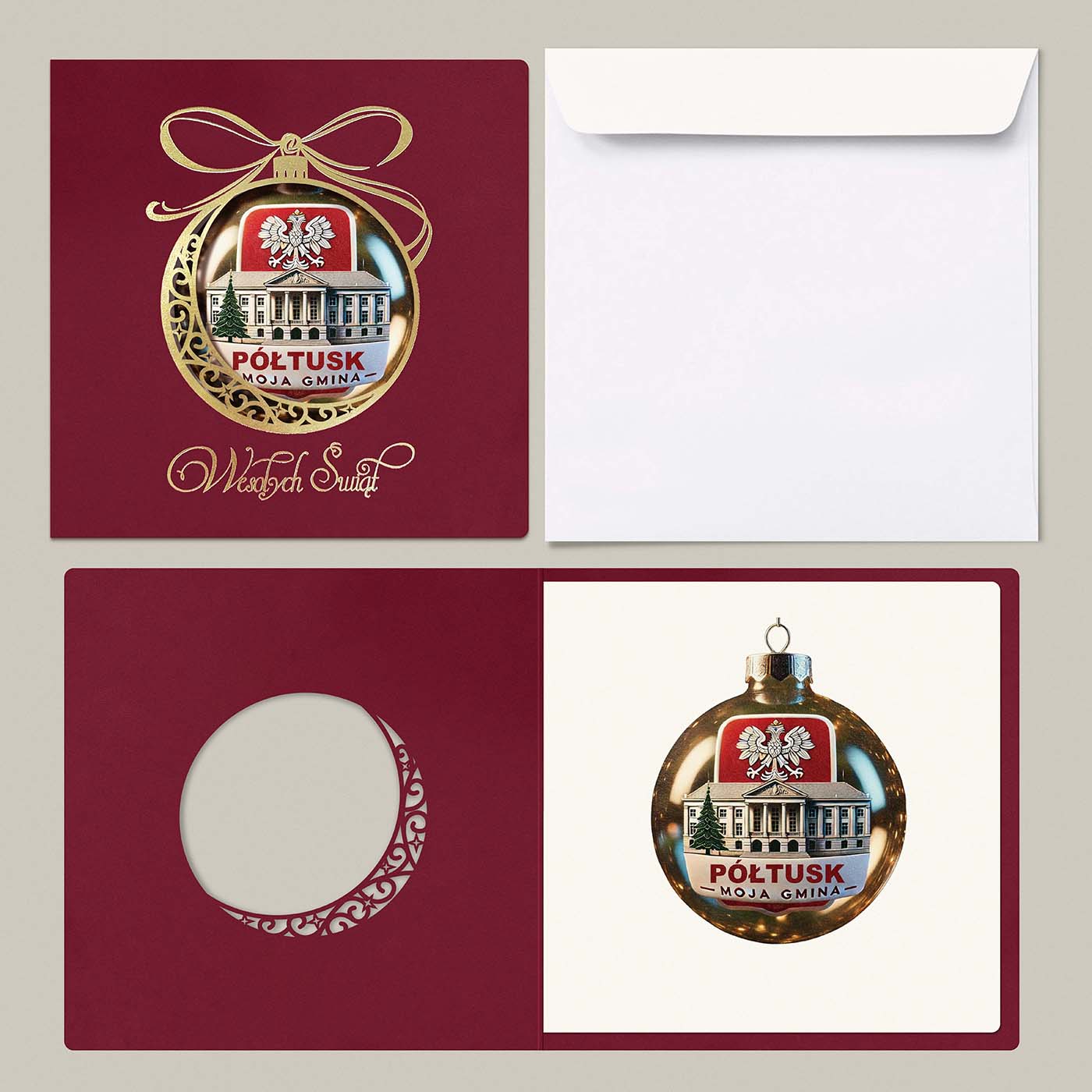 Ekskluzywna kartka świąteczna o unikalnym charakterze, wykonana z wysokiej jakości papieru w eleganckim bordowym kolorze. Centralnym elementem jest precyzyjnie wycięta laserowo bombka, ozdobiona złoconymi detalami i napisem Wesołych Świąt. Wewnątrz bombki znajduje się grafika przygotowana na indywidualne zamówienie - może to być Twoje logo, herb miasta, budynek firmy, maszyna z branży budowlanej czy produkt, który chcesz wypromować w świątecznym klimacie.