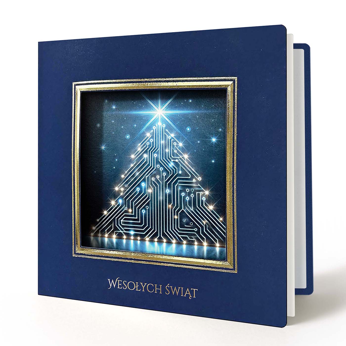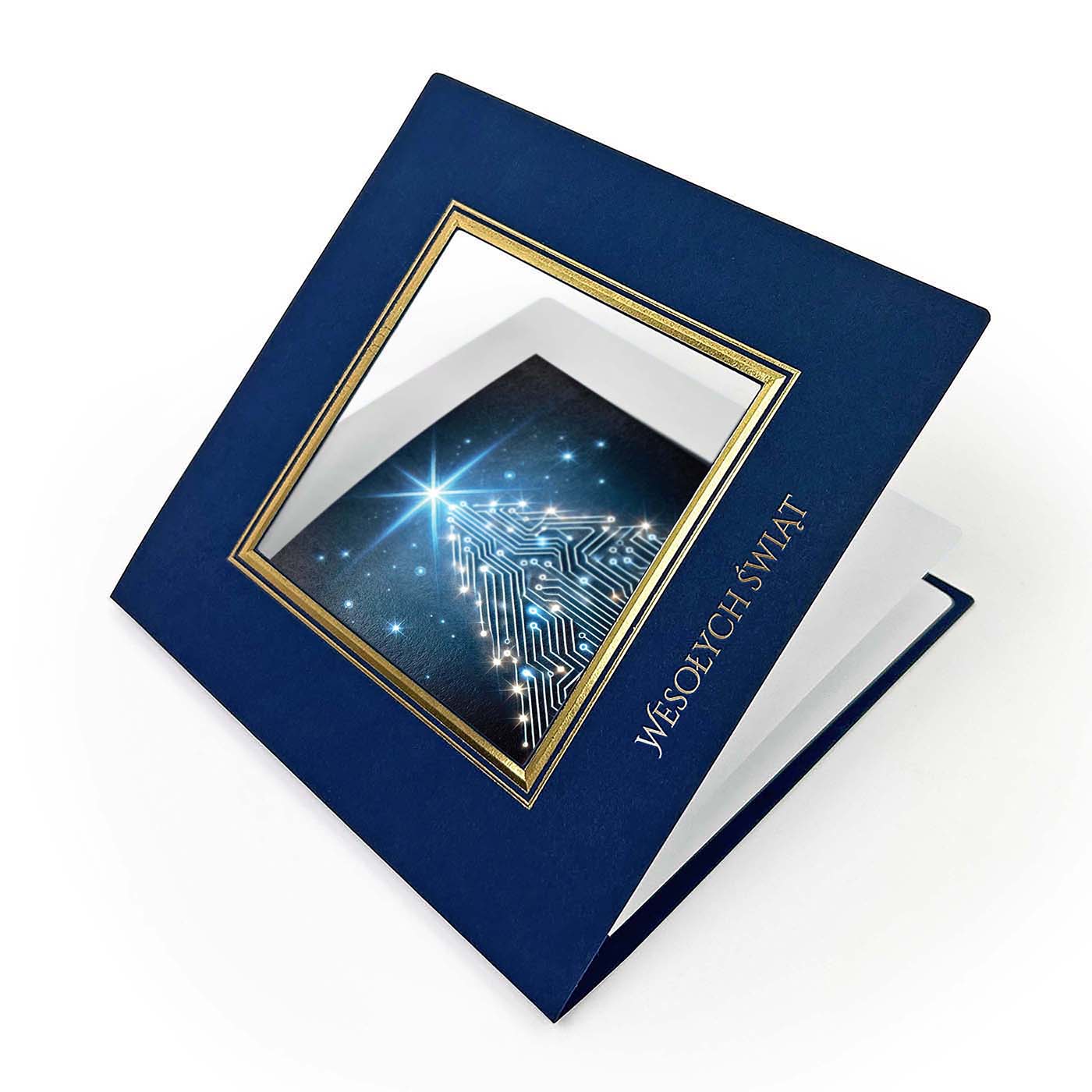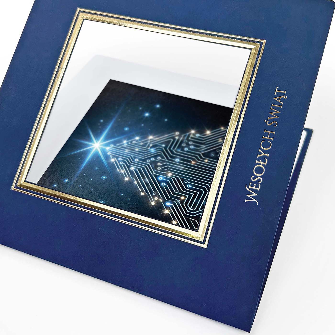 Okładka posiada kwadratowy otwór ze złoconą i tłoczoną ramką wokół, a wewnątrz umieszczona jest grafika zaprojektowana na indywidualne zamówienie - może to być Twoje logo, herb miasta, budynek firmy, maszyna z branży budowlanej czy produkt, który chcesz zaprezentować w świątecznym klimacie.