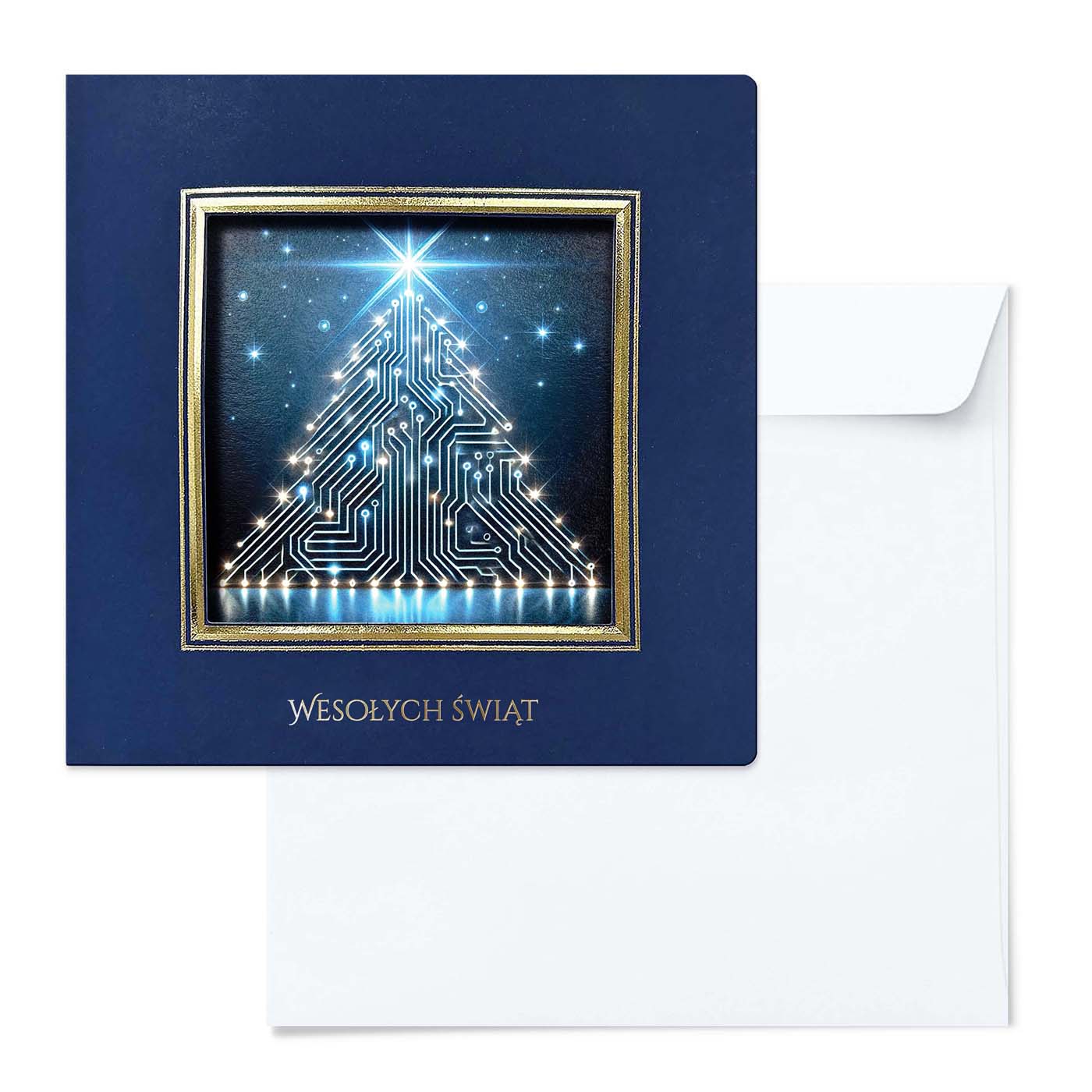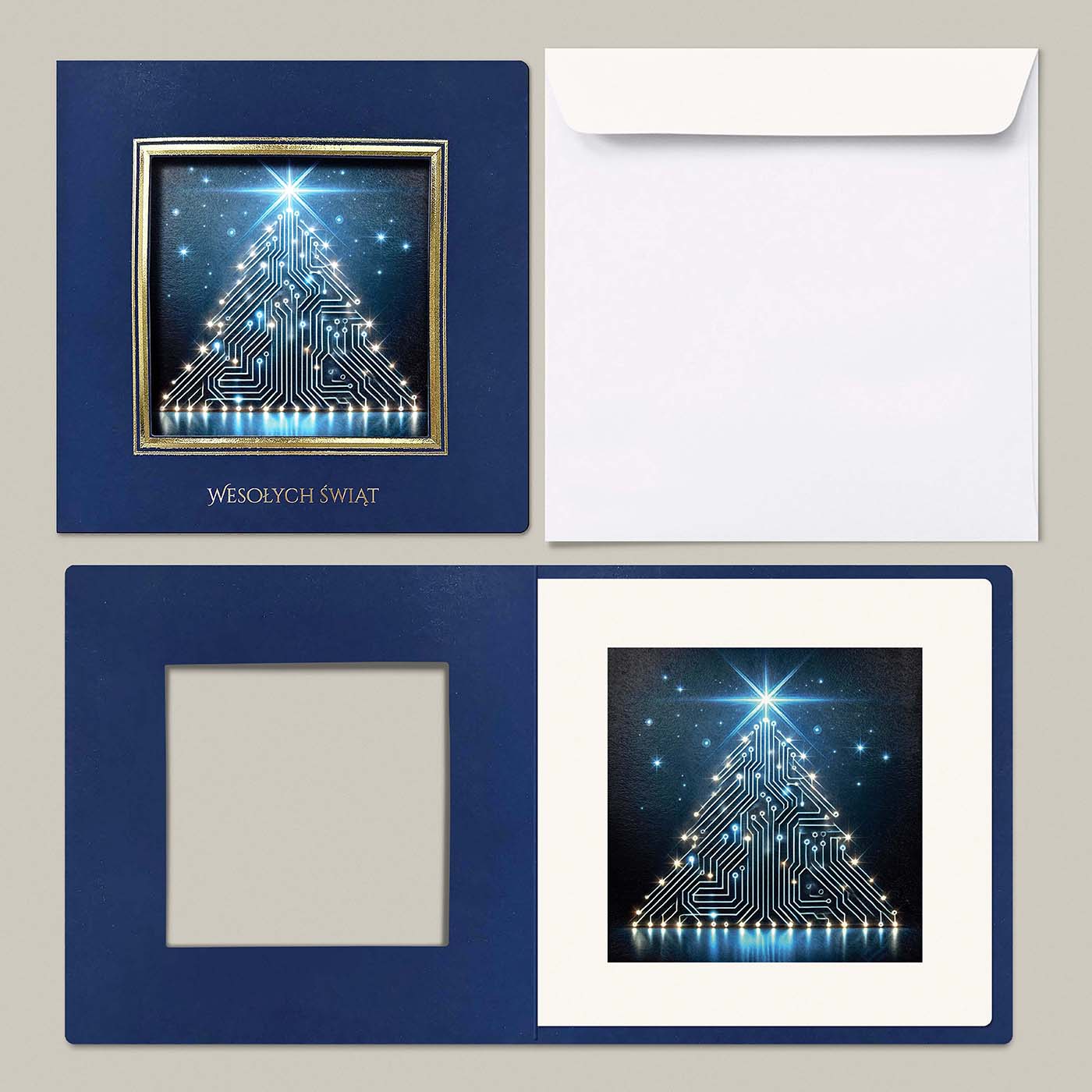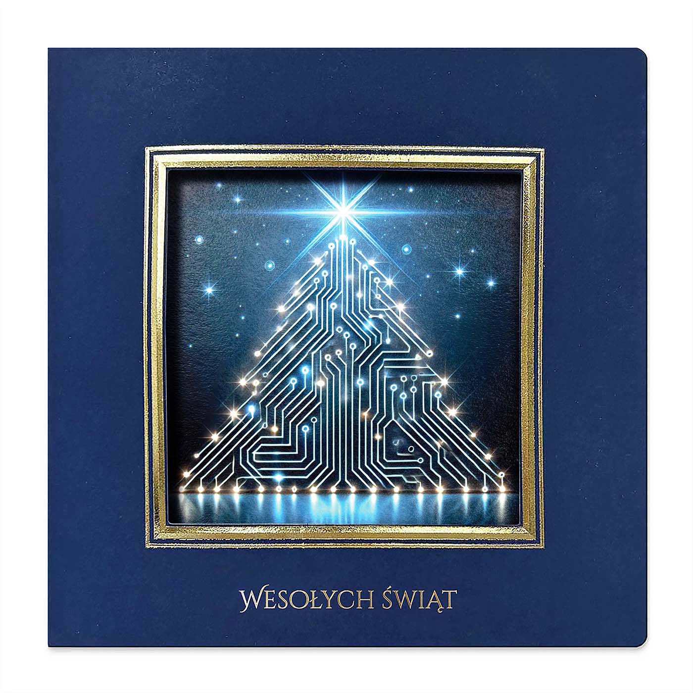 Okładka posiada kwadratowy otwór ze złoconą i tłoczoną ramką wokół, a wewnątrz umieszczona jest grafika zaprojektowana na indywidualne zamówienie - może to być Twoje logo, herb miasta, budynek firmy, maszyna z branży budowlanej czy produkt, który chcesz zaprezentować w świątecznym klimacie.