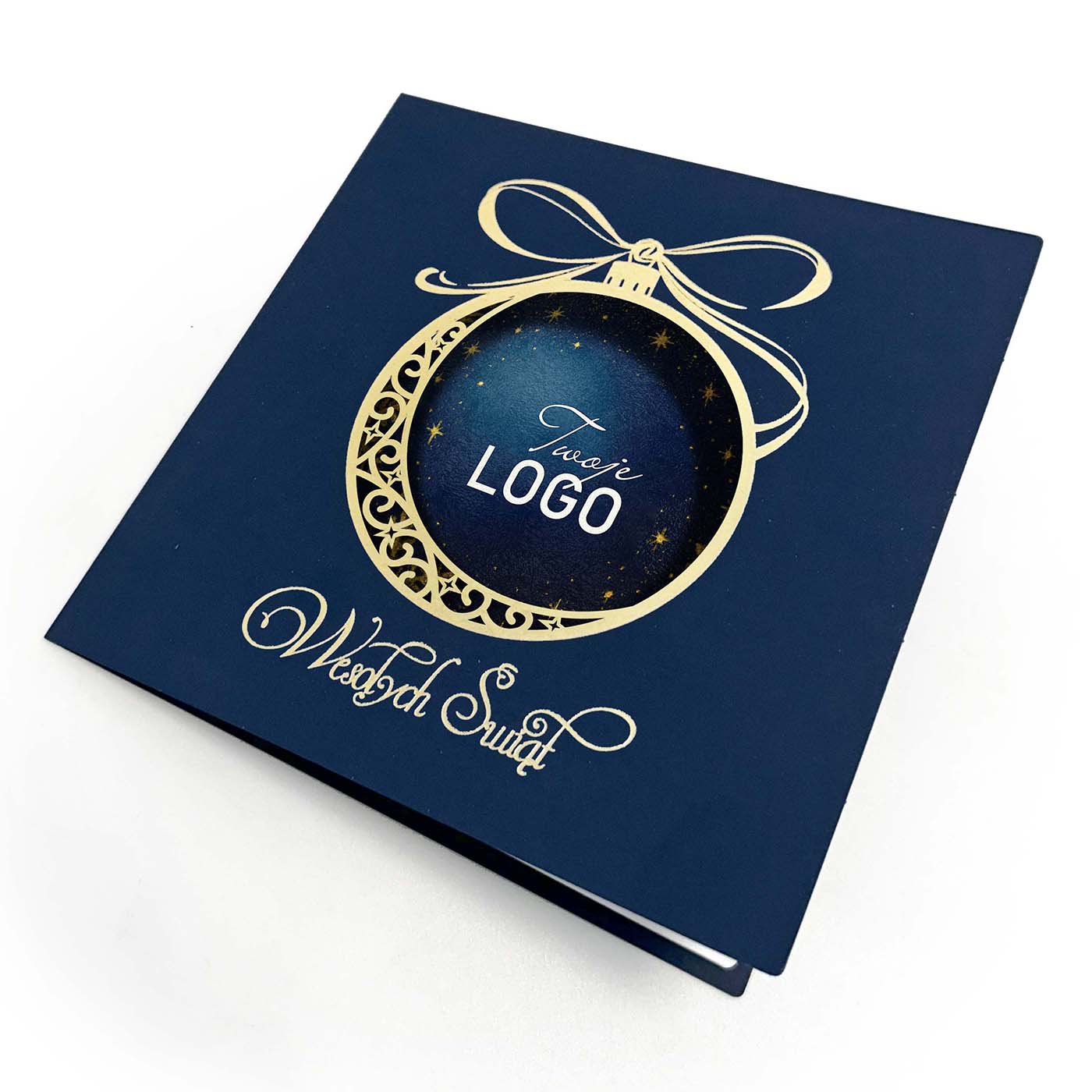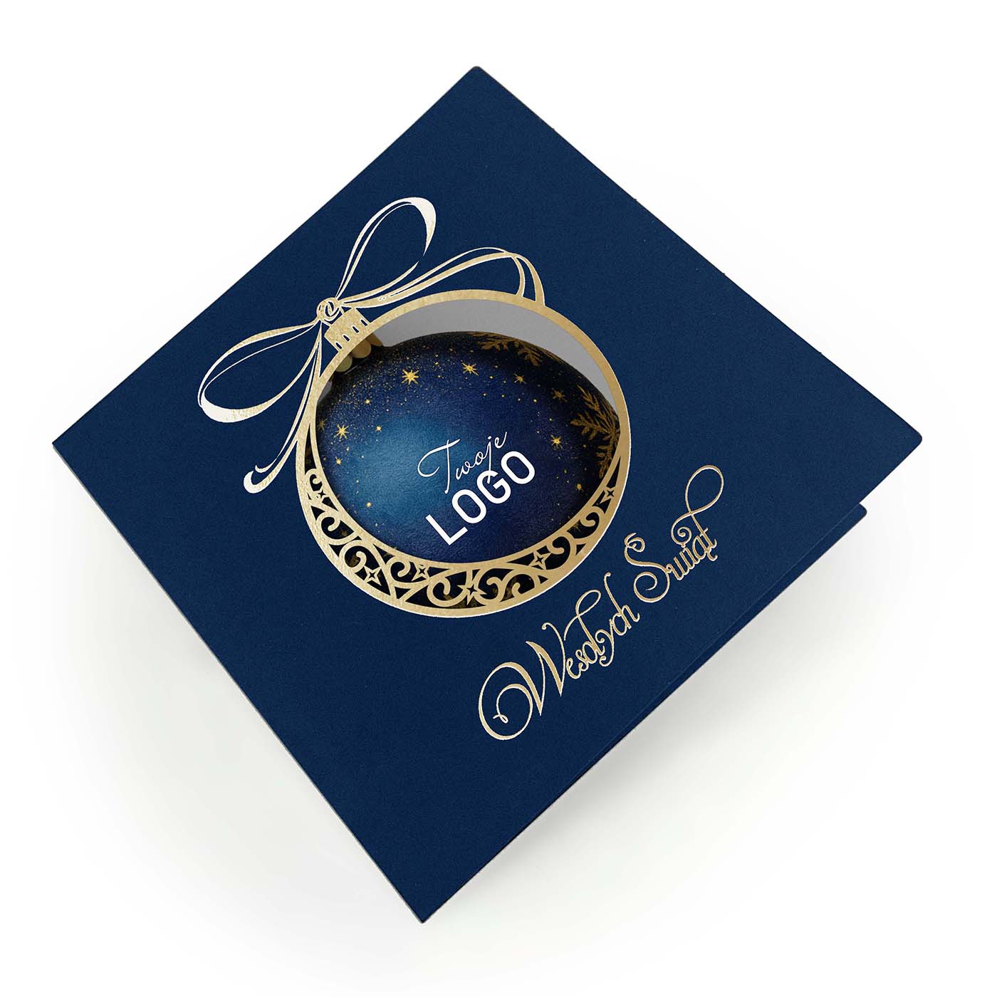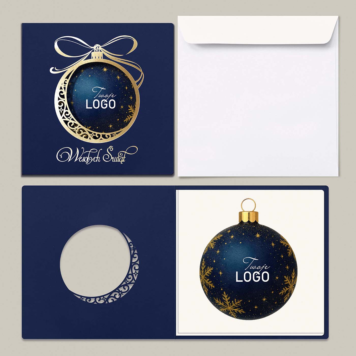 Kartka wykonana z wysokiej jakości papieru ozdobnego barwionego w masie. Na okładce znajduje się elegancki motyw bombki wyciętej w kształcie koła, otoczonej złoconą ramką z delikatnym, dekoracyjnym wzorem oraz kokardą. W centralnym punkcie miejsce do umieszczenia logo firmy.