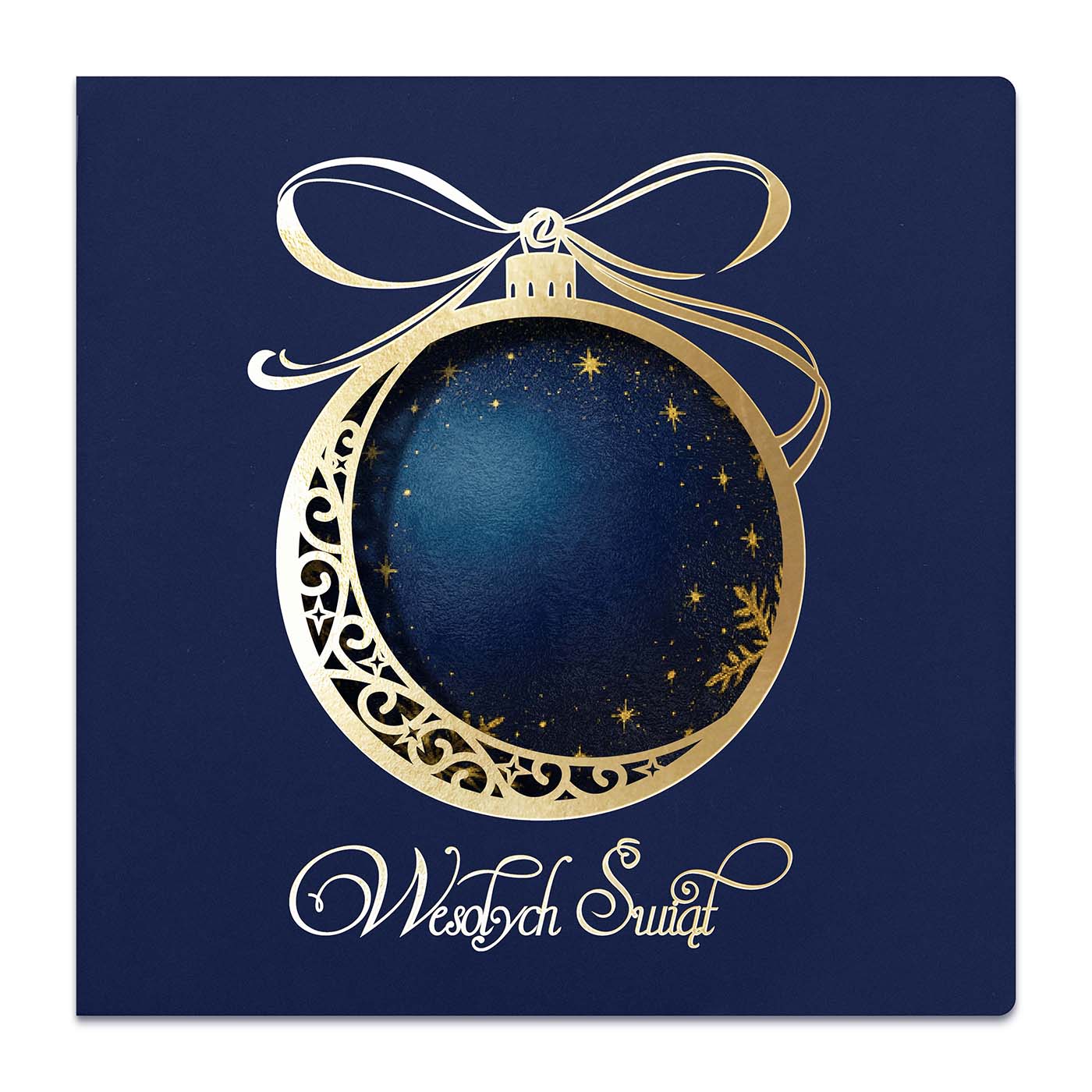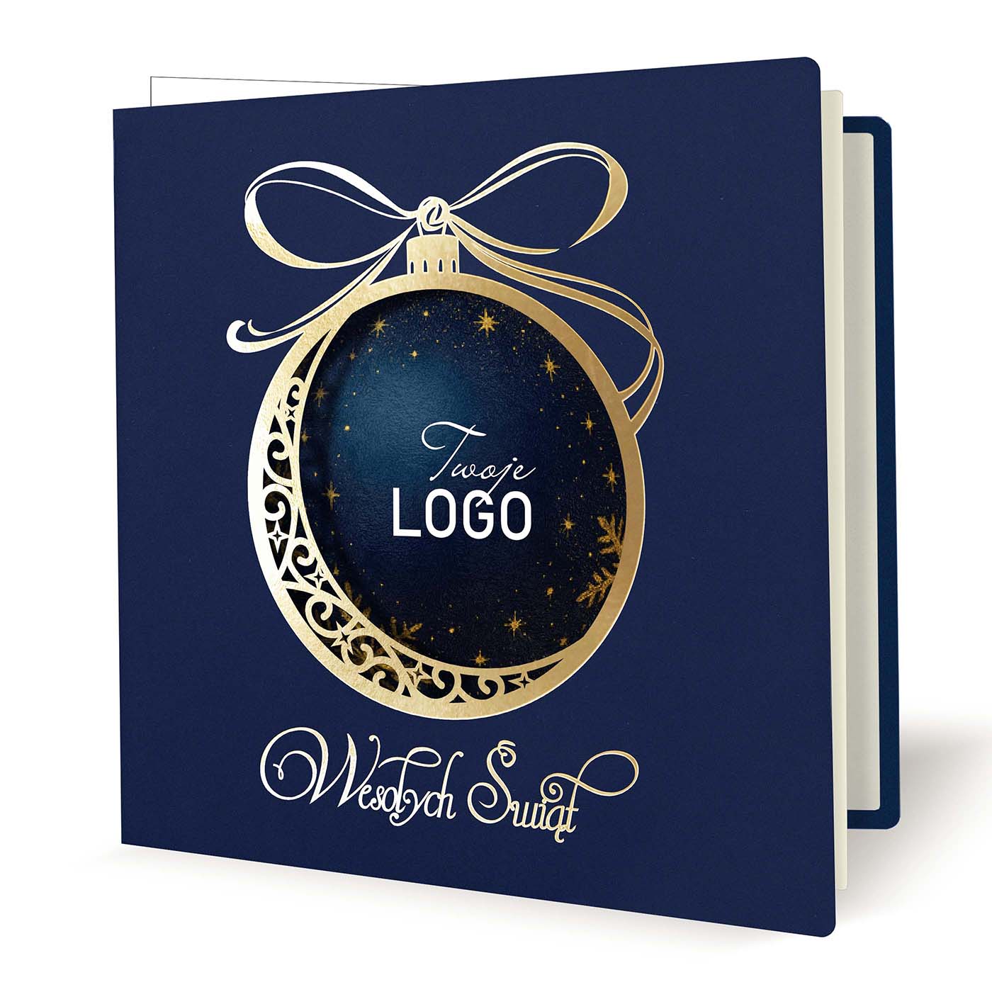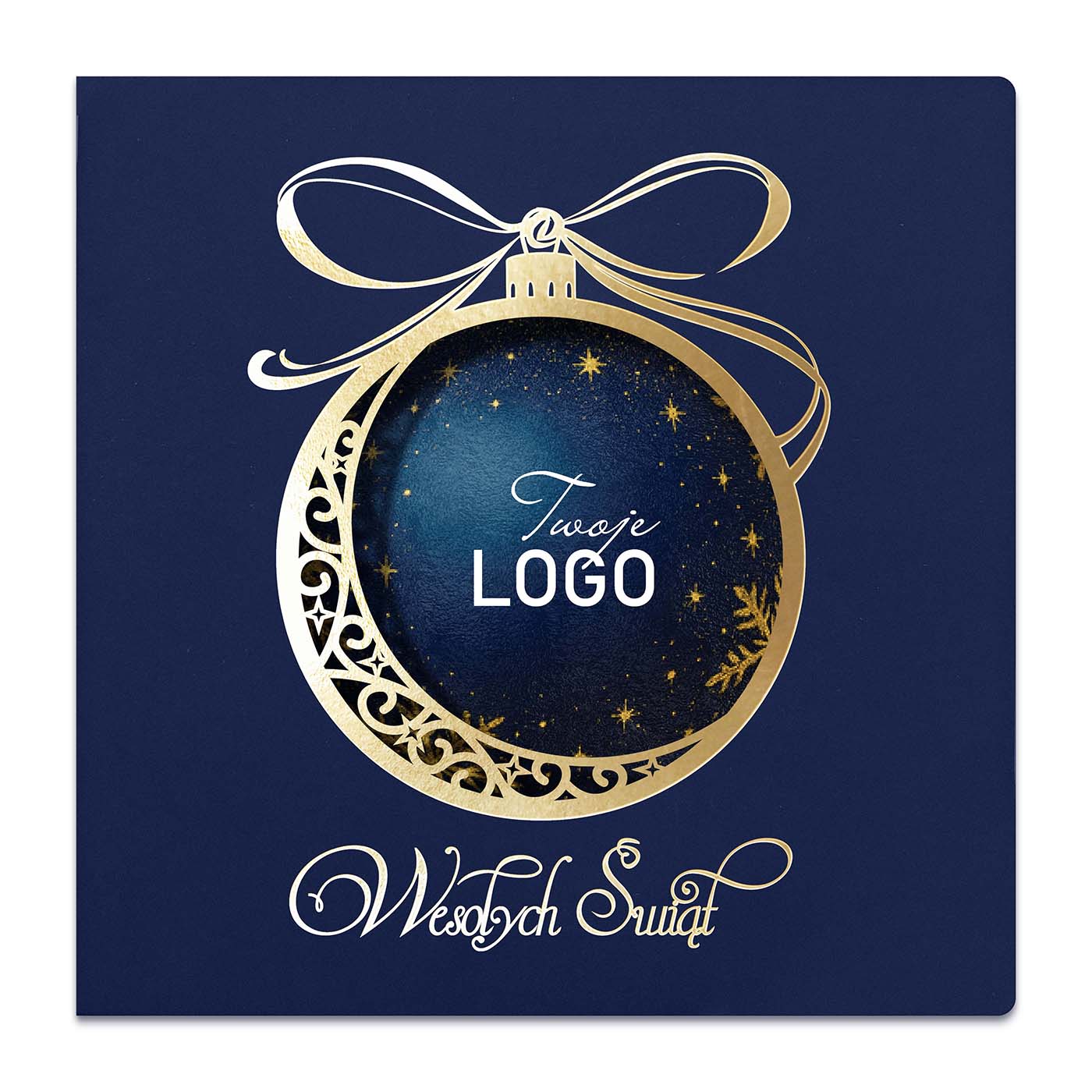 Kartka wykonana z wysokiej jakości papieru ozdobnego barwionego w masie. Na okładce znajduje się elegancki motyw bombki wyciętej w kształcie koła, otoczonej złoconą ramką z delikatnym, dekoracyjnym wzorem oraz kokardą. W centralnym punkcie miejsce do umieszczenia logo firmy.