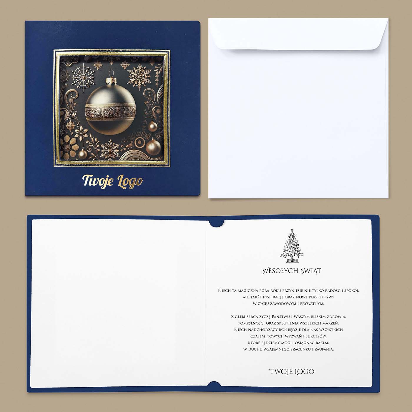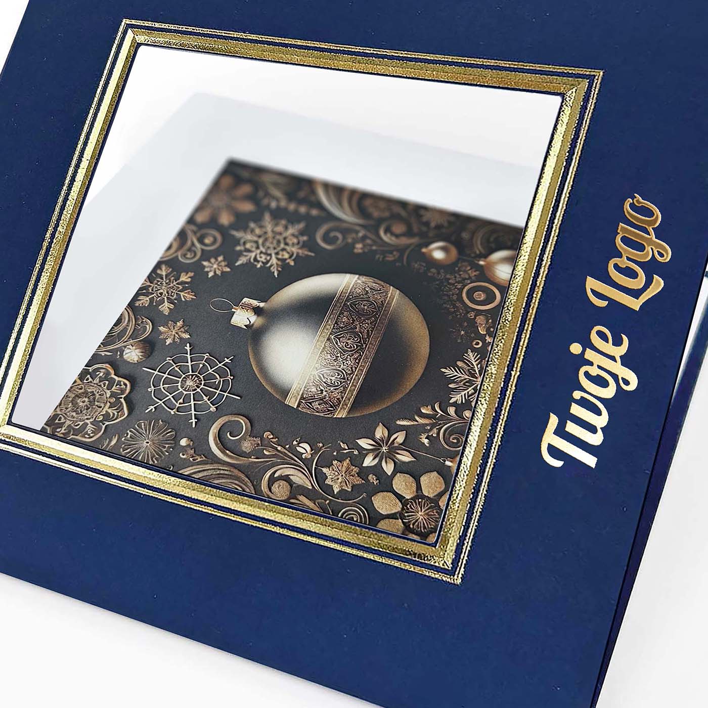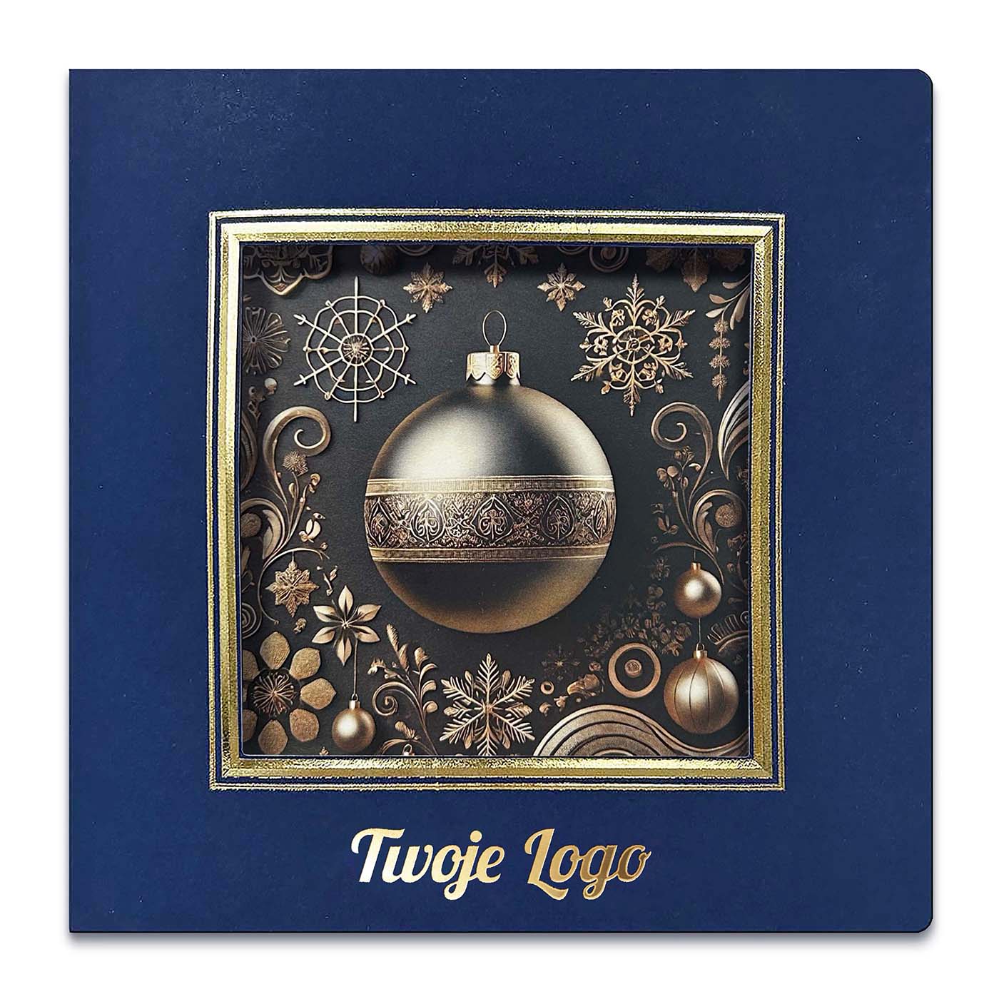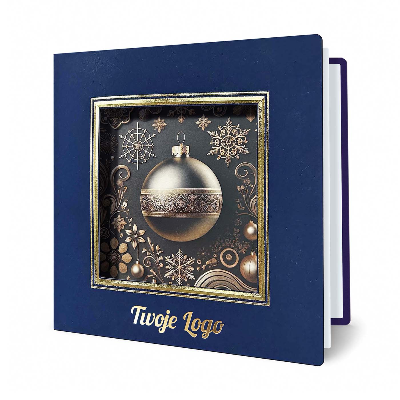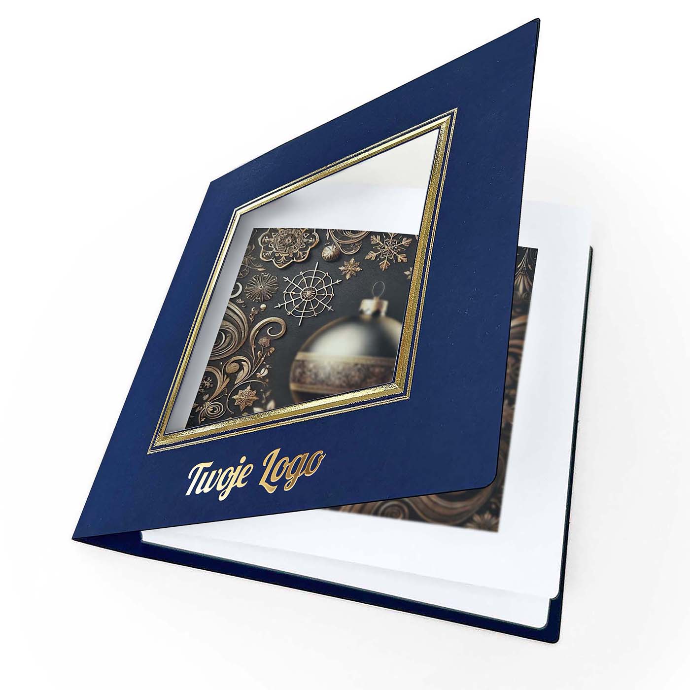 Trójwymiarowa ramka otaczająca grafikę została dodatkowo uszlachetniona tłoczeniem i złoceniem. Wnętrze kartki zawiera białą, matową wkładkę umożliwiającą personalizację tekstu życzeń i nadruk logotypu. Na życzenie Klienta istnieje możliwość zamiany grafiki - oferujemy projekt dopasowany do Państwa potrzeb lub możliwość użycia własnej ilustracji.