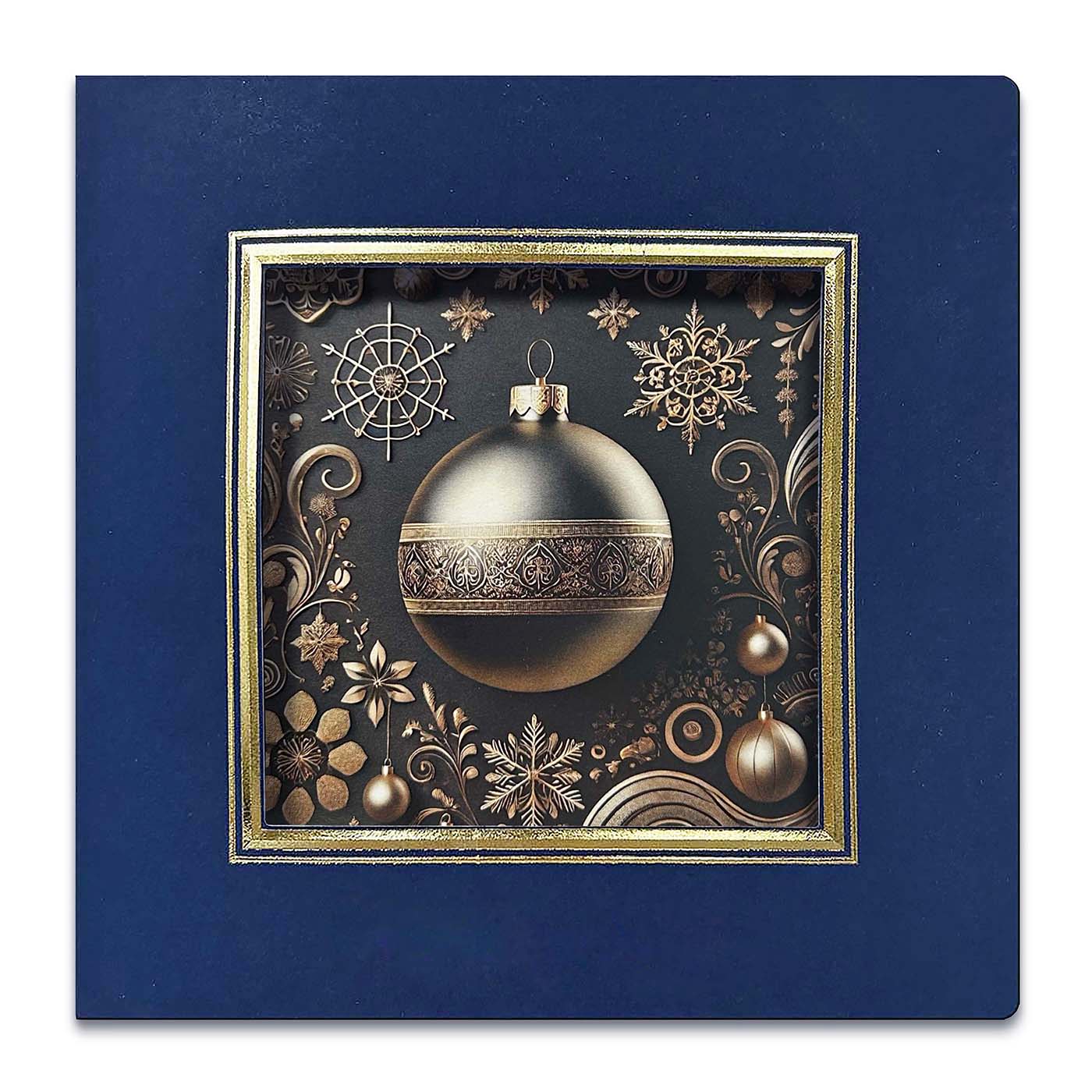 Nowoczesna kartka świąteczna wykonana z matowego, ozdobnego papieru barwionego w masie w głębokim odcieniu granatu. Na okładce znajduje się wyjątkowa kompozycja - ozdobnej bombki, która doskonale wpisuje się w estetykę współczesnych projektów świątecznych.