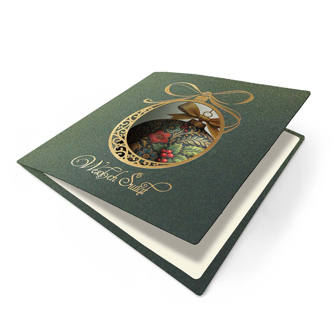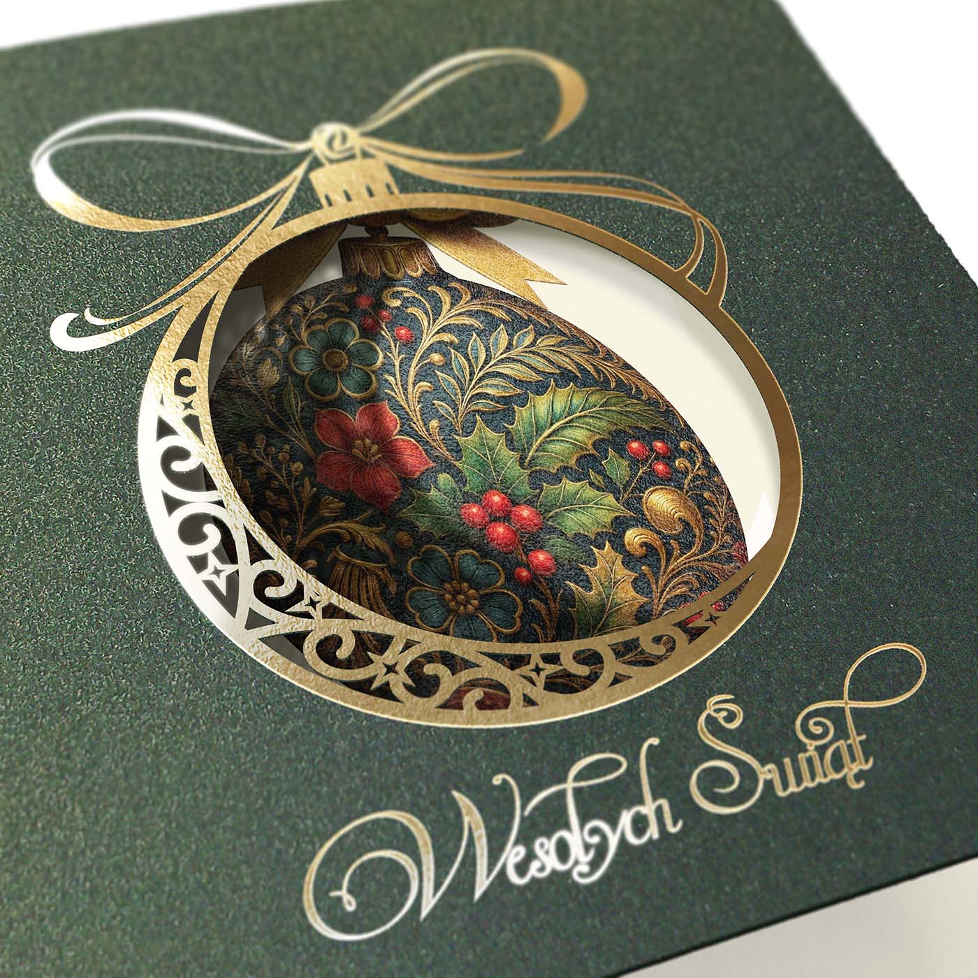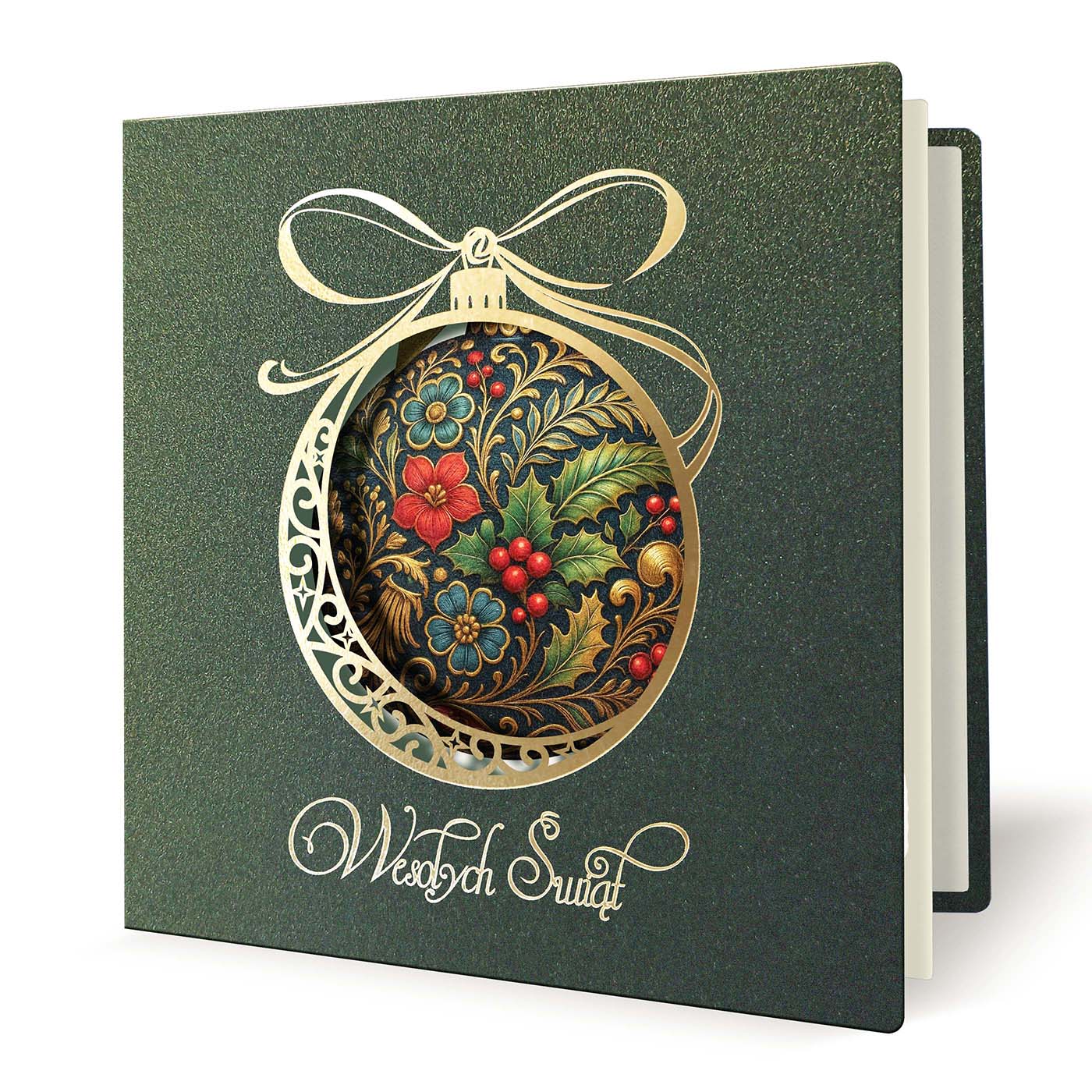 Ekskluzywna kartka świąteczna wykonana z wysokiej jakości papieru metalizowanego w eleganckim, głębokim zielonym odcieniu. Okładkę zdobi precyzyjnie wycięty laserowo motyw bombki, ozdobiony prawdziwym złoceniem. Wewnątrz bombki umieszczono bogaty, dekoracyjny wzór z motywem liści ostrokrzewu, czerwonych jagód i złoconych detali - w stylu klasycznego ornamentu. Całość dopełnia złocony napis Wesołych Świąt.