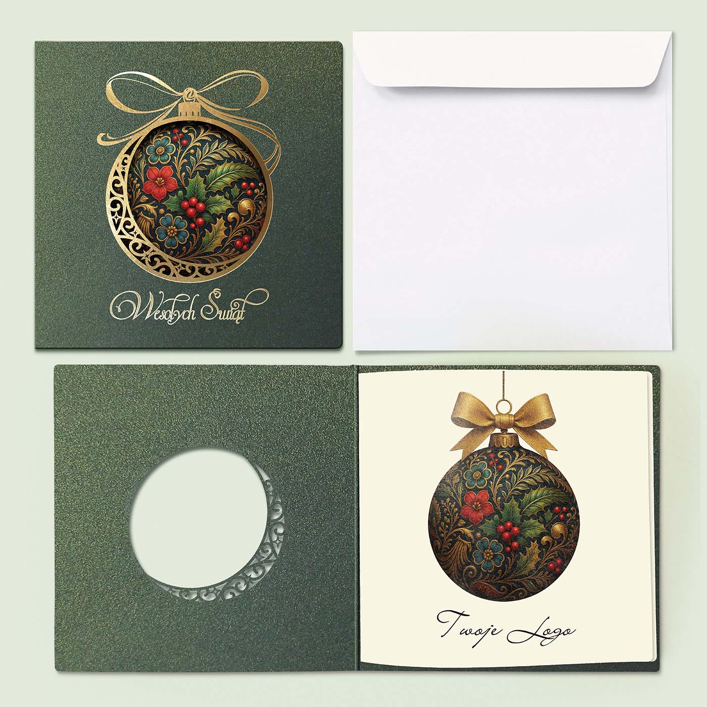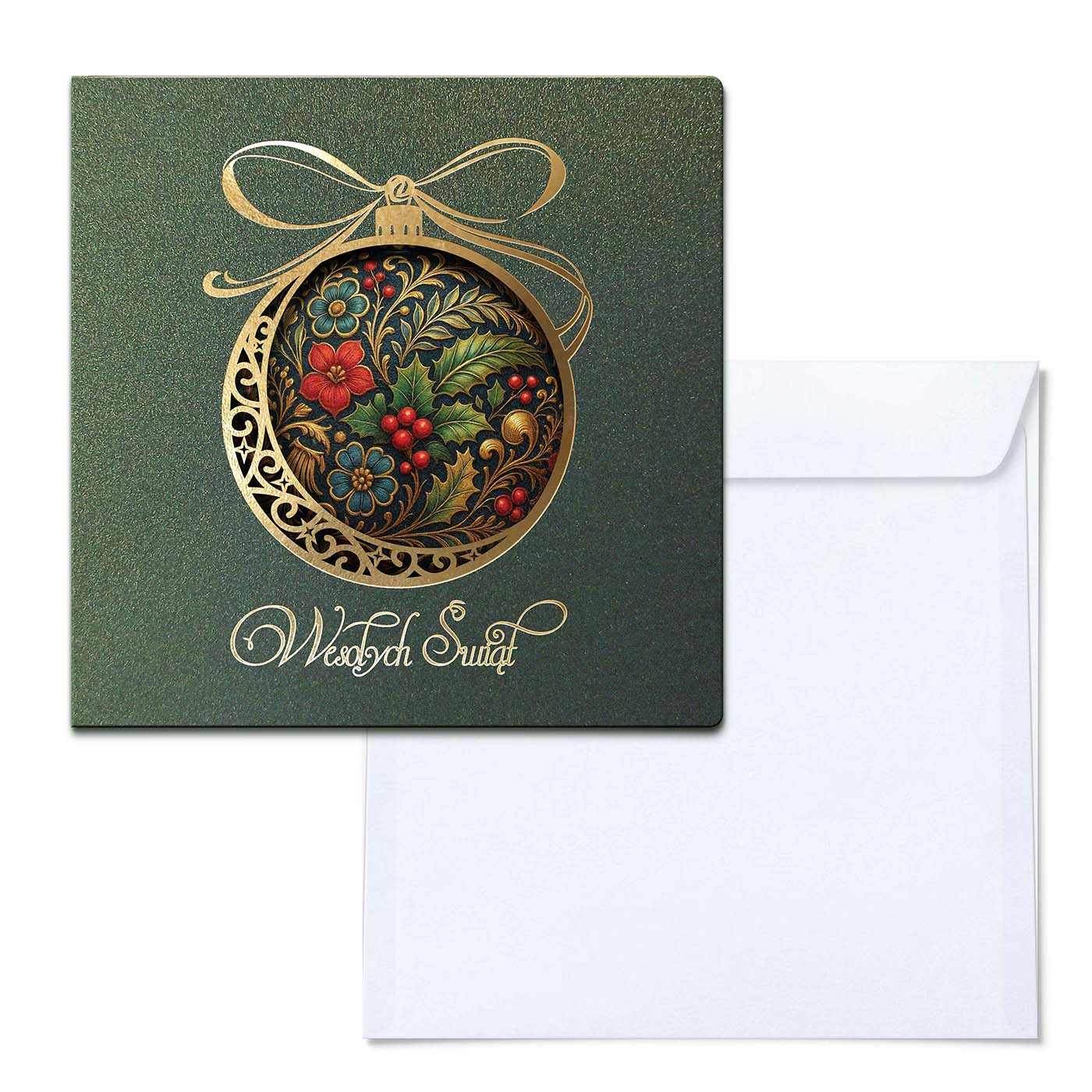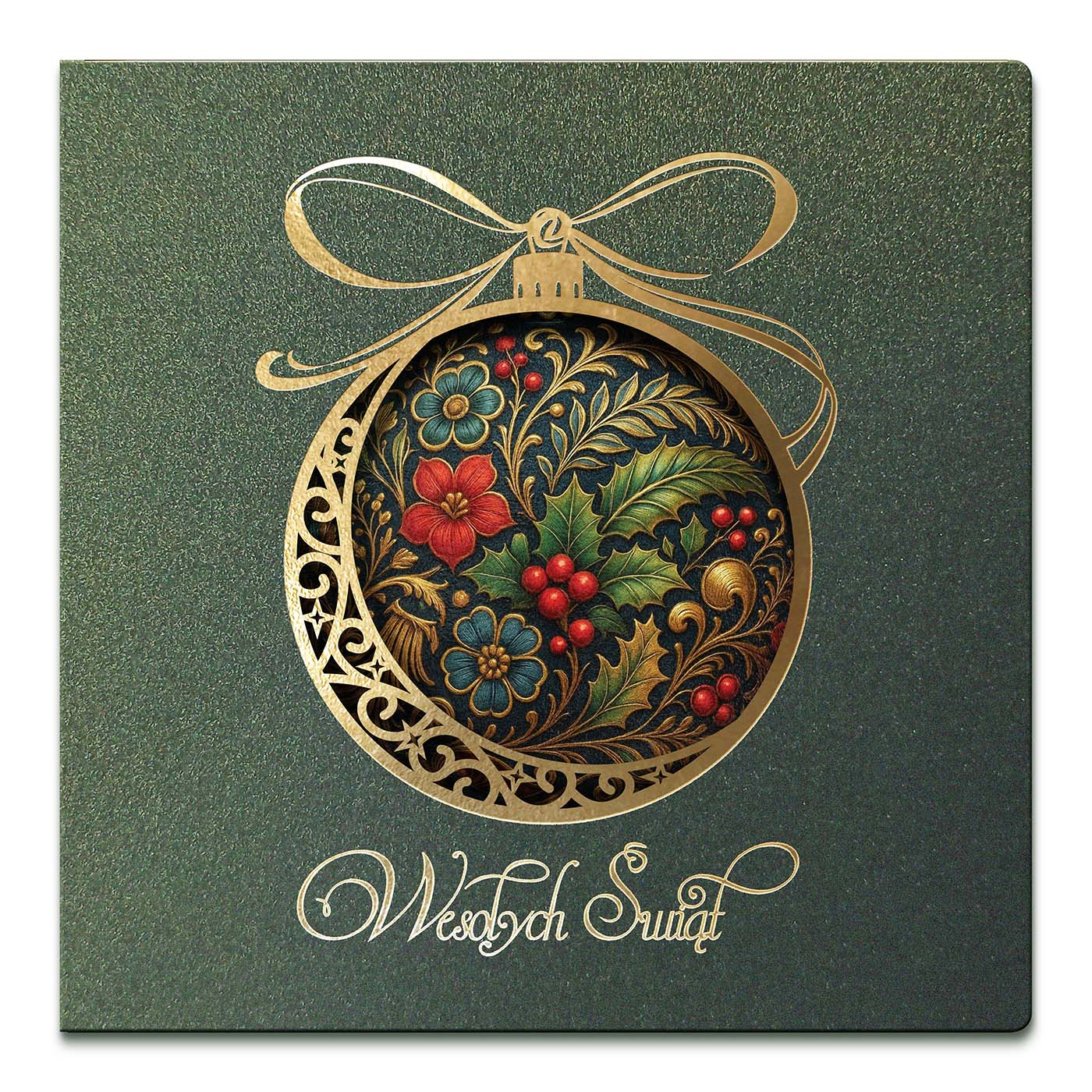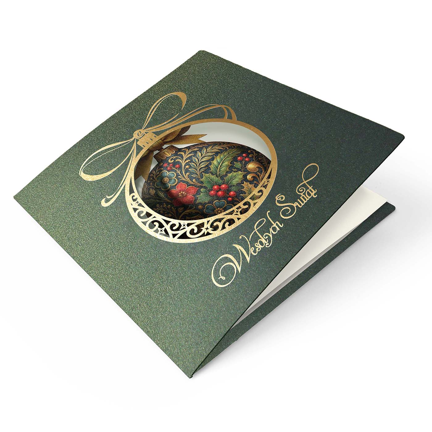 Ekskluzywna kartka świąteczna wykonana z wysokiej jakości papieru metalizowanego w eleganckim, głębokim zielonym odcieniu. Okładkę zdobi precyzyjnie wycięty laserowo motyw bombki, ozdobiony prawdziwym złoceniem. Wewnątrz bombki umieszczono bogaty, dekoracyjny wzór z motywem liści ostrokrzewu, czerwonych jagód i złoconych detali - w stylu klasycznego ornamentu. Całość dopełnia złocony napis Wesołych Świąt.